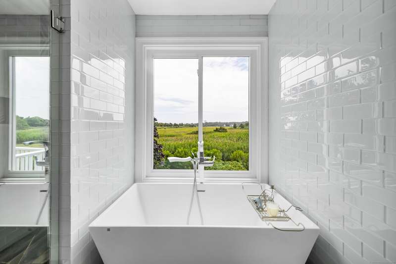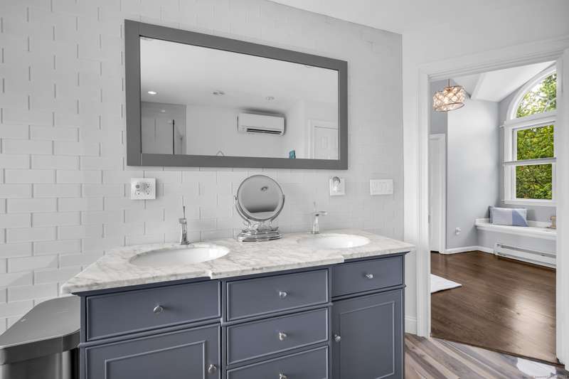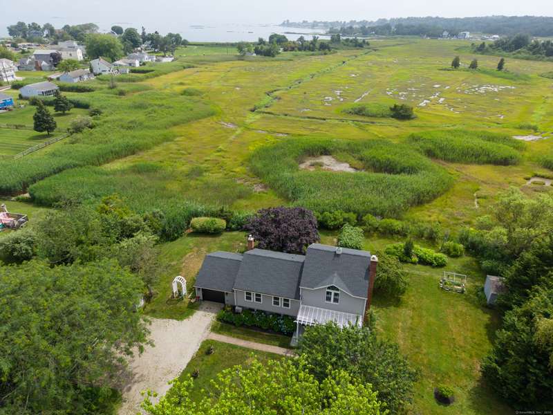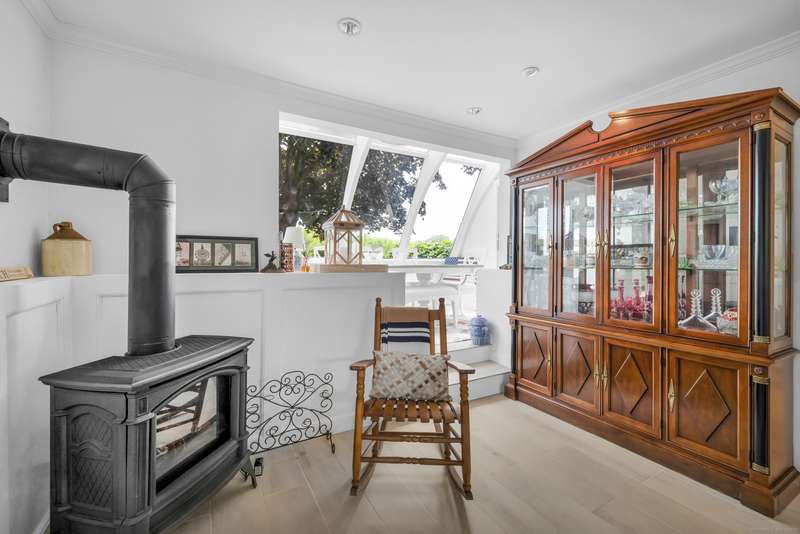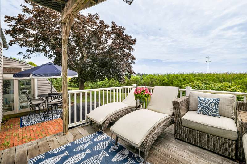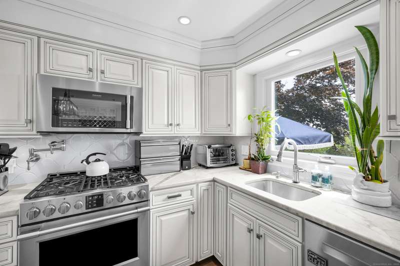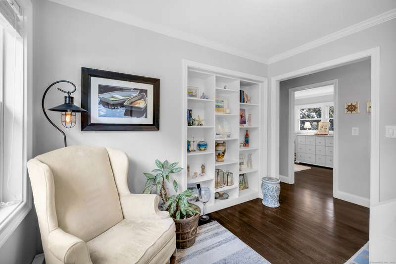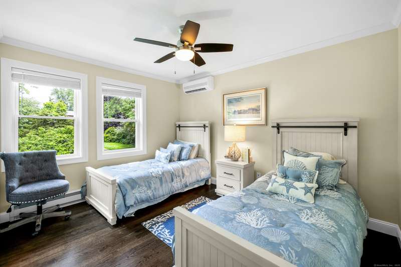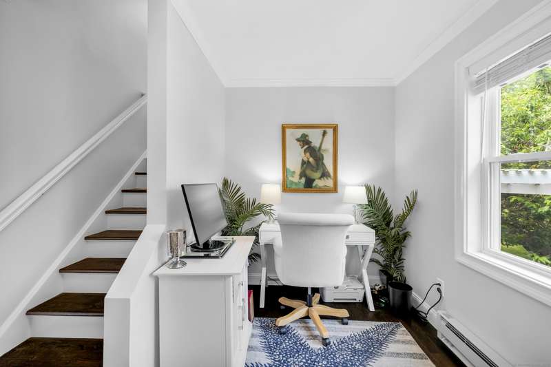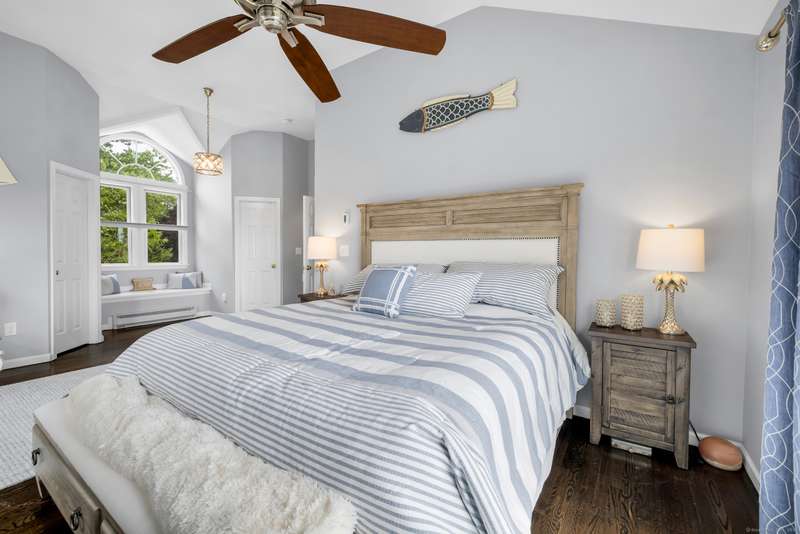 Truly exceptional turnkey property sits on a peaceful 1-acre lot along the desirable, sidewalk-lined Whitfield Street. This fully renovated and thoughtfully reimagined home offers light-filled living spaces, beautiful hardwood flooring, and crown molding throughout. Charming curb appeal welcomes you with an inviting front porch that leads into a living room with a gas fireplace. The open-concept layout flows seamlessly into a stunning kitchen, featuring custom cabinetry, a large center island, stainless steel appliances, and a breakfast/dry bar with wine fridge. The luxurious primary suite occupies the entire upper level and offers two walk-in closets with built-ins, a cathedral ceiling, private balcony with fabulous water views, and a spa-inspired bath complete with a soaking tub, walk-in shower with designer tile and glass enclosure, and a dual-sink vanity. The second floor offers two additional bedrooms, a beautifully remodeled full bath, and an open style office; perfect for remote