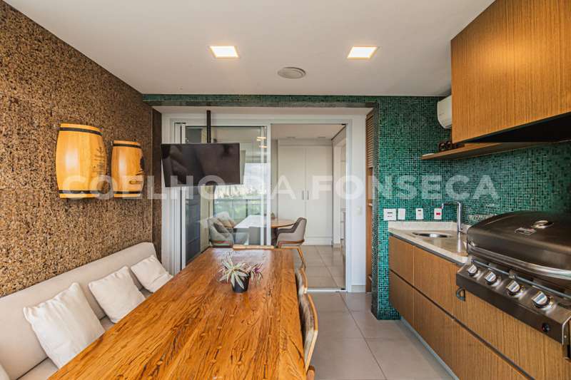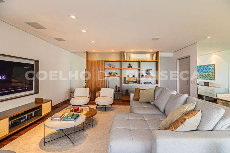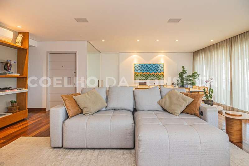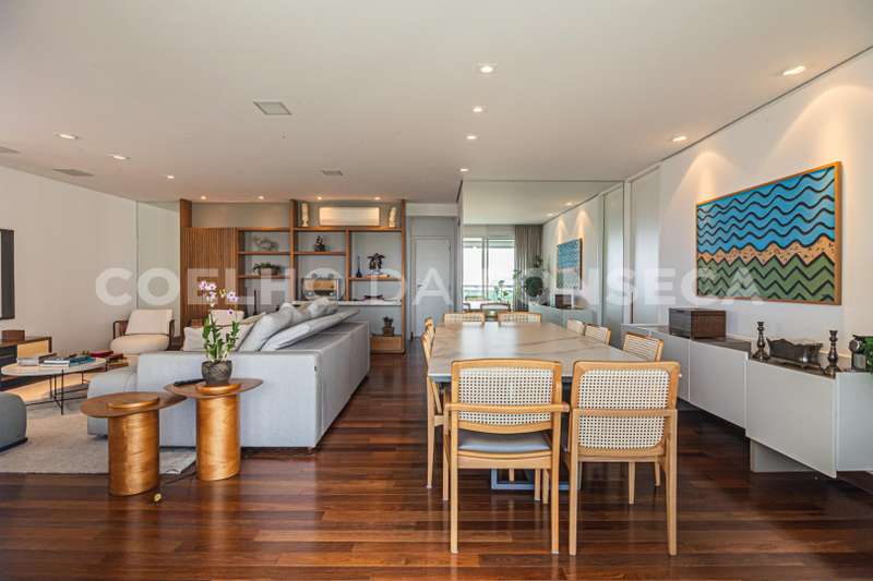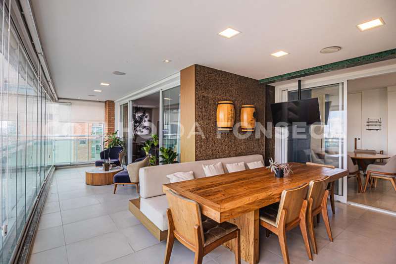Apartamento mobiliado em andar alto com vista livre e maravilhosa, terraço enorme com varanda gourmet, integrado ao amplo living. Todos os ambientes com piso de Cumaru, armários e closets em marcenaria de alto padrão. Acabamentos nas áreas molhadas: piso de porcelanato, tampos de Corian e Silestone nos banheiros. Sistema de som ambiente embutido na área do Living., Suite Master com banheiro sr. e sra. Garagem com 4 vagas individuais e demarcadas, Carregador Elétrico, vagas para visitantes, Lazer Completo com Quadra de Tênis, sauna seca, salão de beleza, piscina aquecida com raia de 25m e condomínio com equipe de segurança 24 horas.