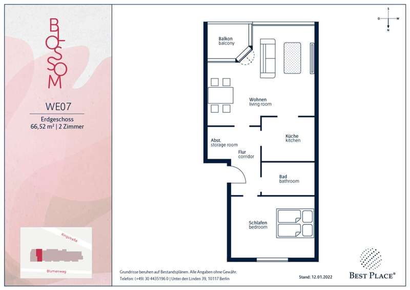 The building ensemble was built in 1973, extended in 1990 and is located in a quiet environment characterized by old trees and secluded residential streets. The 35 rented residential units in the "BLOSSOM" are spread over three houses with up to four floors. They have living spaces ranging from 43 m² to 107 m². From 1-room apartments for singles to 2-, 2.5- and 3-room apartments for couples to spacious 4- and 4.5-room apartments for families - there is something for everyone. Balconies/terraces on each apartment invite you to spend pleasant hours outdoors. Garages, parking spaces and underground parking spaces complete the offer.