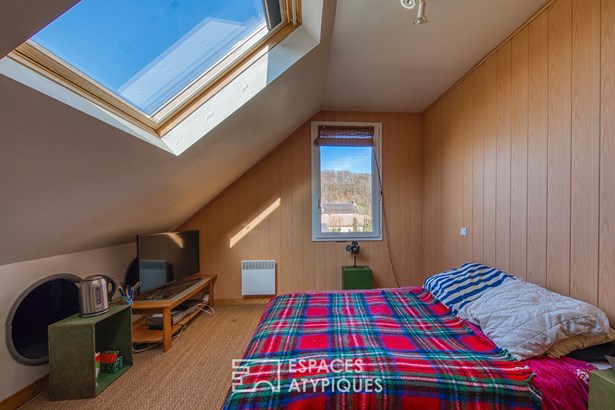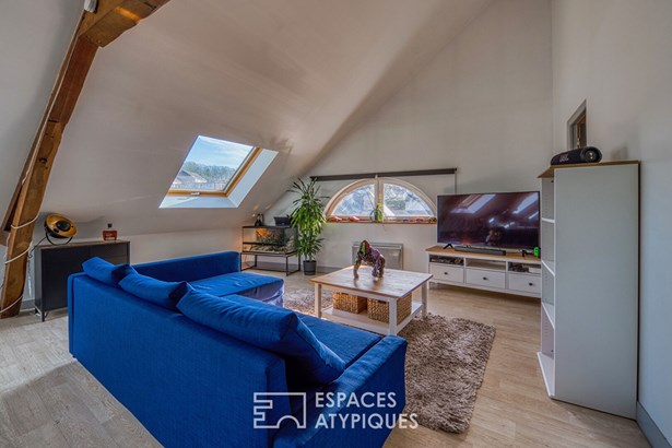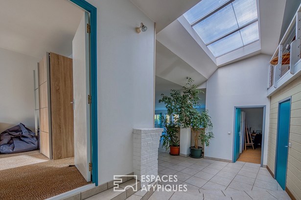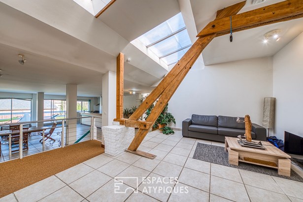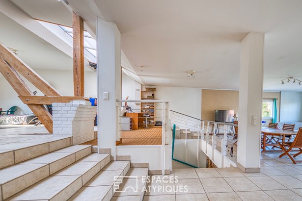 With its independent entrance on the ground floor, just above the river, next to a large garage and two workshops, the place promises to be both spacious and unexpected.
