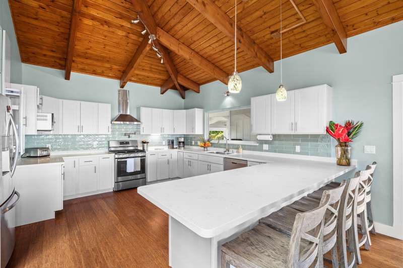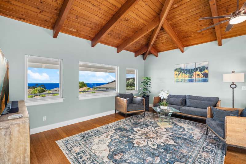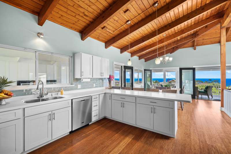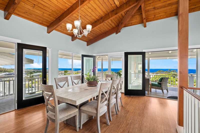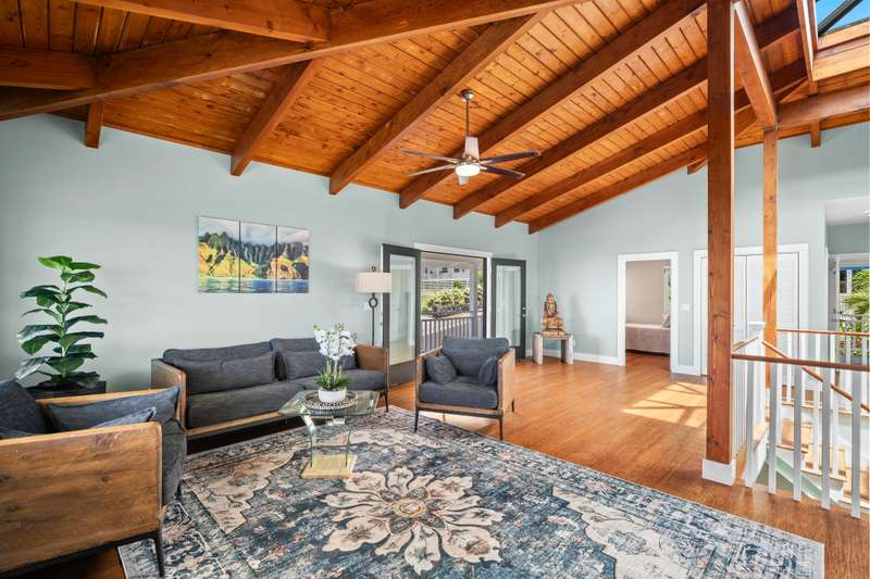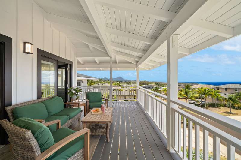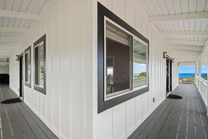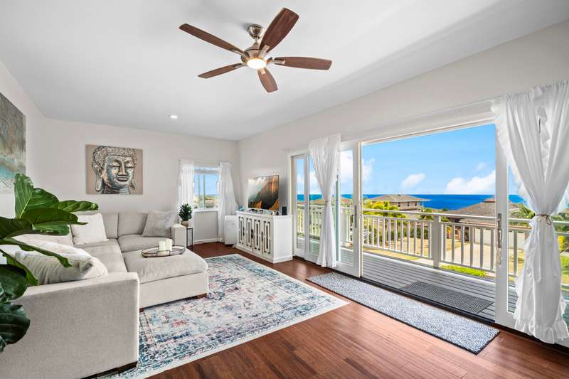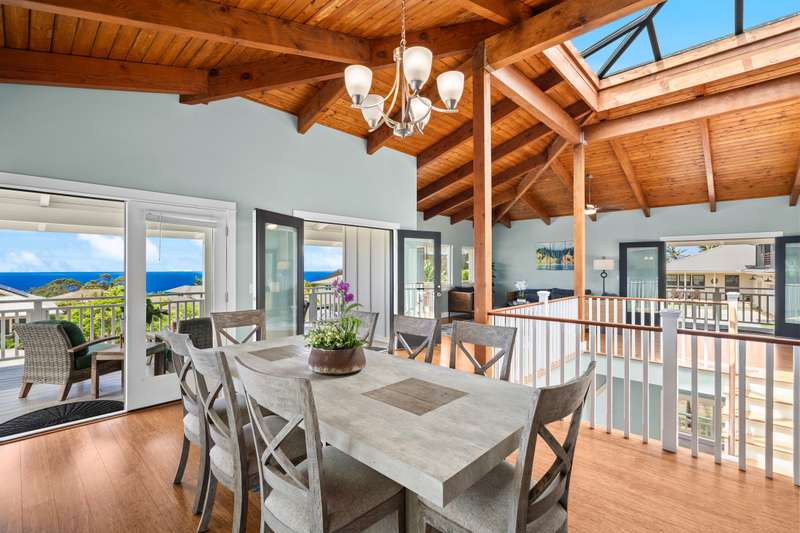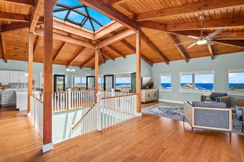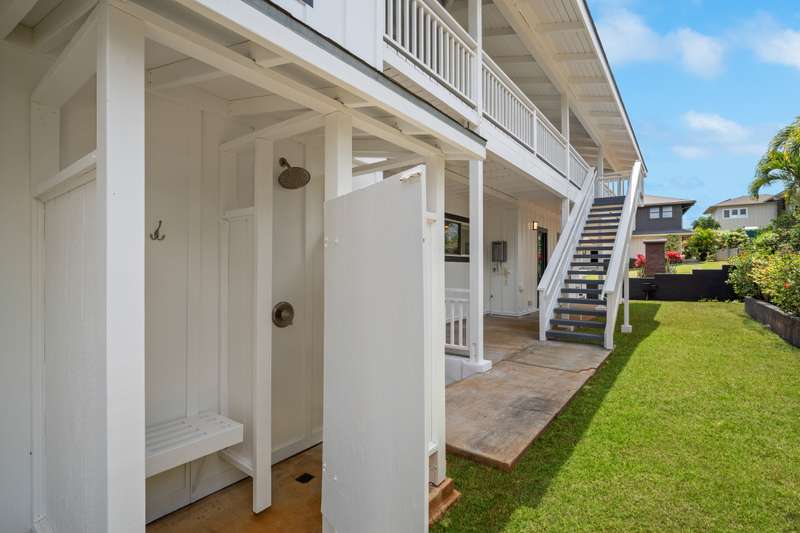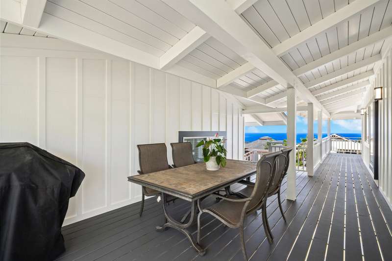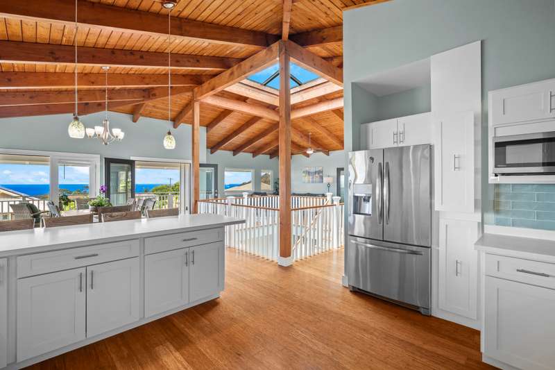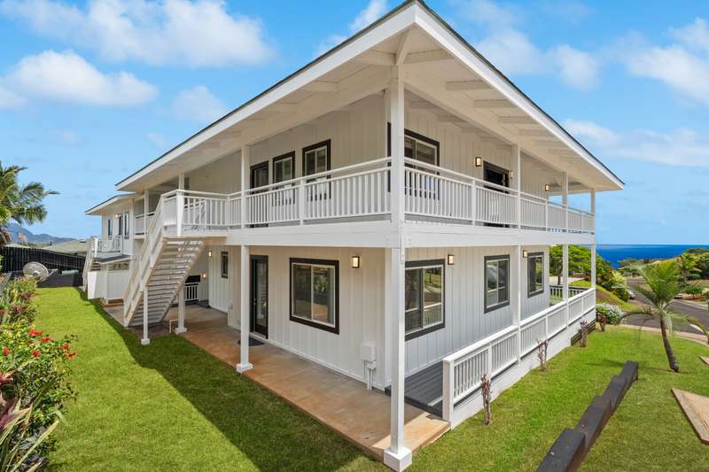 The main home features 3 bedrooms, an office and 2.5 baths. Its thoughtful reverse floor-plan maximizes the ocean horizon views from the upstairs lanai and main living areas. The open-concept kitchen, dining, and living spaces are filled with natural light and designed for both everyday comfort and effortless entertaining. There is also a designated space for a future elevator installation, if desired.