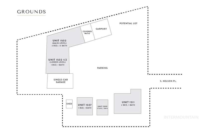 Tucked away in the heart of the Boise Bench, a favorite community for urban living & university students alike, is an incredibly unique and quiet property with a large updated Duplex and 3 additional cozy bungalows, all in a wooded alcove on over 1/2 an acre! It feels like a cabin campsite area in the mountains; yet it's just mins from downtown! The updated main Mid-century home has a large kitchen, hardwood floors, 3 bed/1.5 bath. The living room boasts a wood beam ceiling, large gas fireplace with sitting hearth and peaceful backyard. The lower level was converted into a separate rental 1 bed/1 bath unit with full kitchen, living and gas fireplace (Potential for airbnb). Plus 3 separate dwellings consisting of a studio unit, a one bed one bath unit and a two bed 1 bath unit. Plenty of open parking, covered carport, and shared laundry building on-site. The private driveway lends itself to the secluded nature of the parcel! A smart portfolio property or incredible potential development opportunity.