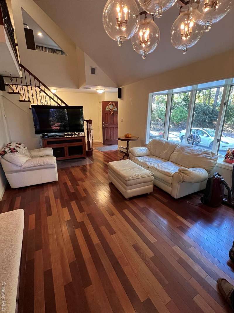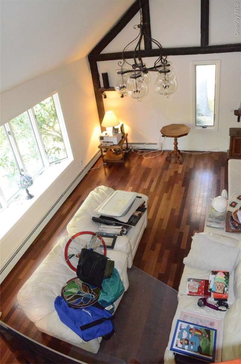 Welcome to this unique secluded Hideway surrounded by woods. Many recent updates. Brazilian Cherry wood floors throughout. Cathedral ceilings with skylights. 2-sided fireplace. Kitchen with quartz counters, stainless steel appliances, Wolf commercial 4 burner stove, griddle, oven, Pot filler spigot, dual temperature wine fridge. Add'l sink in Center island with ample seating. Andersen Windows. Sliders to large rear deck overlooking a large wooded lot. Laundry room on main level. Spacious and bright En suite Master Bedroom w/seating nook/cathedral ceiling and skylight. 2nd floor landing with seating.Ample closet space throughout. Recessed lighting throughout. Finished lower level with full bath(possible apartment with proper permits). 3 zone heat, 1 zone CAC. 2-car garage. Potential horse property. Property offers room for expansion. Commercial size children's slide and gym set. 2 large storage sheds. In-ground sprinklers and irrigation system. All Village Amenities: Golf, Country Club, Beach, Parking. Enjoy numerous Village sponsored concerts. Village boasts children's museum, library programs, and Village Center, all offering events year round. Close to schools. All information should be verified by buyer.