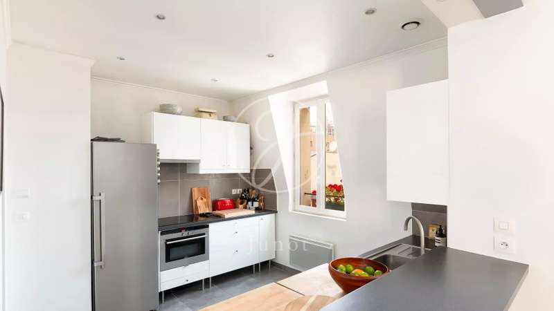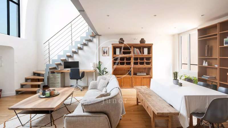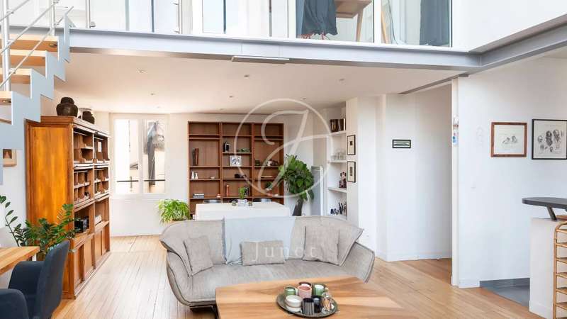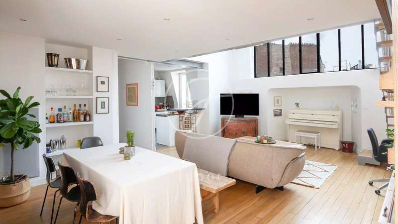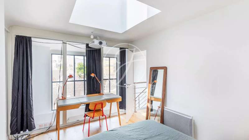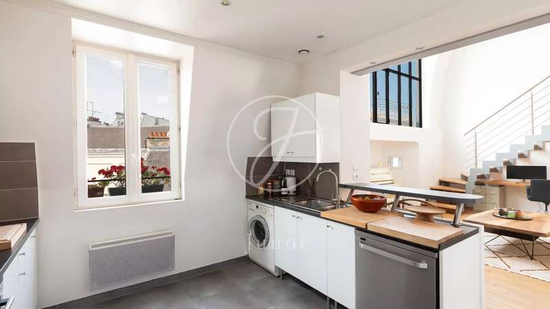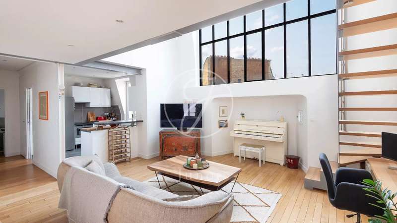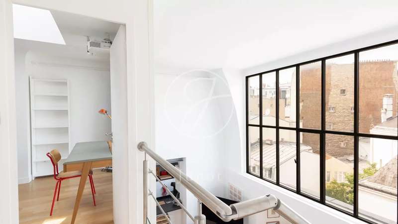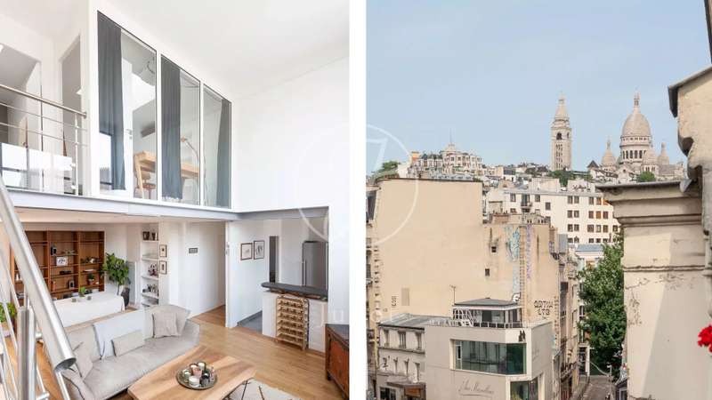 Ideally located on Rue de Bruxelles, just steps from Hector Berlioz Square and Place Blanche, this superb duplex artist's studio is nestled on the fourth and top floor with elevator access. It offers a generous surface area of 84.57sqm (Carrez law) (90.58sqm on the ground floor) bathed in light. It consists, on the first level, of a vast living room enhanced by a glass roof and nearly 4 meters of ceiling height, an open fitted and equipped kitchen, a bedroom and a shower room with toilet. Upstairs, a second bedroom with its own shower room / toilet. It offers absolute calm and superb unobstructed views of the rooftops of Paris and the Moulin Rouge. A large storage room completes this rare property, which combines old-world charm, atypical volumes and a sought-after location. EXCLUSIVE.