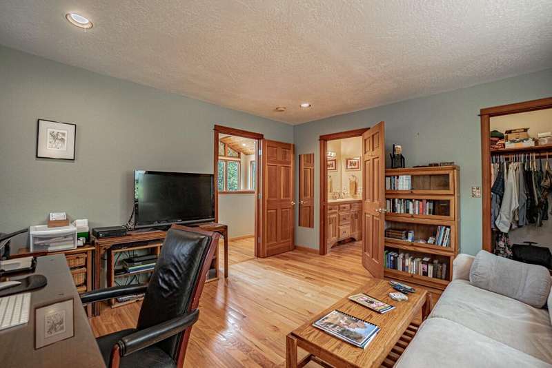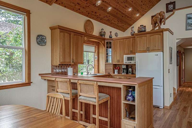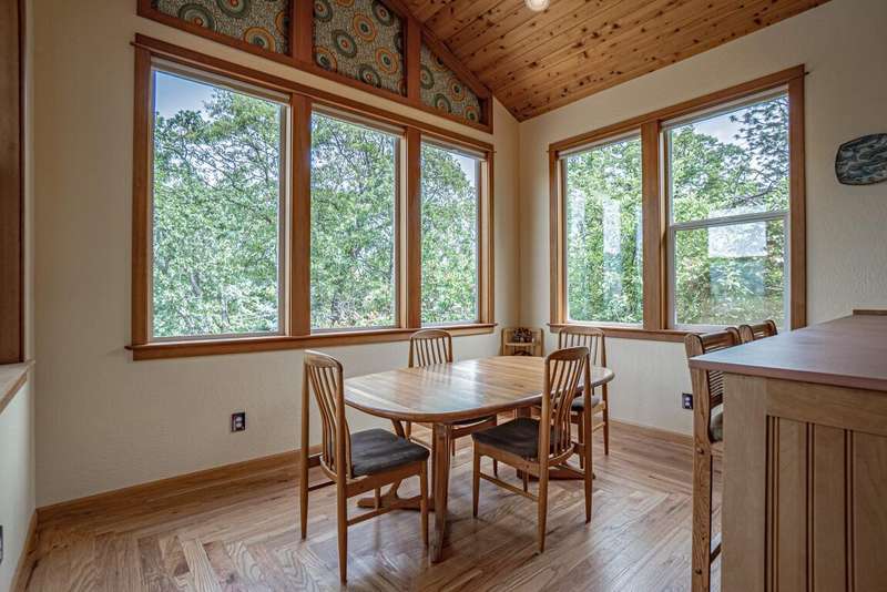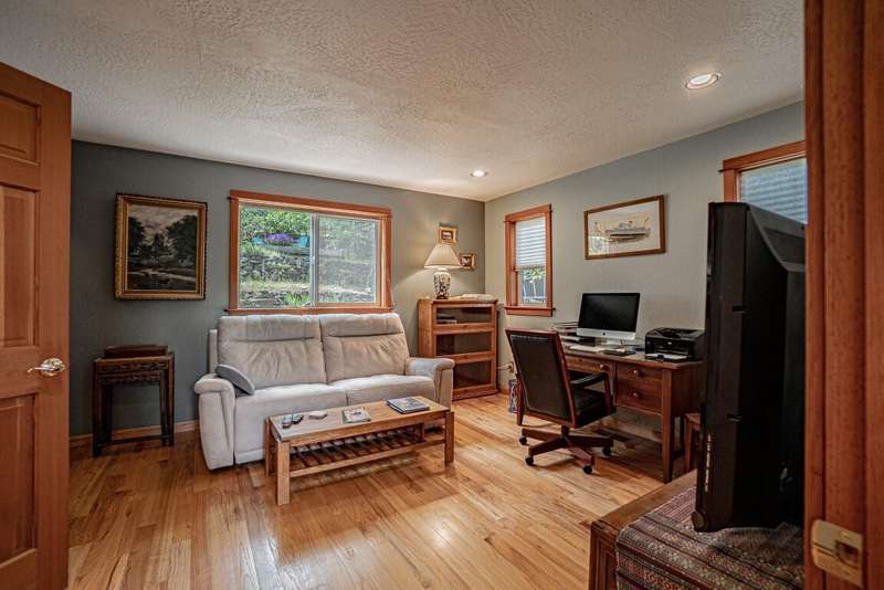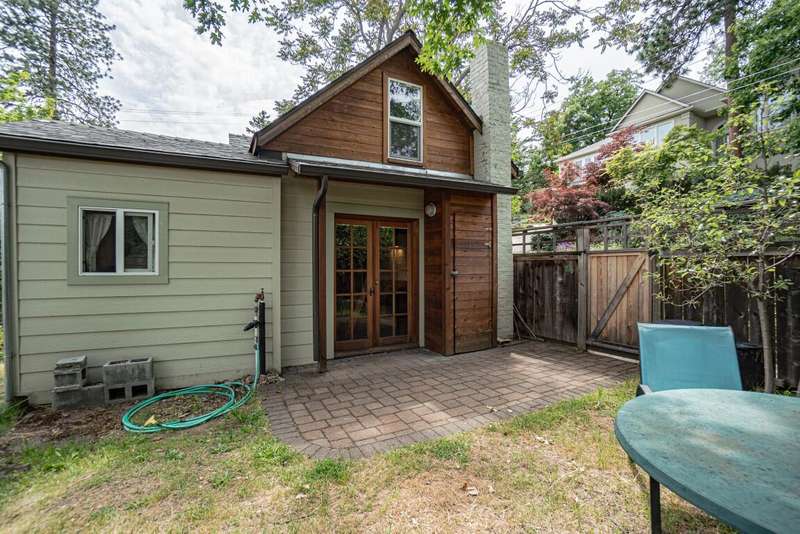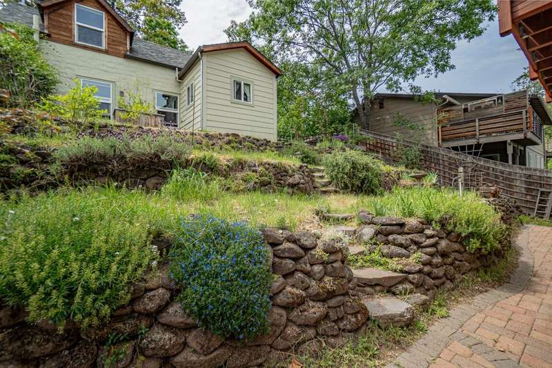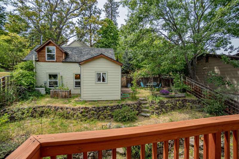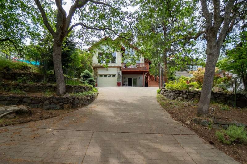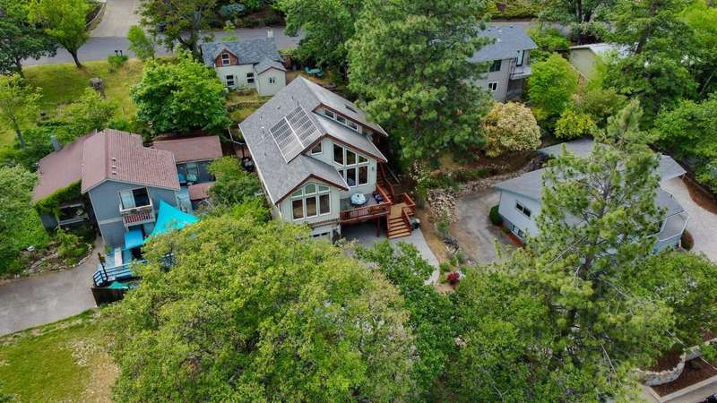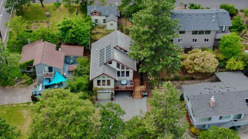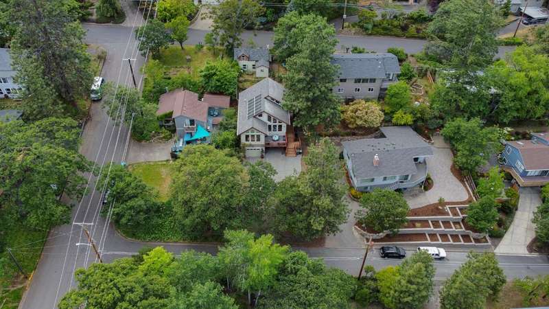 Gorgeous Custom Home and Guest Cottage, Just Steps to Downtown Ashland! This lovingly designed ''Tree-House'' features vaulted living spaces, quality wood finishes, beautiful architectural detailing, extensive natural light and 12-panel solar array. You'll love the T&G ceilings, oak flooring, chef's kitchen with solid surface/tile counters, custom cabinetry, dual-fuel range, sunny garden window, plus the main-level office/bedroom with guest bath, tile shower and counters. The loft-style primary suite offers skylights, views, wood floors, tile bath and jetted tub, while the ground level features a sitting area, guest bedroom, sweet bath with tile shower, unique brew room with industrial sink and good storage. Outside are lovely private decks, soaring trees and beautiful mature plantings. The detached cottage features aggregate flooring, cozy built-ins, brick shower, compact kitchen with gas range, loft sleeping area and energy-efficient mini-split. A True Oasis!