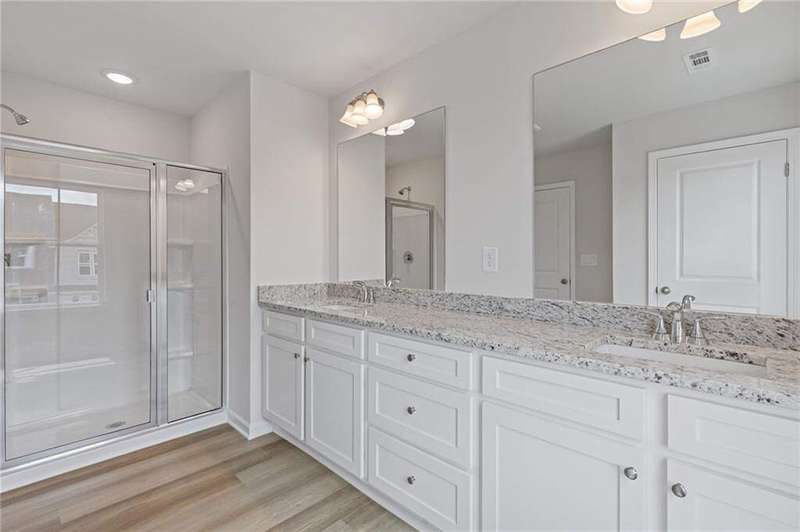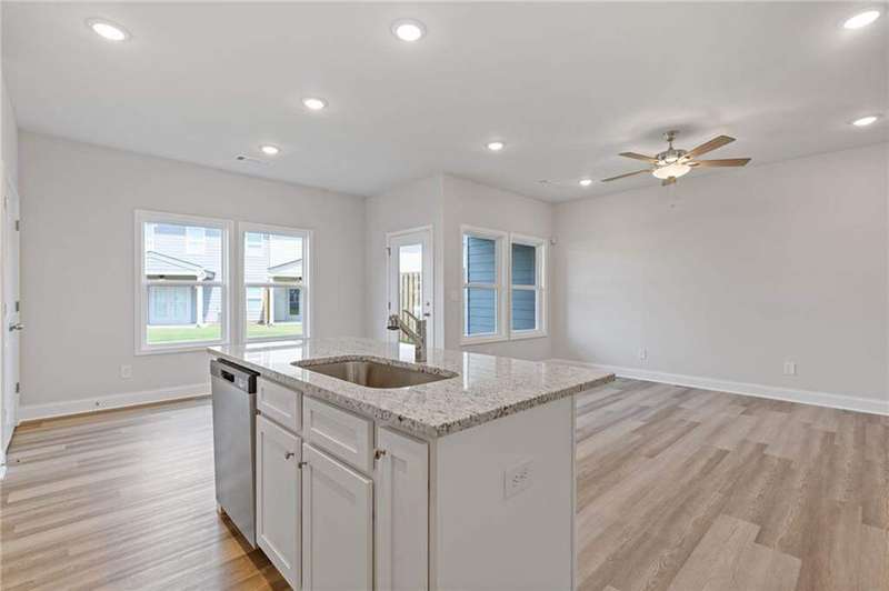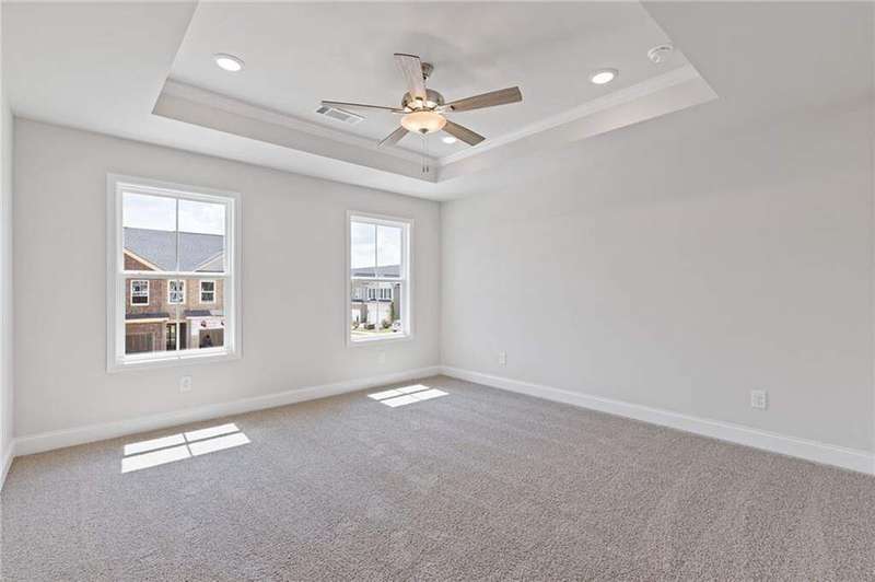 Lot 57- Stockton Middle Unit- Ready early September- Welcome to the Stockton Floor Plan-a fresh new design offering comfort, flexibility, and modern style in an all-brick front townhome with energy-efficient all-electric living. Step onto the inviting covered front porch and into a bright, welcoming foyer. The open-concept main level features a spacious kitchen, dining area, and family room with smooth surface flooring and a ceiling fan for added comfort. The covered rear patio offers a peaceful outdoor escape-perfect for relaxing with your favorite drink or building your dream plant corner. A powder room and two-car garage complete the thoughtfully designed main floor. Upstairs, the Stockton offers three bedrooms and an open loft, ideal for extra living space, game day hangouts, a home office, workout area, or a cozy reading retreat. The primary suite includes a tray ceiling, ceiling fan, and a spacious primary bathroom featuring a wide double vanity, linen closet, and a window that brings in warm natural light. The Stockton combines versatility, style, and functionality to create the perfect home for modern living. Come see why this plan stands out at Alcovy Meadows!
