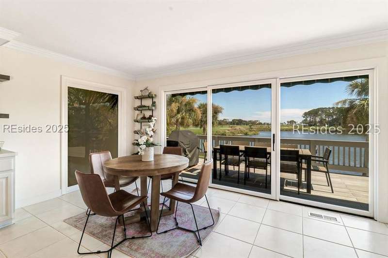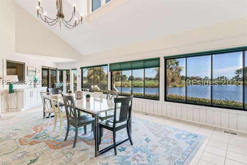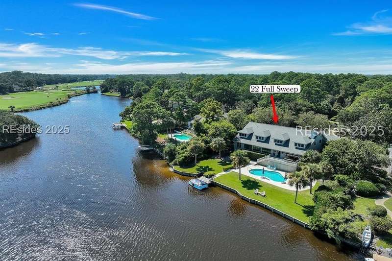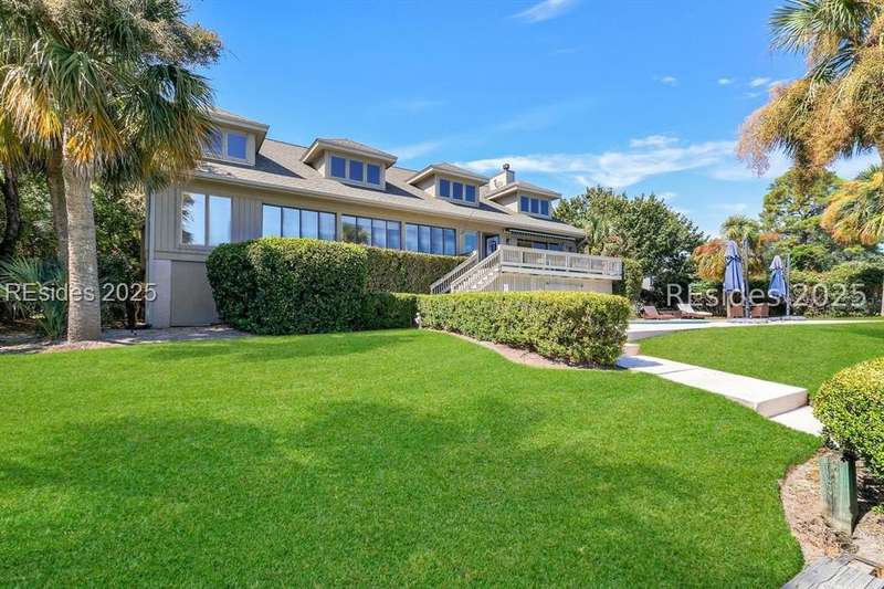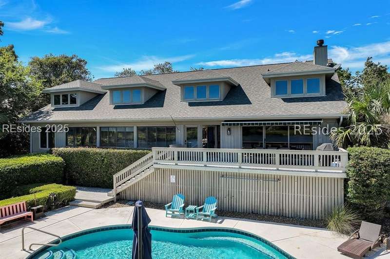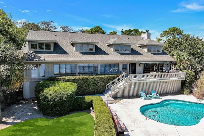 This 4500 sqft stunning 5-bedroom, 5-bath residence offers breathtaking lagoon and multiple holes of the Robert Trent Jones Golf Course (#12 green, #13 hole, #9 tee, and the 10th/11th fairways) with distant OCEAN views. This home has an inviting open kitchen/family room, expansive 1st level owner suite, spacious enclosed porch with dining area, and 4 oversized guest ensuites providing privacy and comfort for family and friends. Outdoor living is unmatched with a trex deck swimming pool, and private dock with access to the 11-mile lagoon making it ideal for fishing, kayaking, or electric boating right out your backyard. Additional features include 3 car garage and 2017 roof. The highly sought-after oceanfront community of Palmetto Dunes is known for its resort lifestyle where residents enjoy access to two beach clubs, three miles of pristine beaches, three championship golf courses, world-class tennis and pickleball facilities, Shelter Cove Harbour & Marina, exceptional dining, shopping, bike paths, and the scenic 11 mile lagoon system.