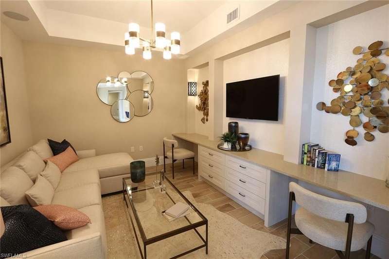 This beautifully furnished, former “model” offers 2 bedroom/Den/2.5 baths, exquisite detail and designer furnishings, right in the heart of Olde Naples. This 1800 sq. ft. property, has Coastal-contemporary décor, Great room, well- appointed gourmet kitchen, with beautiful cabinetry, granite counters/bar, stainless appliances, and a large wrap around lanai. Naples Square is a luxury community, with private, secure ground level parking. Walk to all the great amenities of the historic district, with fabulous restaurants, shows, boating, and beach. The unit has a Queen Bed in the Master Suite, quality décor and linens, spacious closets, private bath with a walk-in shower, and separate tub. The guest suite has a Queen size bed, spacious closets, and private bath. The Den is outfitted with a comfortable couch with a sleeper bed, and TV.. This property's location within the building affords easy access to the community club room, with seating, TV, kitchen, baths, and billiards, as well as the exercise facility. Just a quick walk out to the pool/spa area, which offers plenty of seating areas, chaises, fire tables, and an outdoor BBQ area. See photos to appreciate!