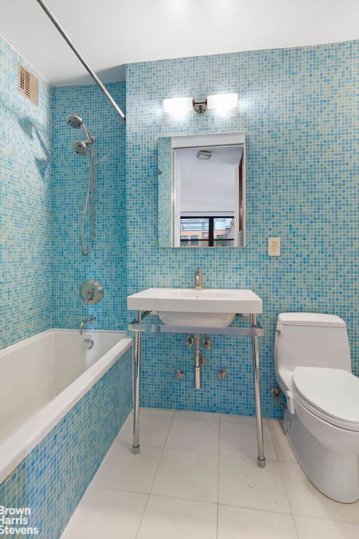 The spacious bedroom easily fits a queen bed and features two outfitted closets. The electronic blackout shades provide ultimate privacy. A large entry walk-in and the bonus office/closet provide an abundance of storage rarely found in city living. The Mediterranean-inspired bath, finished with beautiful blue glass tile, adds a touch of serenity to your daily routine.