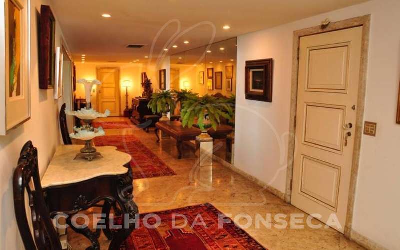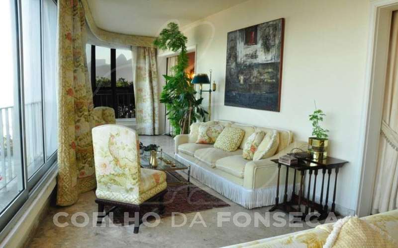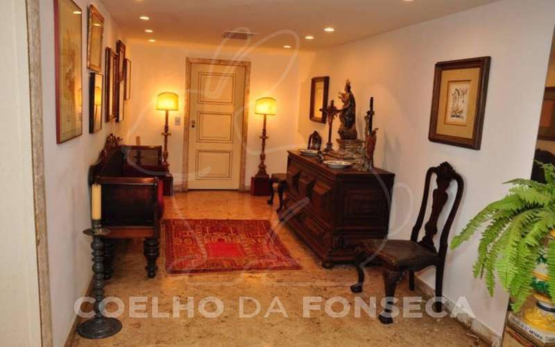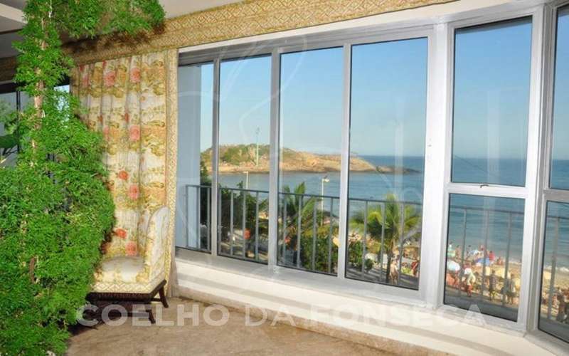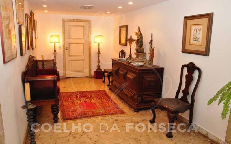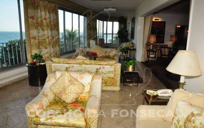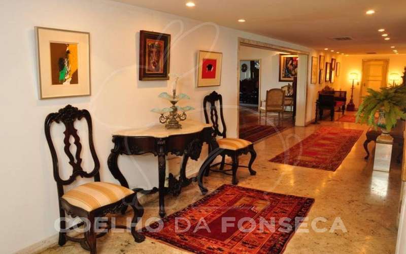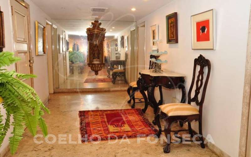 Apartamento em rua privativa, dando acesso quase exclusivo à Praia do Arpoador. O prédio, de apenas 4 andares, possui uma vizinhança seletíssima, e segurança. Hall privativo, galeria de entrada e distribuição para as salas com piso em mármore, salão com piso de tábua corrida de 10 metros de comprimento sem emendas, sala de jantar, biblioteca toda forrada em lambri de jacarandá, e uma grande varanda com piso também em mármore, em toda a frente do apartamento e com uma grande varanda com vista.