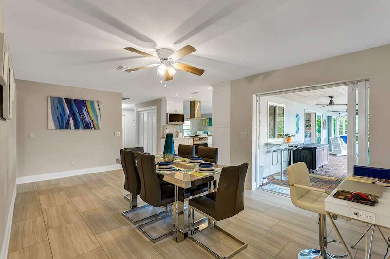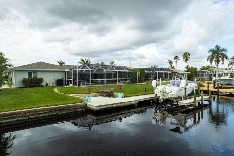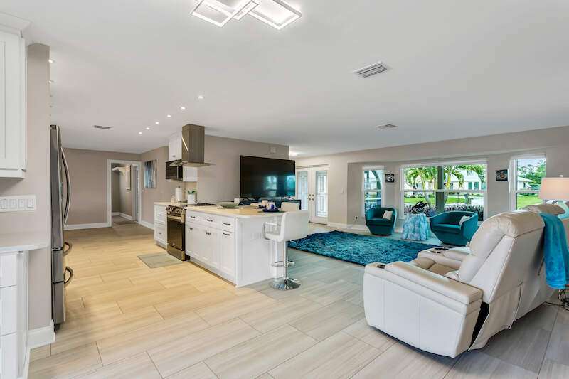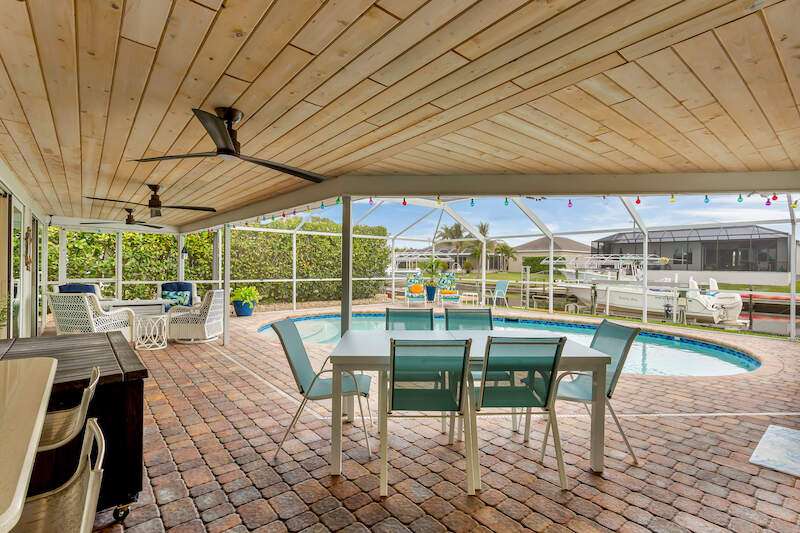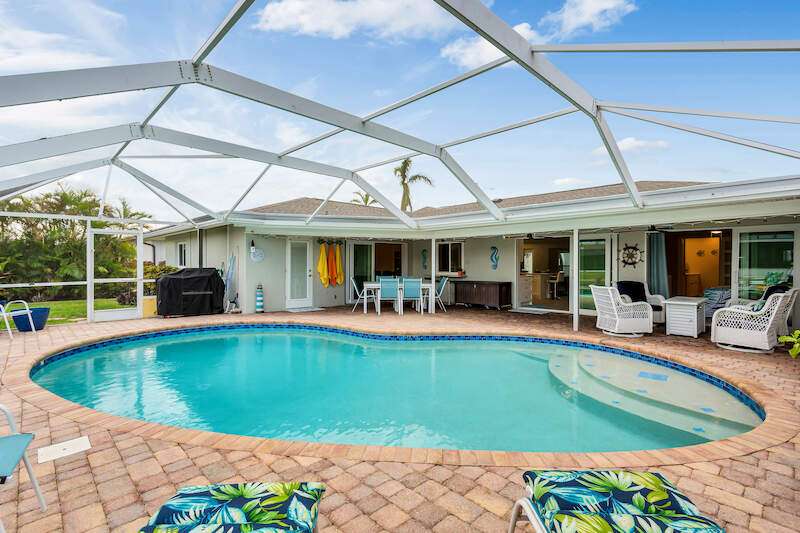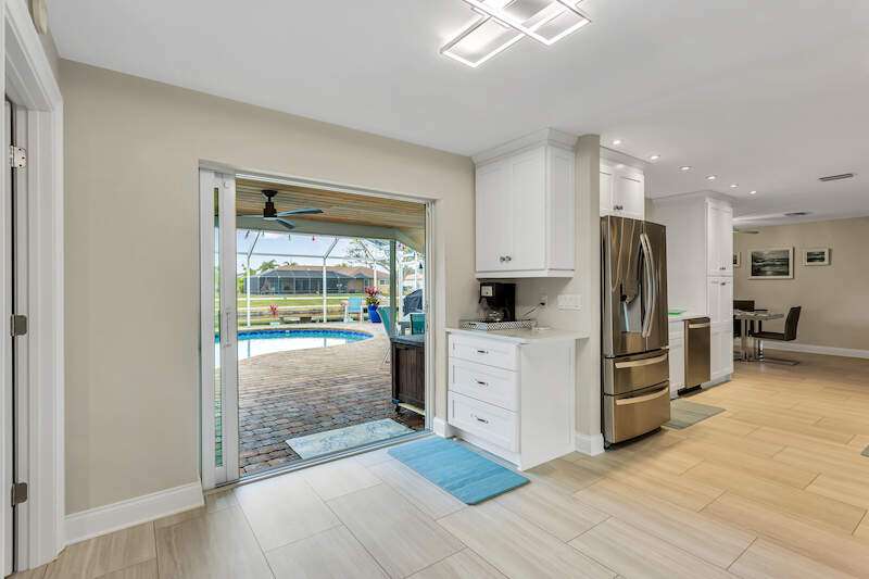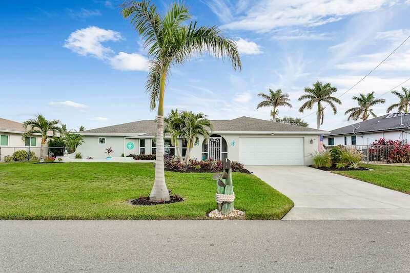 Welcome to your dream Gulf-access pool home in the coveted sailboat-access no bridges of Southwest Cape Coral! This exquisitely remodeled 3-bedroom, 2-bath retreat with a spacious 2-car garage with hurricane rated doors and windows perfectly balances luxury and practicality, ready for you to move right in. The moment you step inside, the expansive open floor plan captivates you, with three grand sliders seamlessly merging indoor and outdoor spaces for an unrivaled entertaining experience or simple relaxation. The kitchen is a culinary masterpiece, gleaming with brand-new quartz countertops, state-of-the-art appliances, pantry and pull-out cabinetry for ease and elegance. Revel in the opulence of newly remodeled bathrooms, featuring stylish vanities with quartz countertops and newly tiled showers. The interior is beautifully updated with new flooring throughout, complemented by fresh interior paint, upgraded interior doors, and trim for a sophisticated touch. Every corner of this home speaks of comfort and convenience, with updates in 2023 & 2024 of new roof, modern new HVAC, new water heater, both garage-door and new double glass front entry door meets wind mitigation standards. The irrigation system and lush, updated landscaping with new palm trees enhance the home's curb appeal. Step outside to your private oasis, where a sparkling, resurfaced pool invites year-round relaxation on oversized paver patio. Enjoy the luxuries of the new pool pump, a pool heater that heats or cools the water to the perfect temperature. A complete newly screened pool cage. Boating enthusiasts will appreciate the dock equipped with a versatile boat lift and either fishing boat or pontoon based on how you configure, water, electric and kayak lift will allow hassle-free access to open water in ten minutes or less. Additional highlights include a chic coffee bar, abundance of storage, a convenient cabana bath, and is Perfectly located near top shopping, dining, bike or walk to Park and entertainment venues. Immerse yourself in the vibrant lifestyle that awaits in this meticulously upgraded, move-in-ready home-offering unmatched Gulf access in a community renowned for its appeal. Seize the opportunity to call this remarkable residence yours and embrace both luxury living and water-bound adventure.