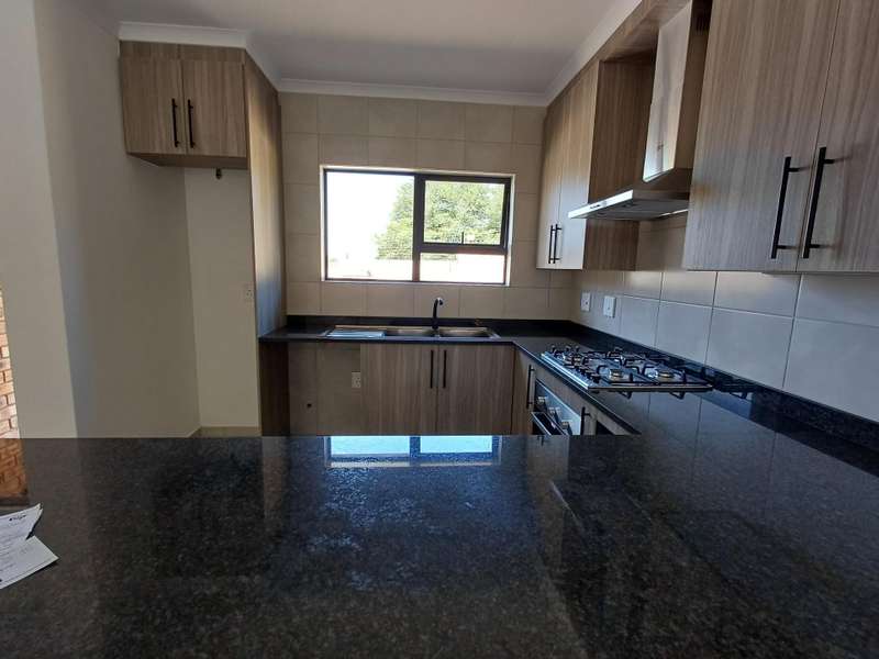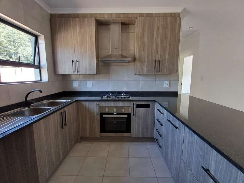 Open plan kitchen with granite tops, gas hob, electric oven, plenty cupboard space, space for fridge and washing machine.