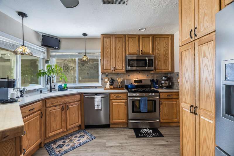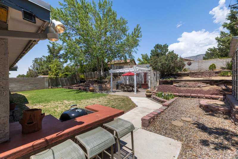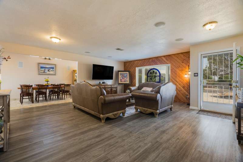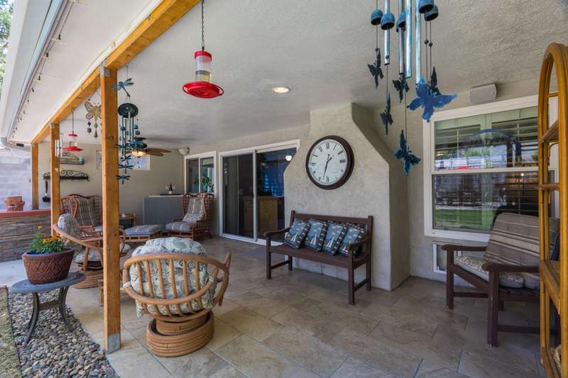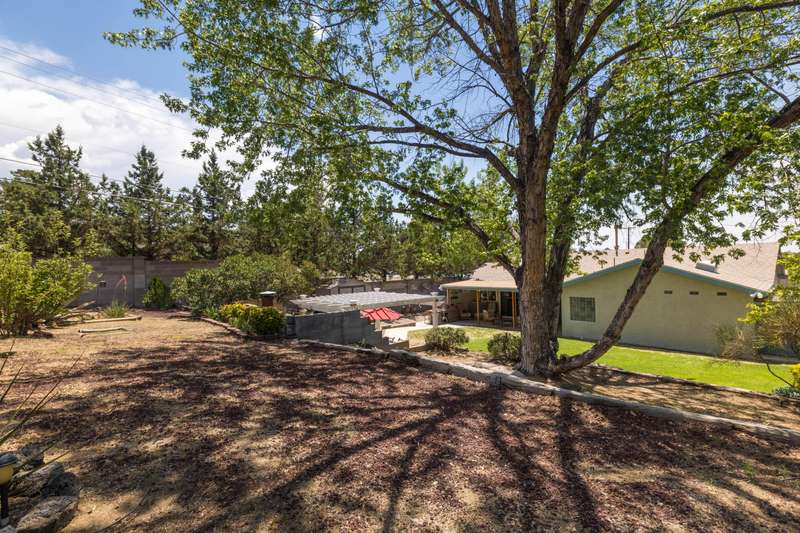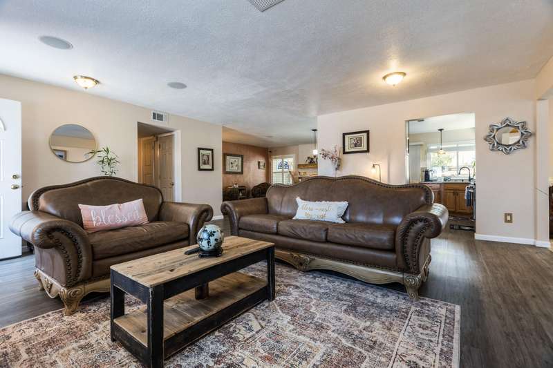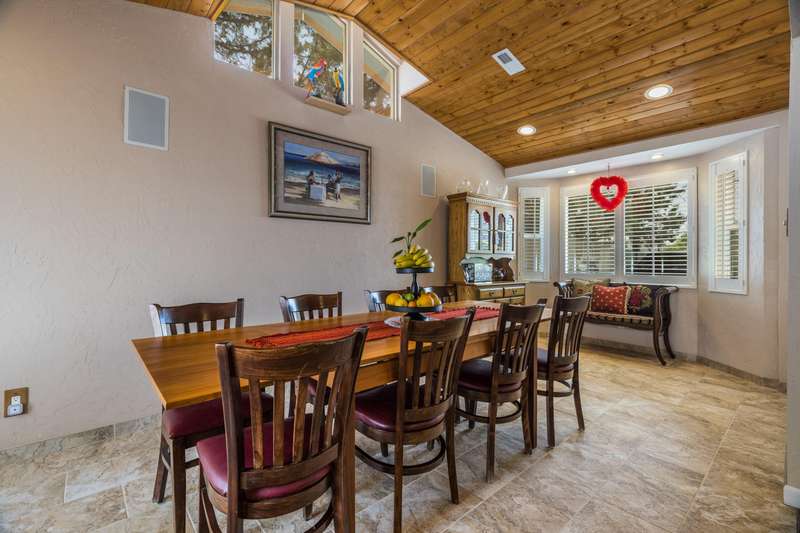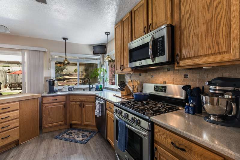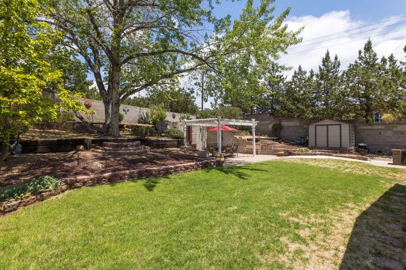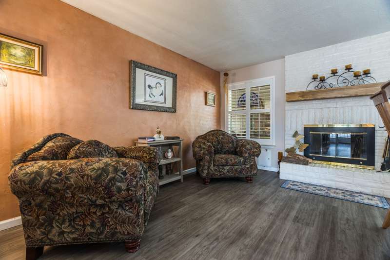 This house feels like home! Charming, with many updates, great space for entertaining or simply relaxing in your private oasis. Great room entry w/ warm laminate wood floors, wood plantation shutters (throughout home), and tons of natural light. Updated kitchen with solid surface counters, island w/ bar seating, & SS appliances including a 5 burner gas stove & frig that will stay! Additional sitting area with fireplace off of the kitchen. The stunning family dining room has vaulted tongue and groove ceiling and French doors to beautiful backyard. Retreat to the primary suite w/ oversized walk-in closet & spa-like bathroom w/ jetted tub and separate shower. 2 additional bedrooms w/ updated hall bathroom. Magnificent backyard, 2 covered patios, lawn, trees, garden shed plus separate shed.