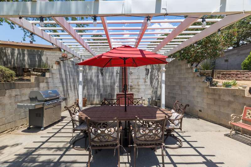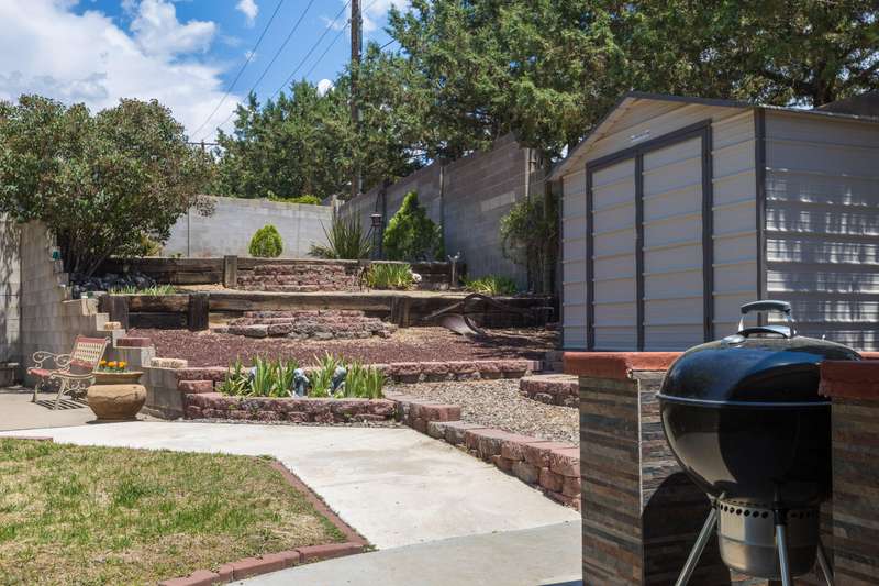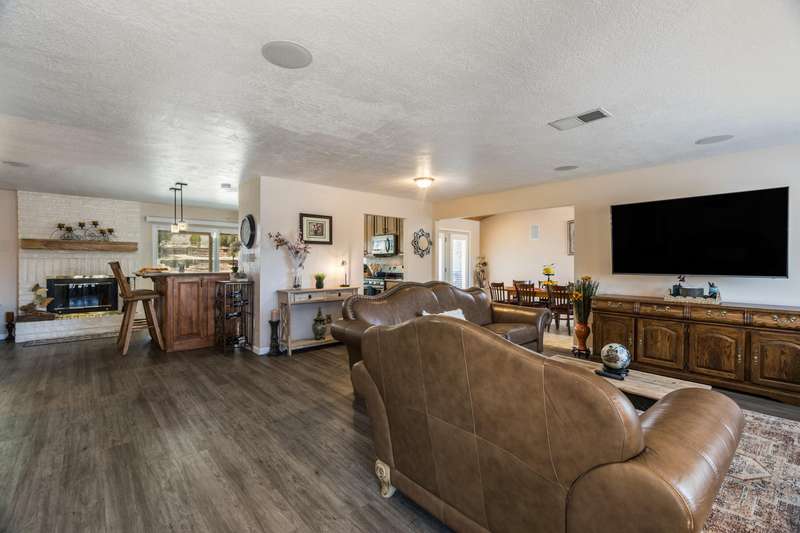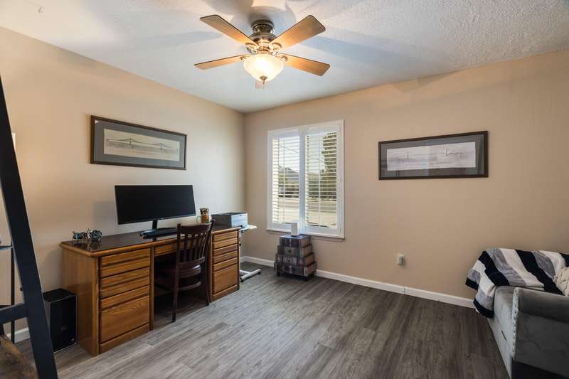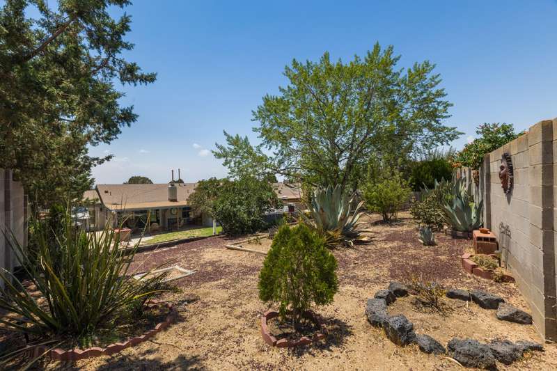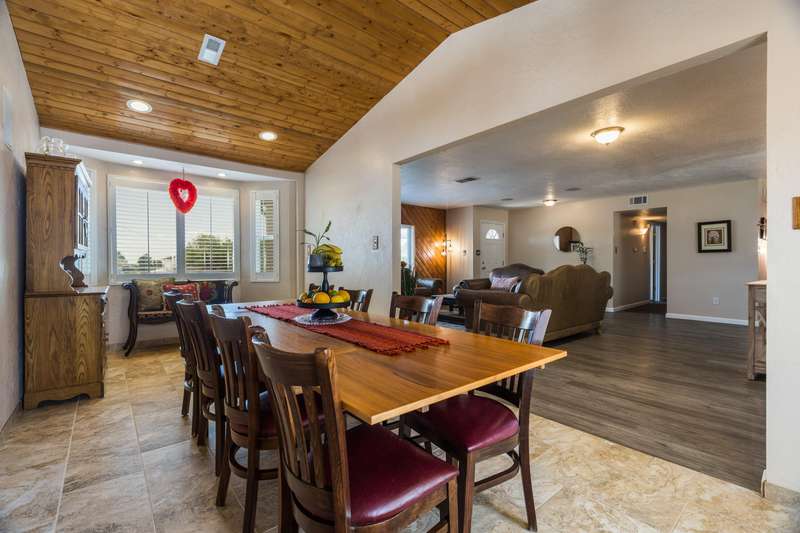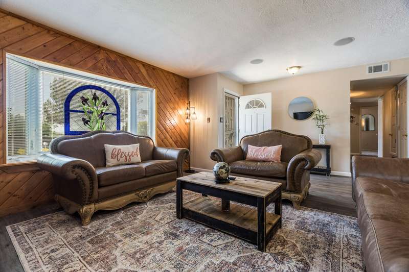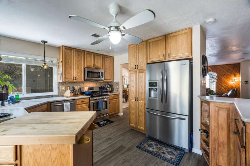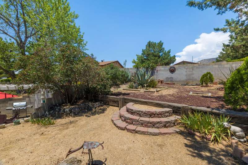 This house feels like home! Charming, with many updates, great space for entertaining or simply relaxing in your private oasis. Great room entry w/ warm laminate wood floors, wood plantation shutters (throughout home), and tons of natural light. Updated kitchen with solid surface counters, island w/ bar seating, & SS appliances including a 5 burner gas stove & frig that will stay! Additional sitting area with fireplace off of the kitchen. The stunning family dining room has vaulted tongue and groove ceiling and French doors to beautiful backyard. Retreat to the primary suite w/ oversized walk-in closet & spa-like bathroom w/ jetted tub and separate shower. 2 additional bedrooms w/ updated hall bathroom. Magnificent backyard, 2 covered patios, lawn, trees, garden shed plus separate shed.