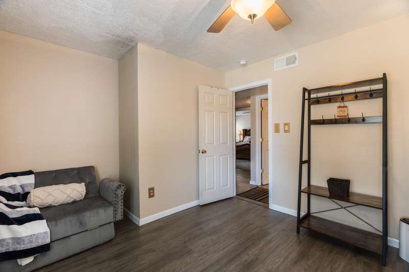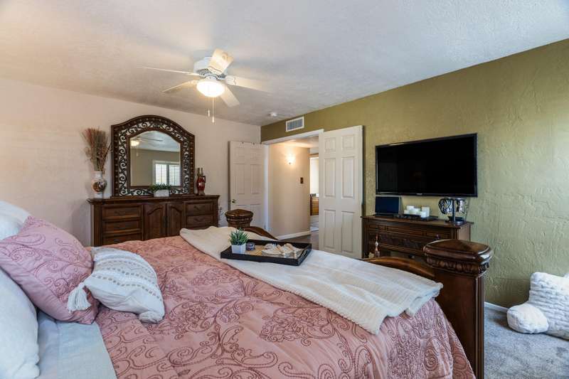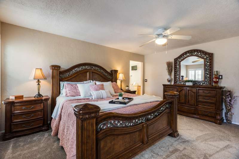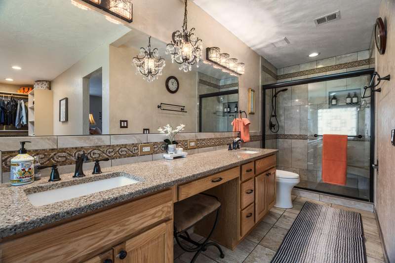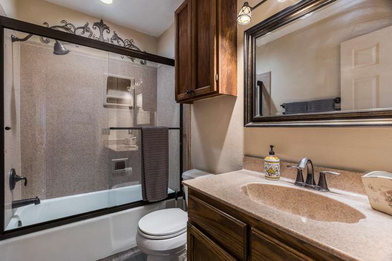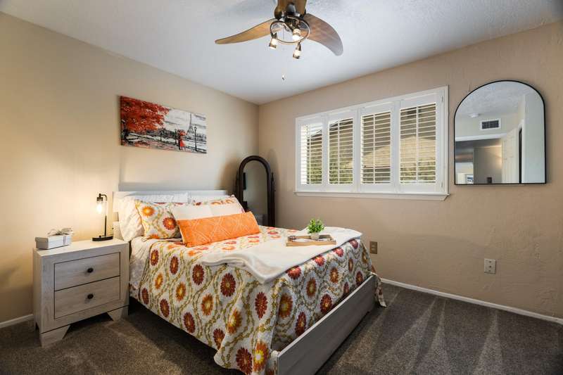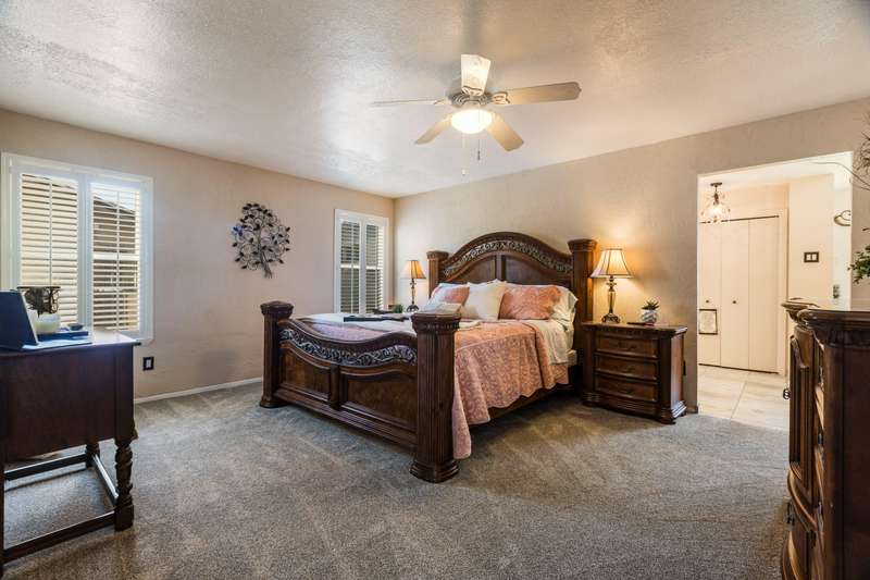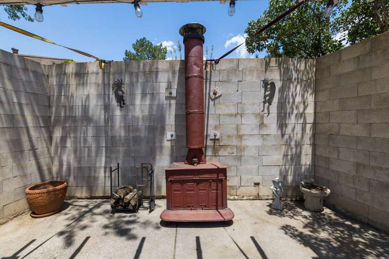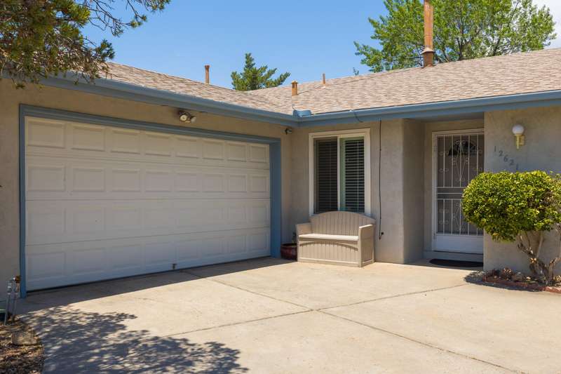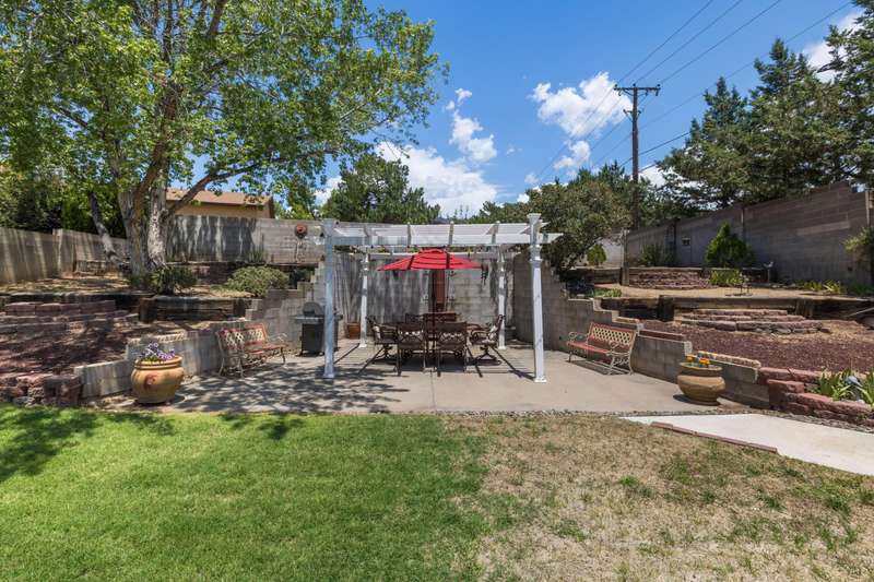 This house feels like home! Charming, with many updates, great space for entertaining or simply relaxing in your private oasis. Great room entry w/ warm laminate wood floors, wood plantation shutters (throughout home), and tons of natural light. Updated kitchen with solid surface counters, island w/ bar seating, & SS appliances including a 5 burner gas stove & frig that will stay! Additional sitting area with fireplace off of the kitchen. The stunning family dining room has vaulted tongue and groove ceiling and French doors to beautiful backyard. Retreat to the primary suite w/ oversized walk-in closet & spa-like bathroom w/ jetted tub and separate shower. 2 additional bedrooms w/ updated hall bathroom. Magnificent backyard, 2 covered patios, lawn, trees, garden shed plus separate shed.