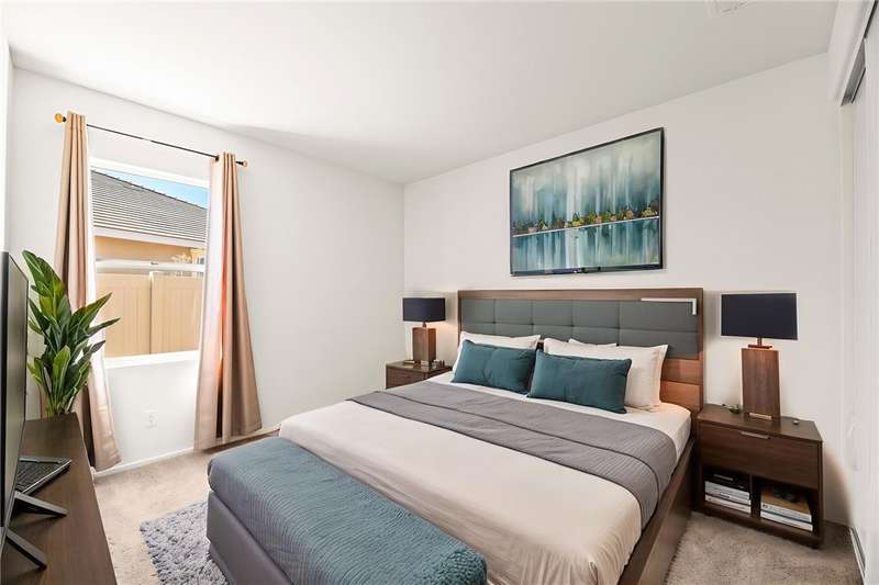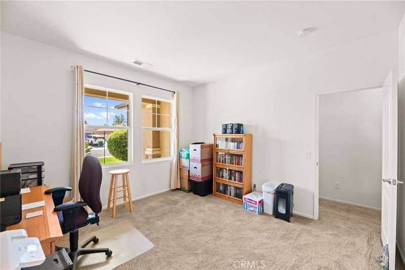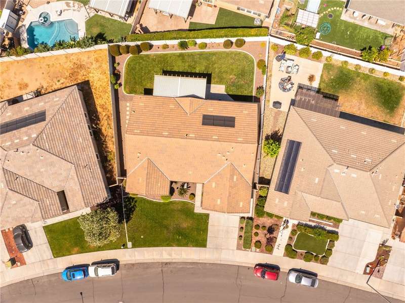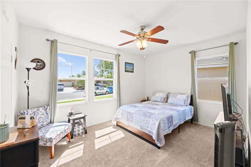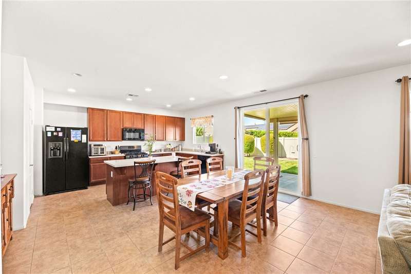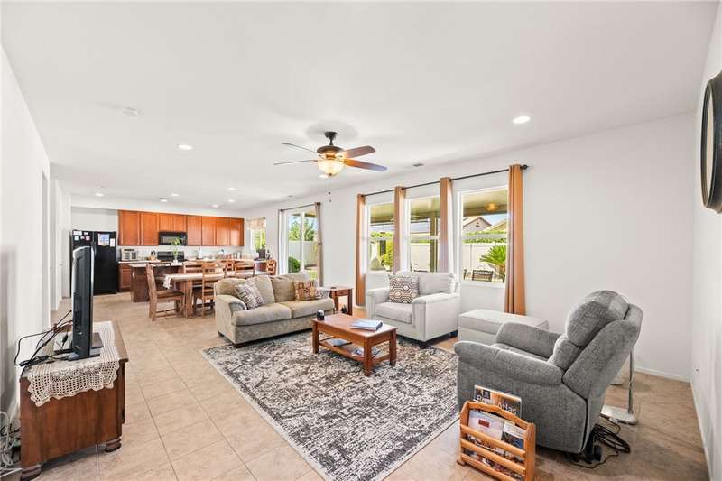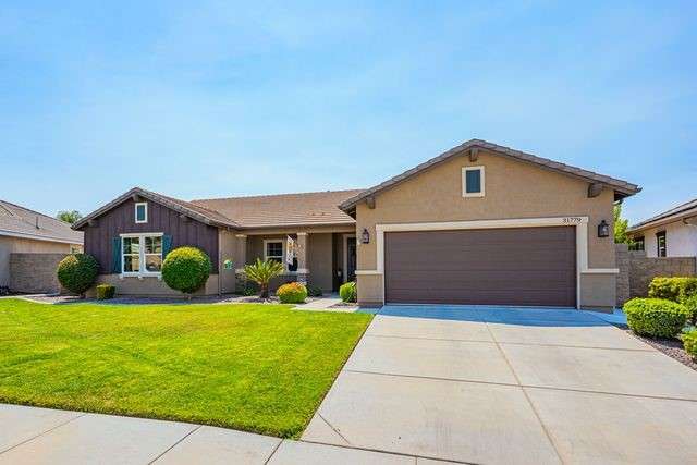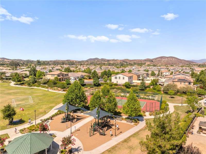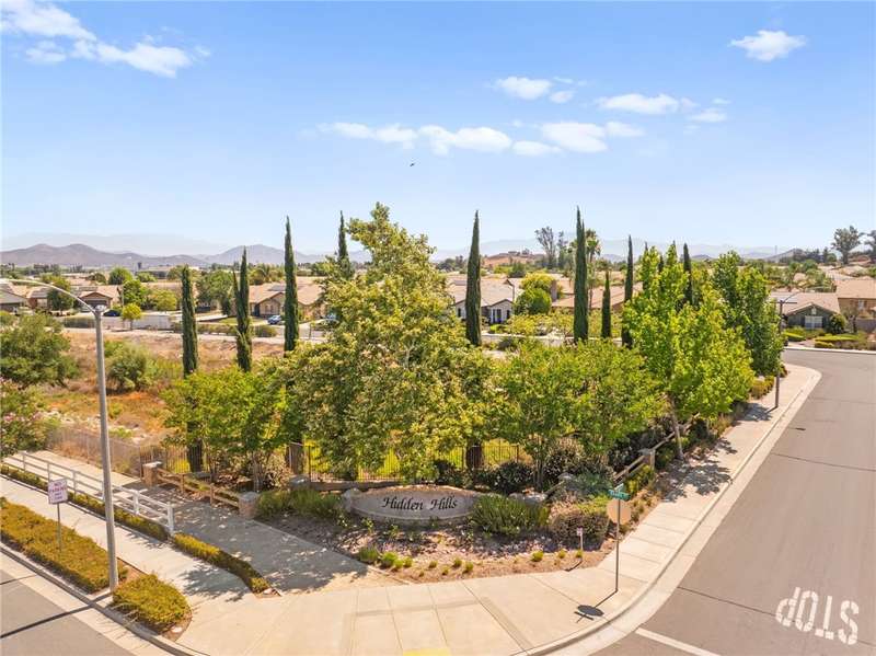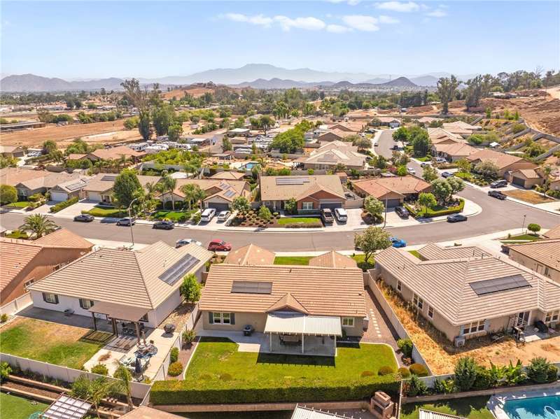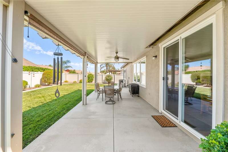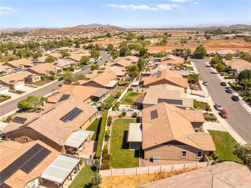 This Country Charmer now offers Incredible Value at a New Price of $625,000. Impeccably upgraded with an expansive kitchen combined with great room and dining area. Perfect for Entertaining! The kitchen illuminates with Corian countertops, maple cabinetry w/mahogany stain, gourmet center island, breakfast bar, black appliances and reverse osmosis at kitchen sink. 9 foot ceiling height throughout home, custom draperies, recessed canned lighting, ceiling fans, raised panel interior doors and additional maple cabinetry at hallway. Primary Suite is located on the opposite side of the home providing privacy from the 3 secondary bedrooms. Primary Bath includes dual sink vanities, Corian countertops, maple cabinetry, oversized shower and linen closet. Extensive built-in white cabinetry in garage for storage, Culligan water softner system, Low E vinyl windows, and a 6 panel solar system by SunPower. Front and backyard has been professionally landscaped with automatic sprinklers, drip system and vinyl fencing. Backyard has a manicured grass area for outdoor activities. Along the backside of the home is a covered patio with ceiling fan and concrete decking for your enjoyment. Just 5 minutes away from Menifee Town Center which hosts a movie theater, restaurants, and specialty stores for your convenience. Easy access to schools, the 15 freeway and Temecula Wine Country. This exquisite single story home has everything you want for a retiree or move-up buyer. You will love this home!