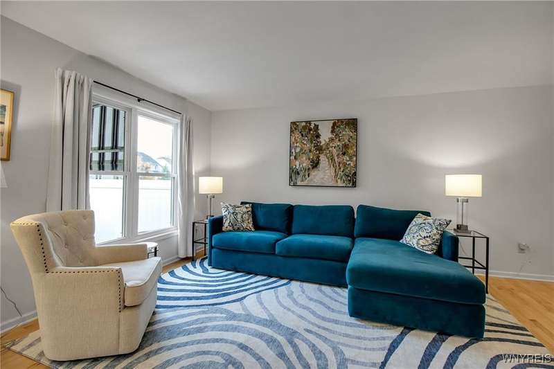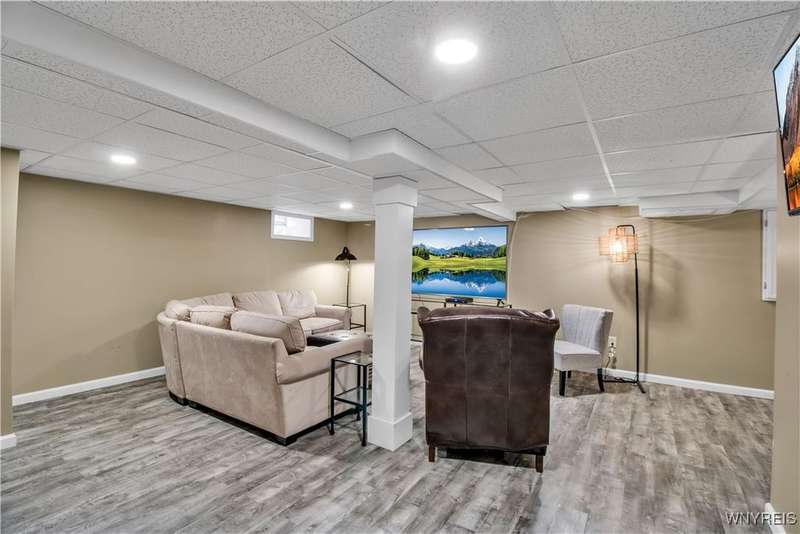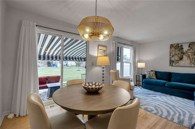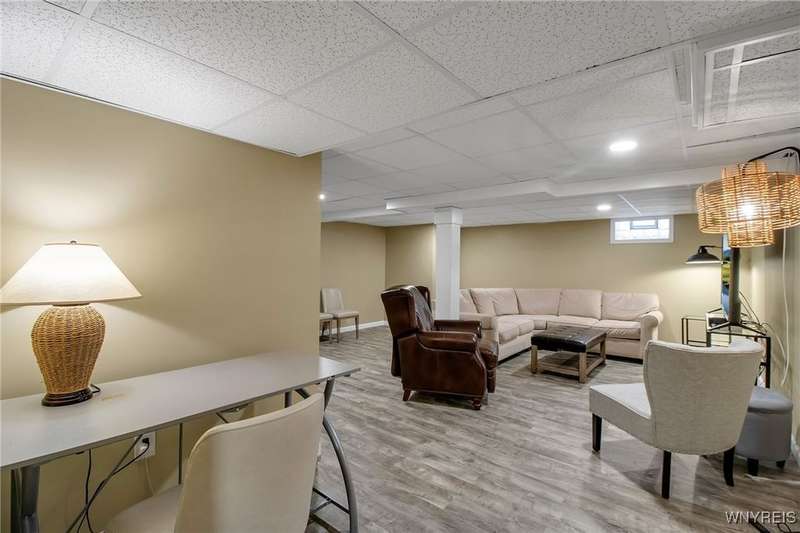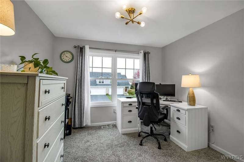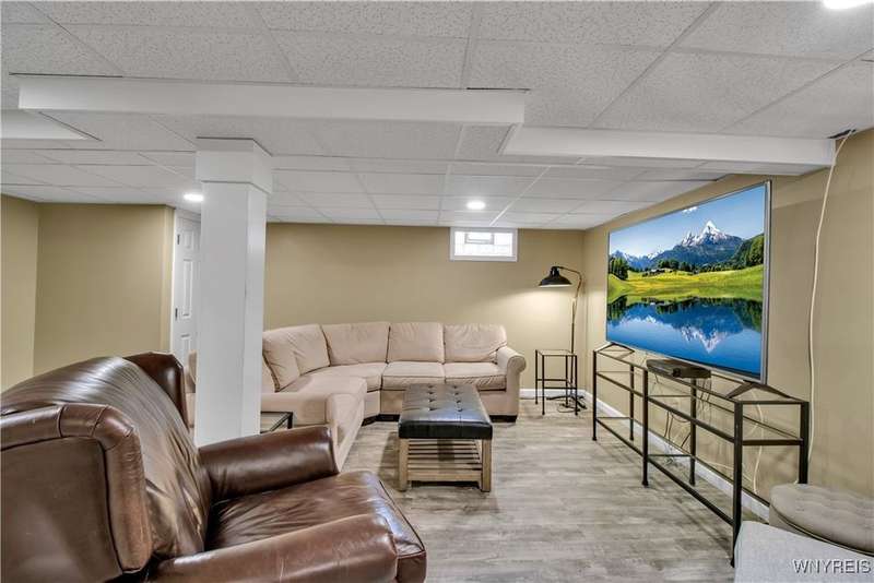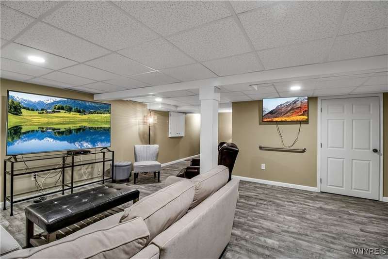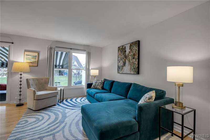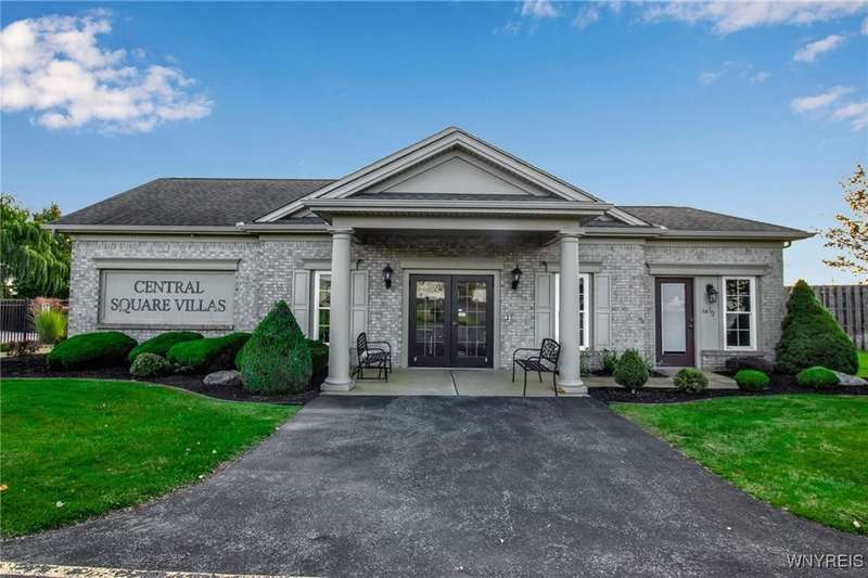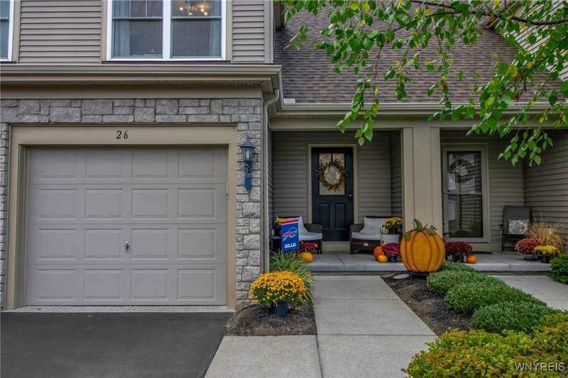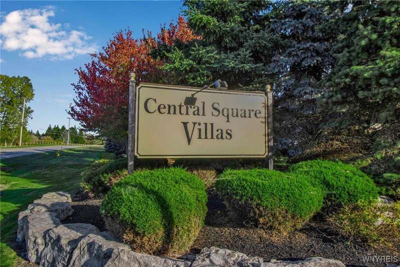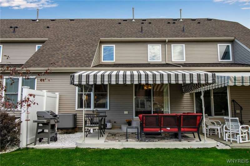 Beautifully updated and elegant. This sleek and modern two-bedroom, 1320 sq. ft. condo/townhome, features 1 1/2 baths, a finished basement and is designed to meet all of your needs and desires. Built in 2015 by Marrano, it offers a low-maintenance lifestyle. The open floor plan is bathed in natural light, with polished, warm-toned hardwood floors throughout. The first floor leads into an updated kitchen with quartz counters, recessed lighting, a breakfast bar, Blanco undermount sink, glass backsplash, and newer stainless-steel appliances (included). Adjacent to the kitchen is the first-floor laundry, with a washer and dryer (new in 2024), that are included. Off the dining room is a brand-new concrete patio with Birthday Cake steps, accessed through a slider. The 2023 All Pro awning, complete with privacy panels, creates a perfect space for entertaining, grilling, or relaxing, surrounded by the lush community green space.Upstairs, you'll find two spacious bedrooms with a shared bath featuring a soaking tub and tile floor. The primary bedroom includes custom window coverings, a walk-in closet and a new ceiling fan. The second bedroom, also well sized, is currently being used as a home office. The lower level offers additional space for recreation or exercise, complete with a workout area with included television, a theater-gaming room with a 75-inch flatscreen TV (included), and a temperature-controlled storage area for your valuables. Vented glass block windows.Recent updates by the current owners include front landscaping, custom garage shelving, new appliances, designer lighting throughout, and the patio with its awning. Central Square Villas provides a peaceful, carefree lifestyle with amenities like a pool, tennis court, clubhouse, and ample green space. Conveniently located between Lancaster, Williamsville, and Clarence, this community is minutes away from the airport, shopping, highways and all conveniences. Pet friendly, no rentals. Condo tax status.