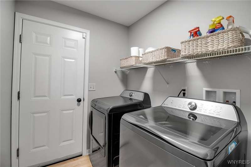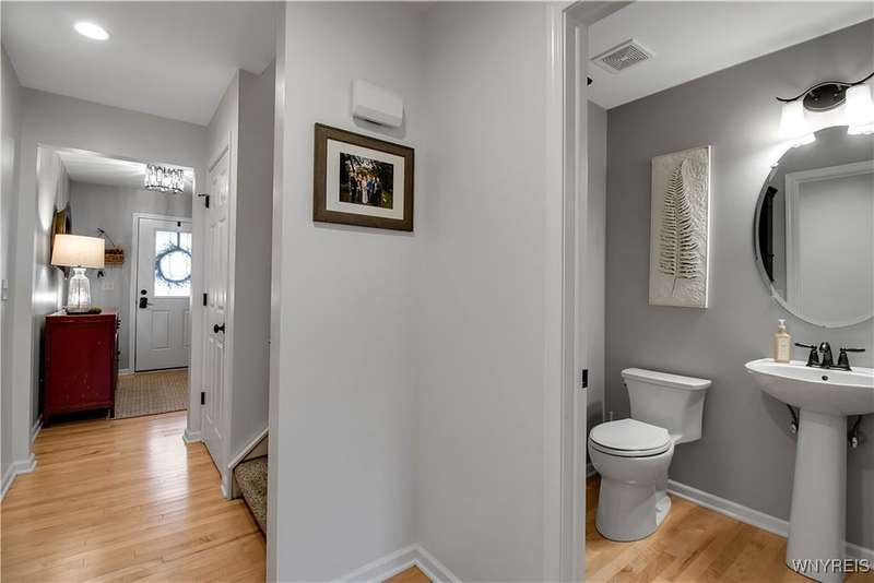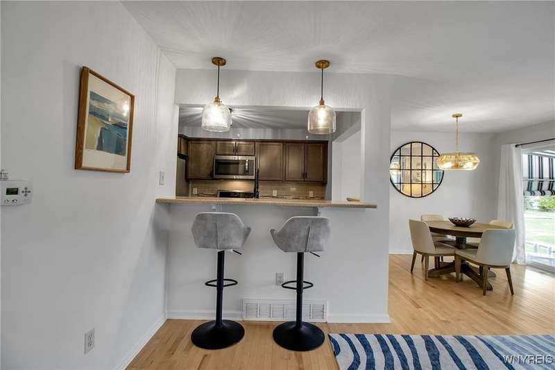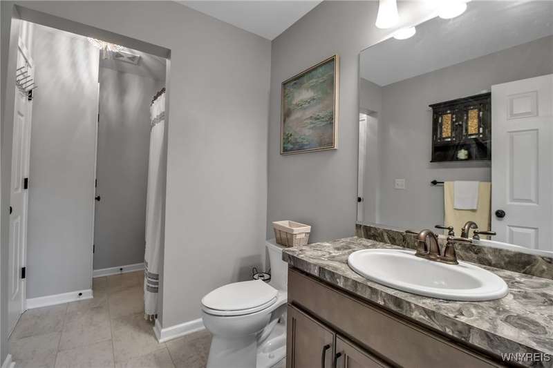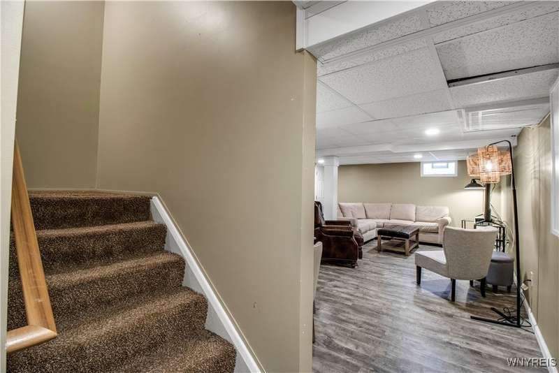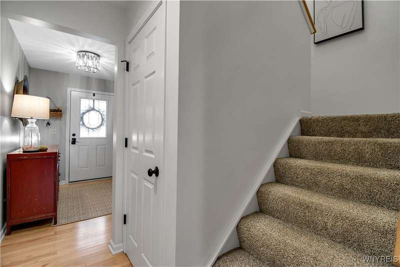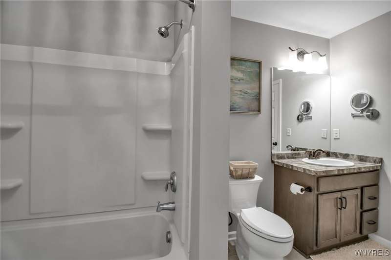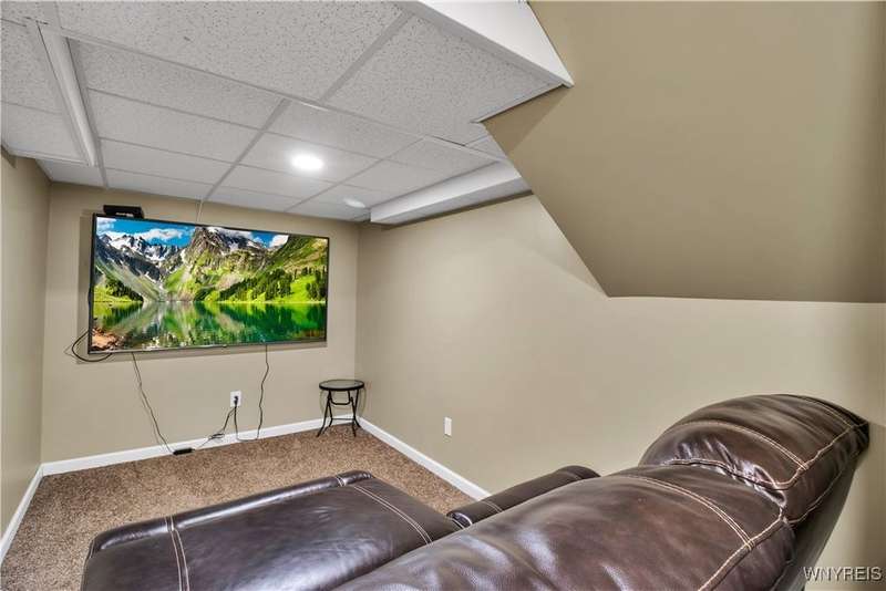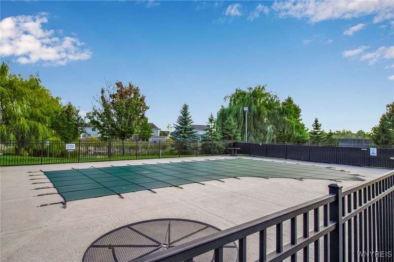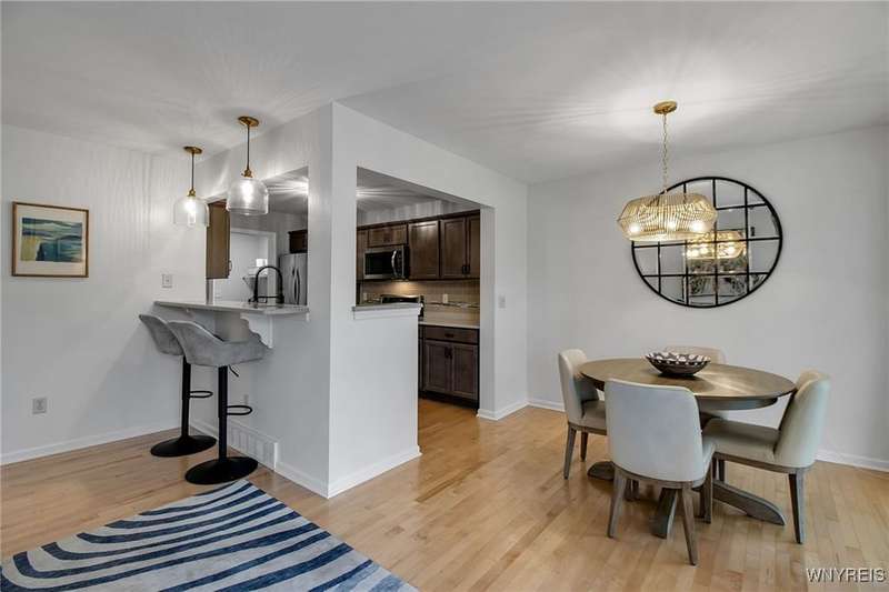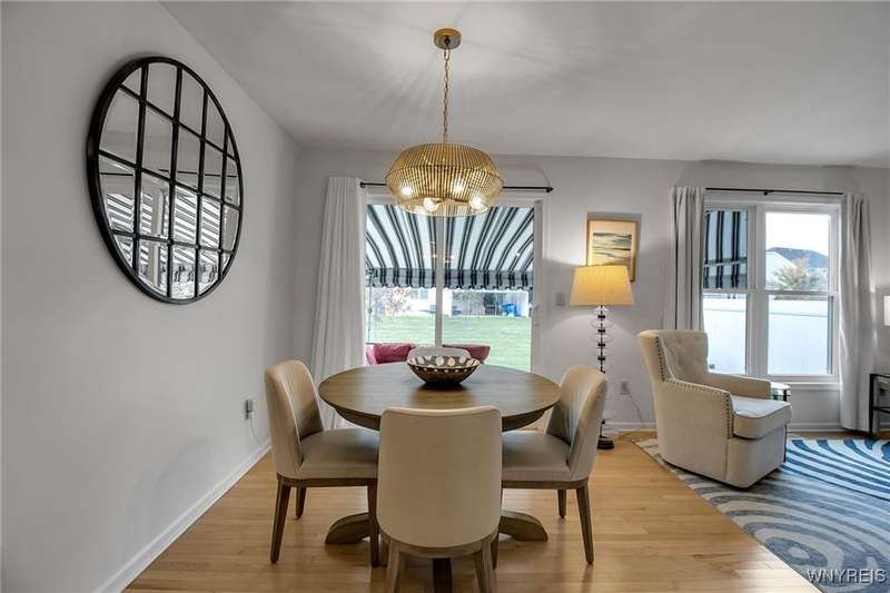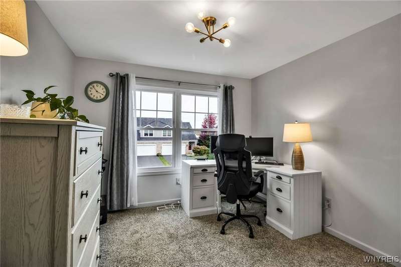 Beautifully updated and elegant. This sleek and modern two-bedroom, 1320 sq. ft. condo/townhome, features 1 1/2 baths, a finished basement and is designed to meet all of your needs and desires. Built in 2015 by Marrano, it offers a low-maintenance lifestyle. The open floor plan is bathed in natural light, with polished, warm-toned hardwood floors throughout. The first floor leads into an updated kitchen with quartz counters, recessed lighting, a breakfast bar, Blanco undermount sink, glass backsplash, and newer stainless-steel appliances (included). Adjacent to the kitchen is the first-floor laundry, with a washer and dryer (new in 2024), that are included. Off the dining room is a brand-new concrete patio with Birthday Cake steps, accessed through a slider. The 2023 All Pro awning, complete with privacy panels, creates a perfect space for entertaining, grilling, or relaxing, surrounded by the lush community green space.Upstairs, you'll find two spacious bedrooms with a shared bath featuring a soaking tub and tile floor. The primary bedroom includes custom window coverings, a walk-in closet and a new ceiling fan. The second bedroom, also well sized, is currently being used as a home office. The lower level offers additional space for recreation or exercise, complete with a workout area with included television, a theater-gaming room with a 75-inch flatscreen TV (included), and a temperature-controlled storage area for your valuables. Vented glass block windows.Recent updates by the current owners include front landscaping, custom garage shelving, new appliances, designer lighting throughout, and the patio with its awning. Central Square Villas provides a peaceful, carefree lifestyle with amenities like a pool, tennis court, clubhouse, and ample green space. Conveniently located between Lancaster, Williamsville, and Clarence, this community is minutes away from the airport, shopping, highways and all conveniences. Pet friendly, no rentals. Condo tax status.