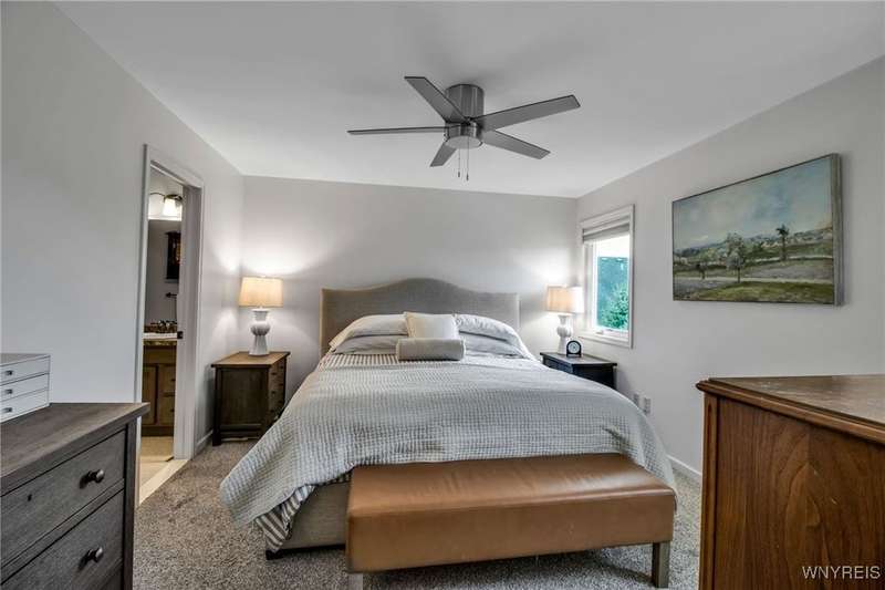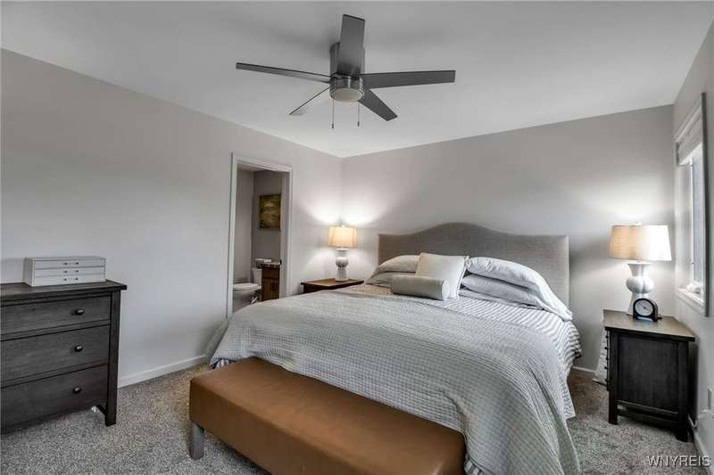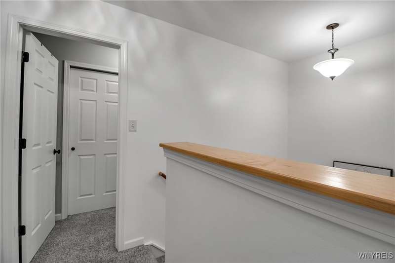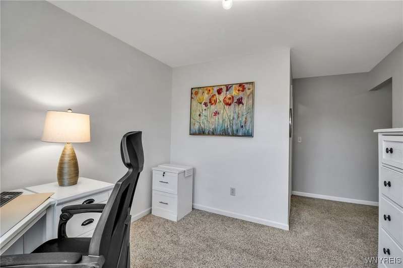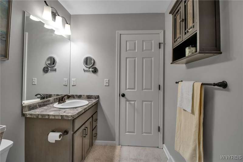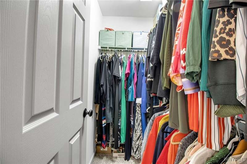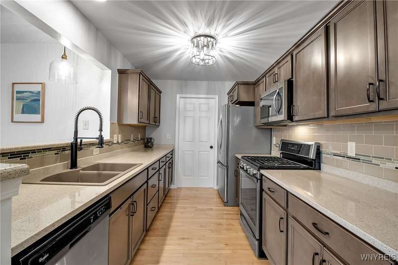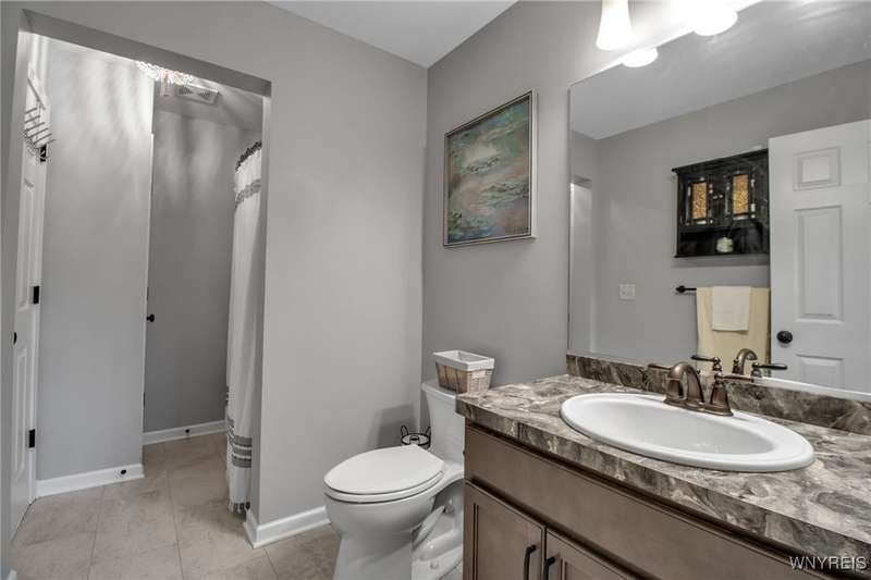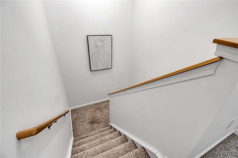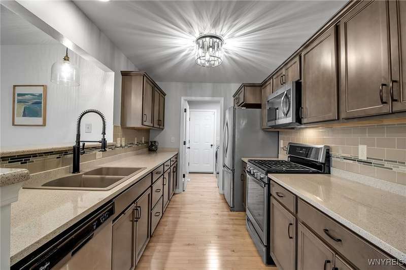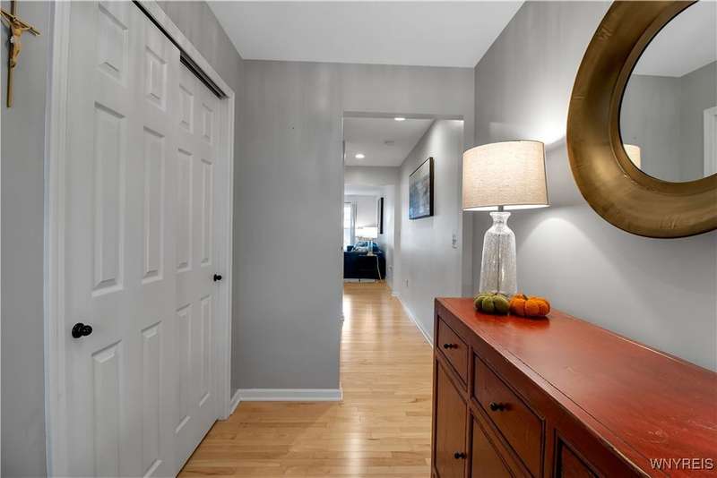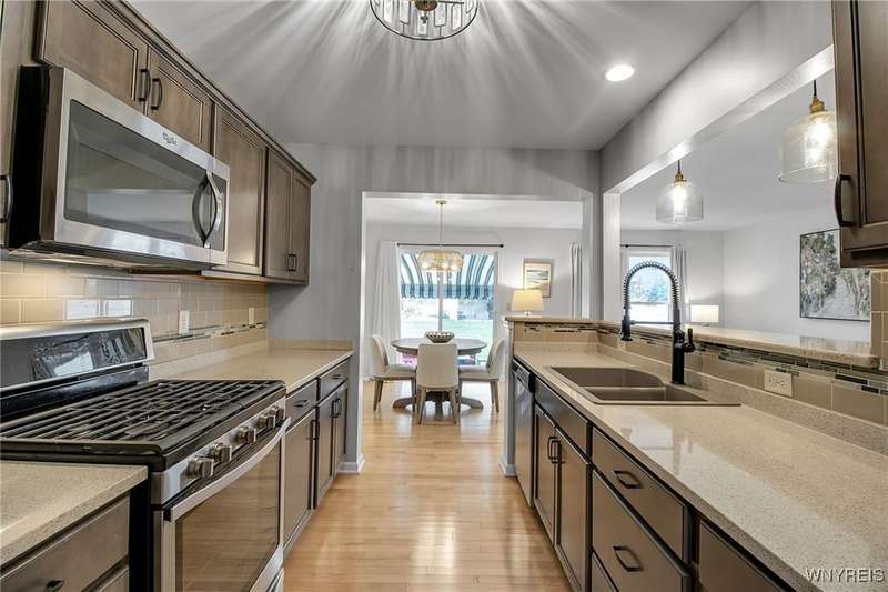 Beautifully updated and elegant. This sleek and modern two-bedroom, 1320 sq. ft. condo/townhome, features 1 1/2 baths, a finished basement and is designed to meet all of your needs and desires. Built in 2015 by Marrano, it offers a low-maintenance lifestyle. The open floor plan is bathed in natural light, with polished, warm-toned hardwood floors throughout. The first floor leads into an updated kitchen with quartz counters, recessed lighting, a breakfast bar, Blanco undermount sink, glass backsplash, and newer stainless-steel appliances (included). Adjacent to the kitchen is the first-floor laundry, with a washer and dryer (new in 2024), that are included. Off the dining room is a brand-new concrete patio with Birthday Cake steps, accessed through a slider. The 2023 All Pro awning, complete with privacy panels, creates a perfect space for entertaining, grilling, or relaxing, surrounded by the lush community green space.Upstairs, you'll find two spacious bedrooms with a shared bath featuring a soaking tub and tile floor. The primary bedroom includes custom window coverings, a walk-in closet and a new ceiling fan. The second bedroom, also well sized, is currently being used as a home office. The lower level offers additional space for recreation or exercise, complete with a workout area with included television, a theater-gaming room with a 75-inch flatscreen TV (included), and a temperature-controlled storage area for your valuables. Vented glass block windows.Recent updates by the current owners include front landscaping, custom garage shelving, new appliances, designer lighting throughout, and the patio with its awning. Central Square Villas provides a peaceful, carefree lifestyle with amenities like a pool, tennis court, clubhouse, and ample green space. Conveniently located between Lancaster, Williamsville, and Clarence, this community is minutes away from the airport, shopping, highways and all conveniences. Pet friendly, no rentals. Condo tax status.