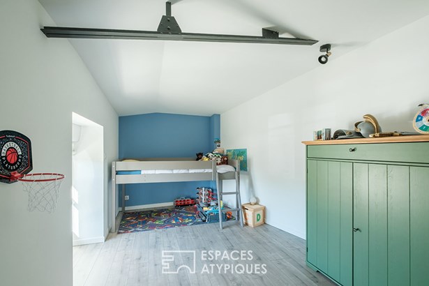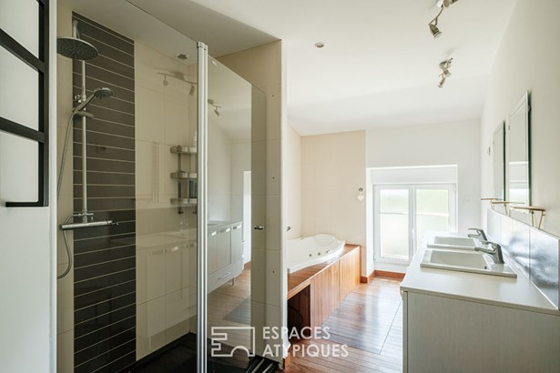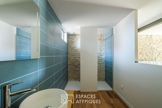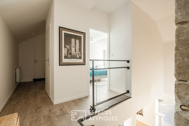 The ground floor features a fitted and equipped kitchen that opens onto a convivial dining area, extended by a utility room and separate toilet. The bright living room is captivating with its beautiful high ceiling and exposed stone walls, enhanced by a contemporary-design staircase. A vast master suite completes this level with an elegant shower room blending stone and modernity.