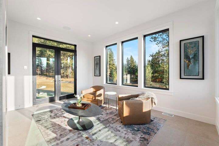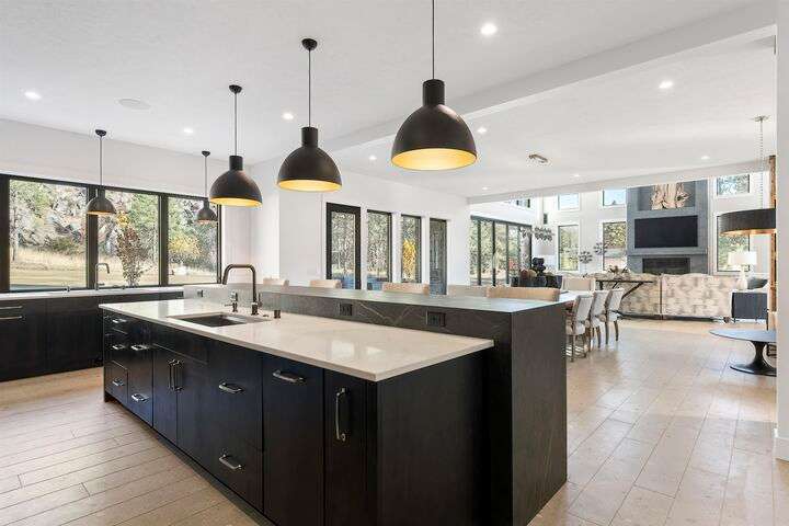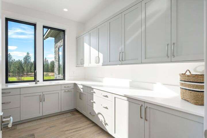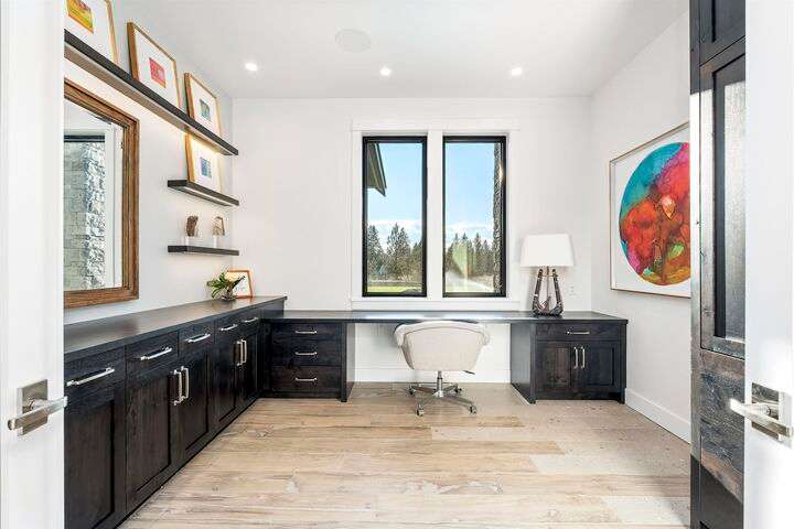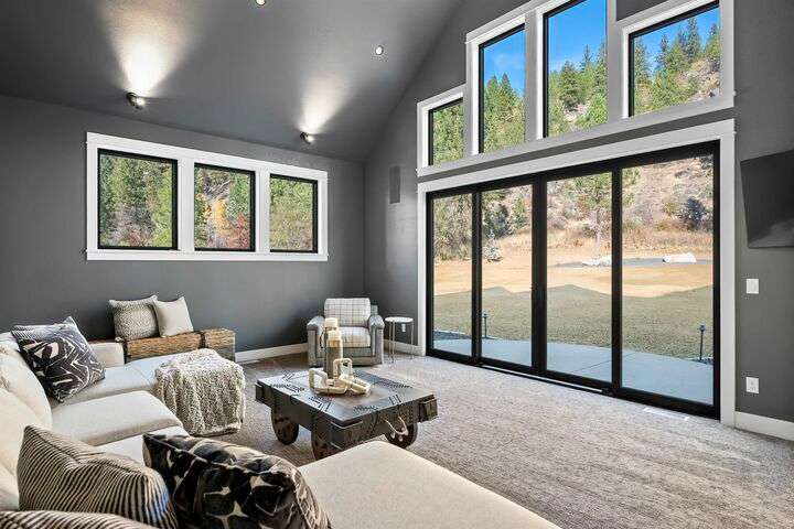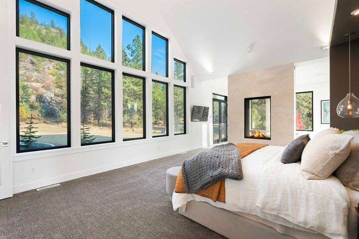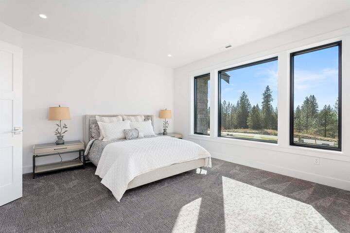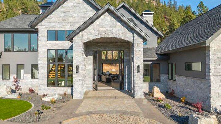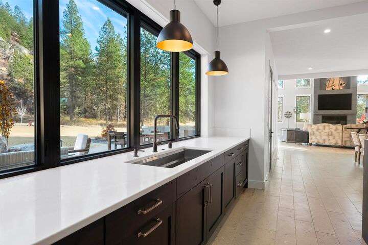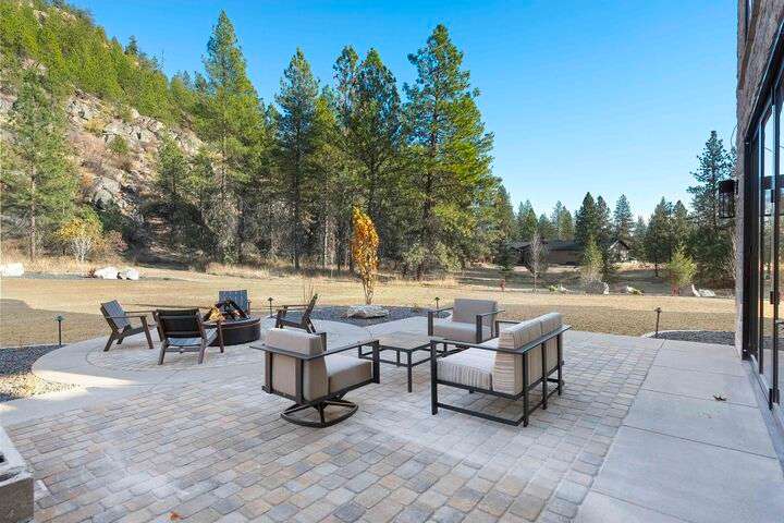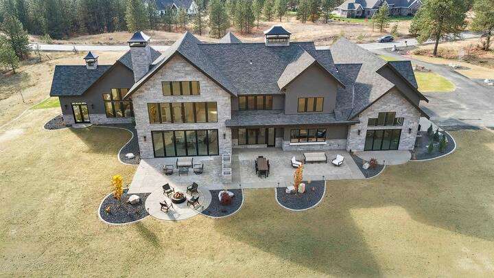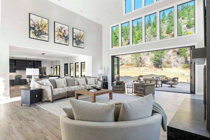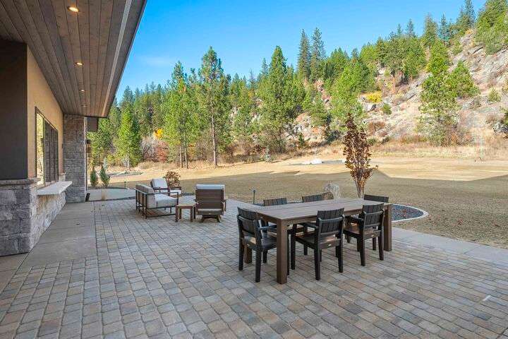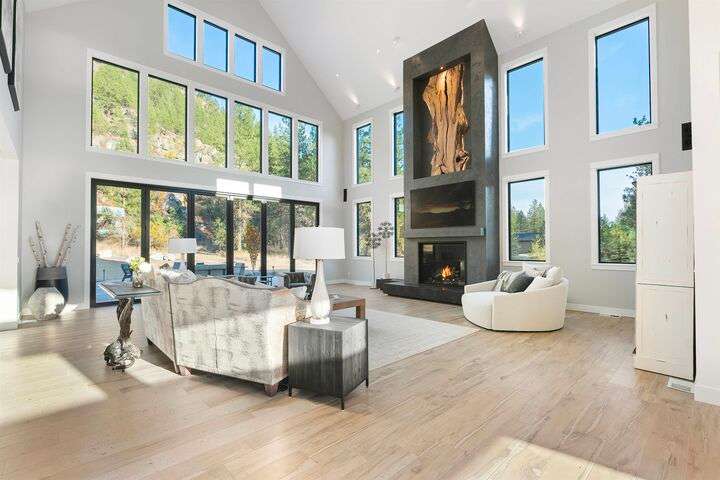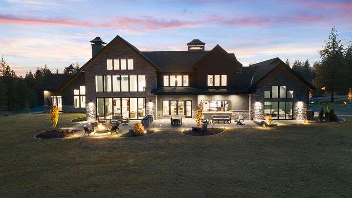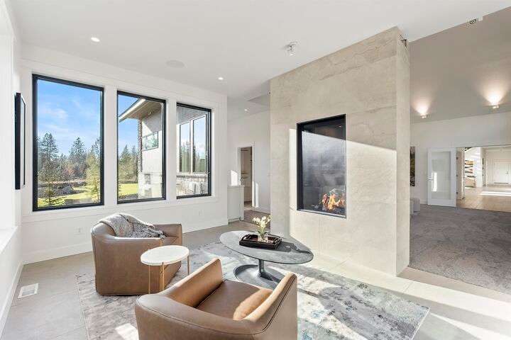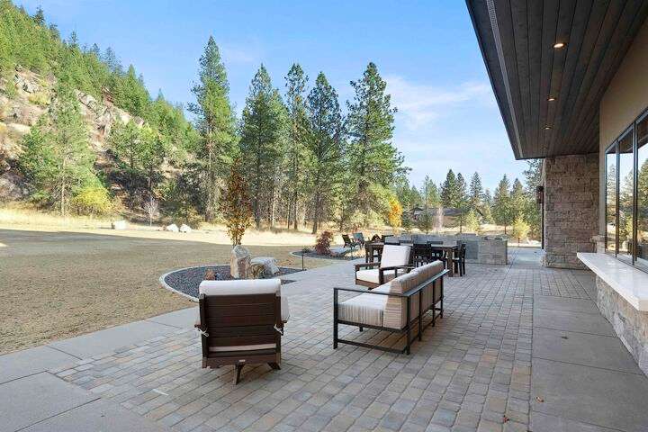 No detail has been overlooked in this luxurious modern masterpiece designed to showcase the exceptional mountain backdrop. Located on 20 spectacular acres behind the gates in exclusive Riverbluff Estates, the location is private + serene, yet only minutes from shopping, restaurants, coveted St. George's School, Little Spokane River Natural Area + Kalispel Golf + Country Club. This executive custom home features soaring ceilings, expansive spaces, a jaw-dropping Pivot entry door, a culinary dream kitchen w/butler's pantry + an opulent primary suite guaranteed to make you feel as though you are waking up in a lavish private resort every day of your life. Features include top-of-the-line appliances, 14' kitchen island, cozy wine tasting lounge, bedrooms w/walk-in closets + ensuite baths, home office w/custom built-ins + a spacious family room. Outside, you'll love the extensive paver patio w/built-in BBQ, custom accent lighting + gas fire pit. Ask about seller financing!