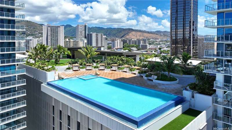 Brand-new, never-lived-in 2-bedroom, 2-bath corner unit with a wraparound lanai offering 180-degree views of the city, mountains, and ocean. Features luxury vinyl plank flooring throughout (no carpet), an open kitchen with a large counter-bar, soft-close cabinets, stainless steel appliances, quartz counter tops, and more. Split A/C in every room, a primary bedroom with a walk-in closet, a primary bathroom with a walk-in shower, and a dedicated laundry room. Includes two side-by-side parking stalls on level 4, conveniently located near the building entrance. Enjoy resort-style amenities with an infinity pool and whirlpool overlooking the city skyline, private BBQ pavilions, movie theater, indoor fitness center, yoga studio, sauna room, playground, dog park, and an elegant clubroom for private gatherings. Conveniently and centrally located, ideally situated in a walkable neighborhood with premier shopping, dining, and entertainment at nearby Ala Moana Center. On-site retail and a new international food court are coming to the building, adding even more convenience. ***Saturday Open House 11 am- 2 pm on Nov. 8, 2025***