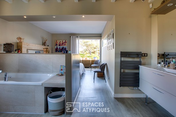 Outside, the wooden terrace extends into spacious areas around the heated swimming pool, creating an ideal relaxation space for sunny days. The enclosed, structured, and landscaped garden ensures complete privacy and a peaceful living environment, nestled between the sea and the forest. The petanque court promises enjoyable moments together.