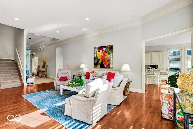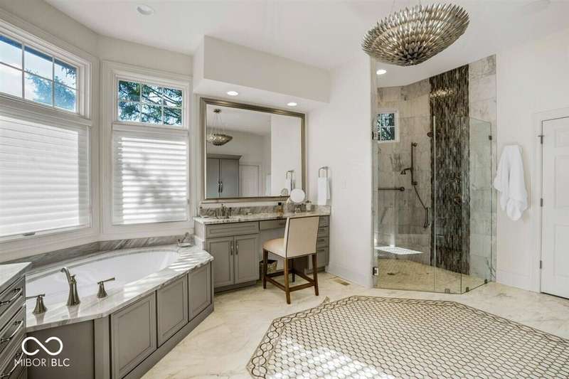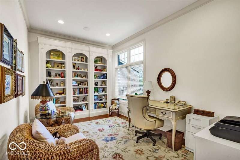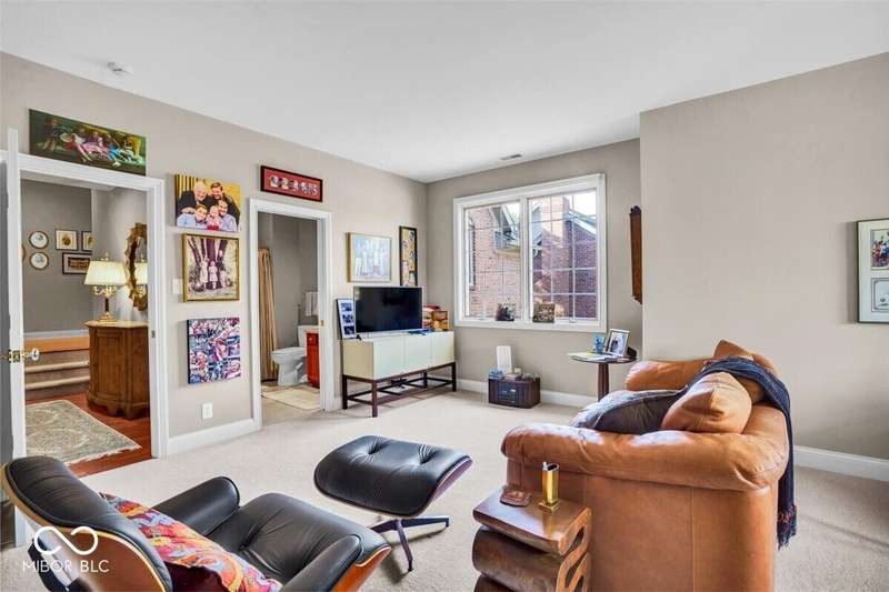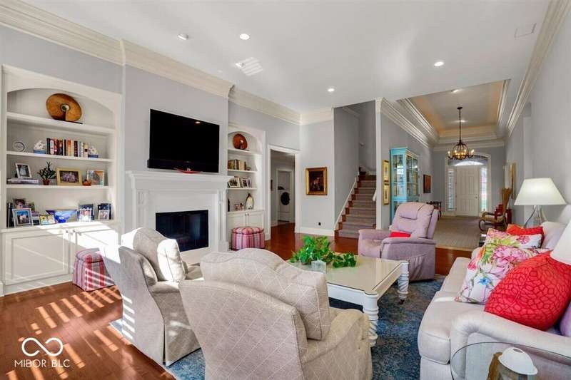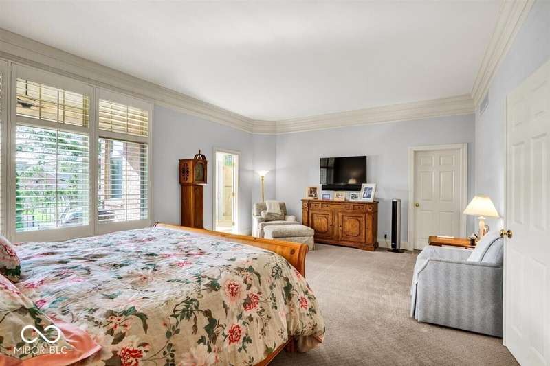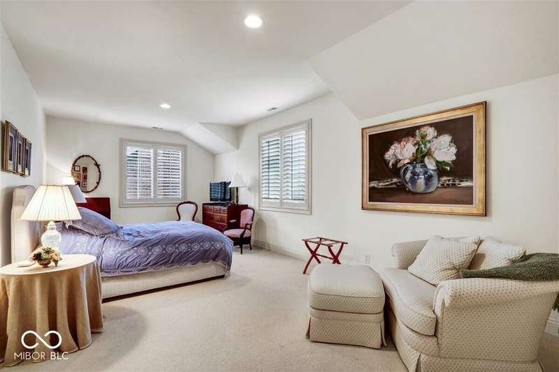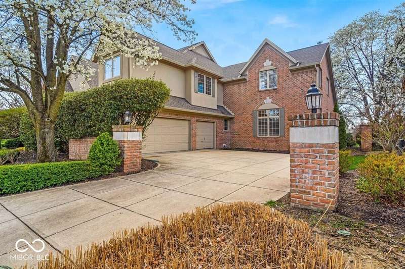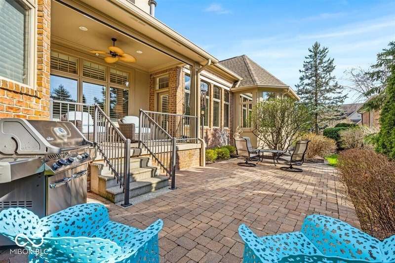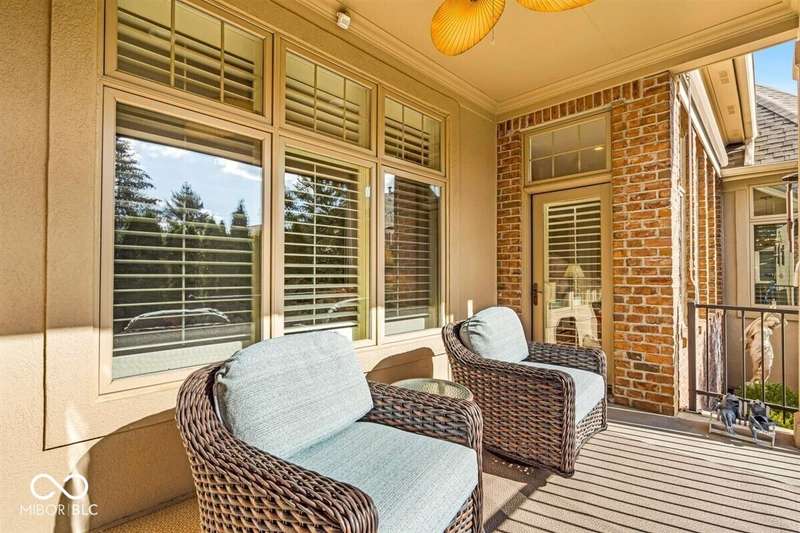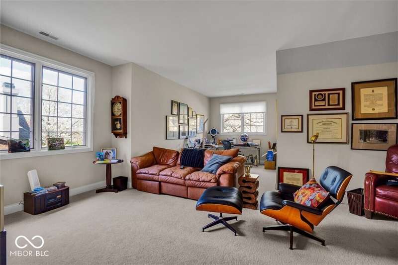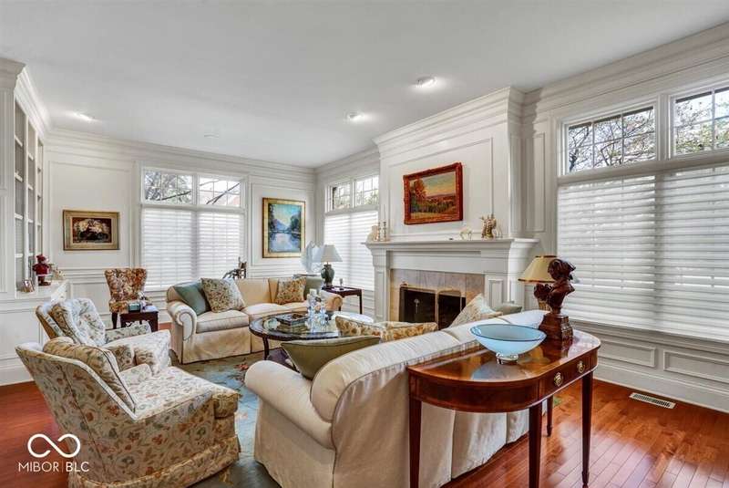 Updated and immaculate home in popular Reserve at Spring Mill! Main floor primary suite with completely updated bathroom including heated bathroom floors, zero threshold shower, separate tub and HUGE closet with many built ins. Primary bedroom has split cooling system to keep bedroom cool at night for sleeping. Main floor features spacious entry, living room with fireplace, large den, great room with fireplace and completely updated mantel and bookcases , kitchen with cream colored cabinetry, quartz countertops, Subzero refrigerator, Bosch double ovens, gas range, center island and breakfast bar plus breakfast room and large, private dining room! Upstairs features three more bedrooms ... one being used as a secondary office. The lower level has one finished room for exercise as well as TONS of extra storage space. Large covered porch as well as open patio in back yard with beautiful landscaping. Low maintenance living with all lawn care and snow removal included.