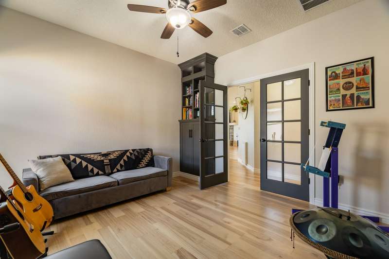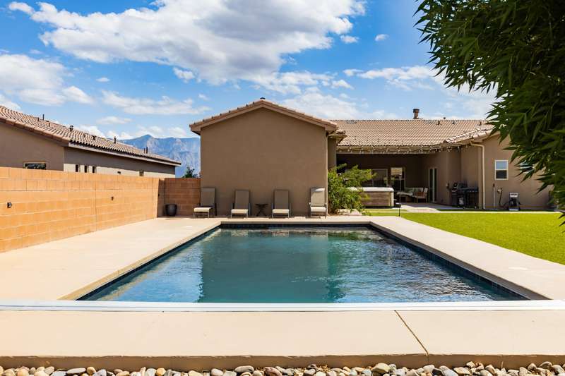 This amazing home will check some boxes! Mountain views! Single story! Total of 5/6 car garage with drive through option to the detached garage that could fit up to 3 cars). Backyard access! Pool! Hot tub! Wow! Enter to open great room, kitchen, dining concept w/great natural light & access to rear covered patio. Spectacular 3/4'' hardwood floors throughout except wet areas. Kitchen w/granite counters , gas stove, pantry & bar. Mountain views from dining rm. Custom blt-ins in office/flex space. Primary BR w/patio door to hot tub & pool. Two closets! Nice bath w/multi-head shower. Sue Cleveland High School, Mountain View Middle School & Sandia Vista Elem. Lovely home to live in and space to enjoy all your hobbies and fun!