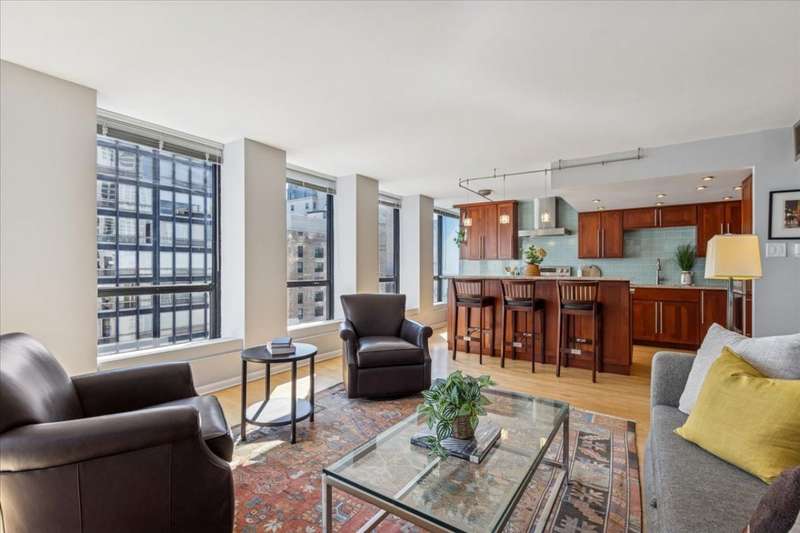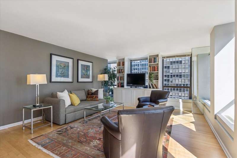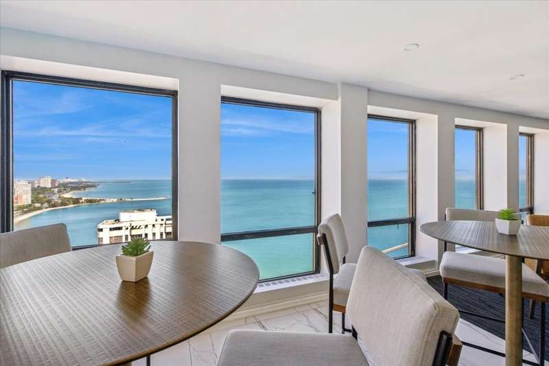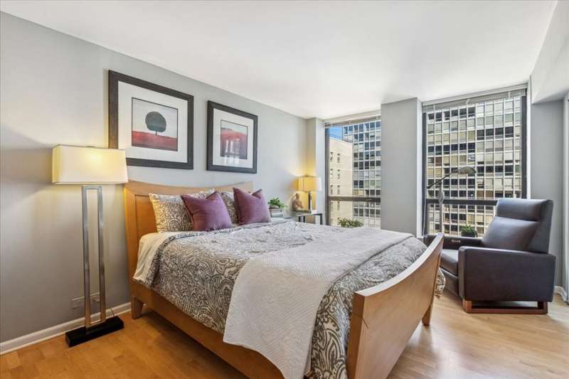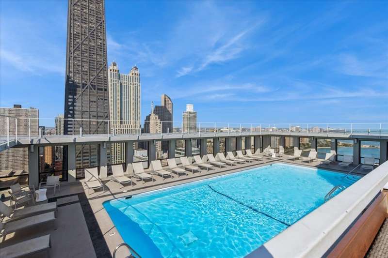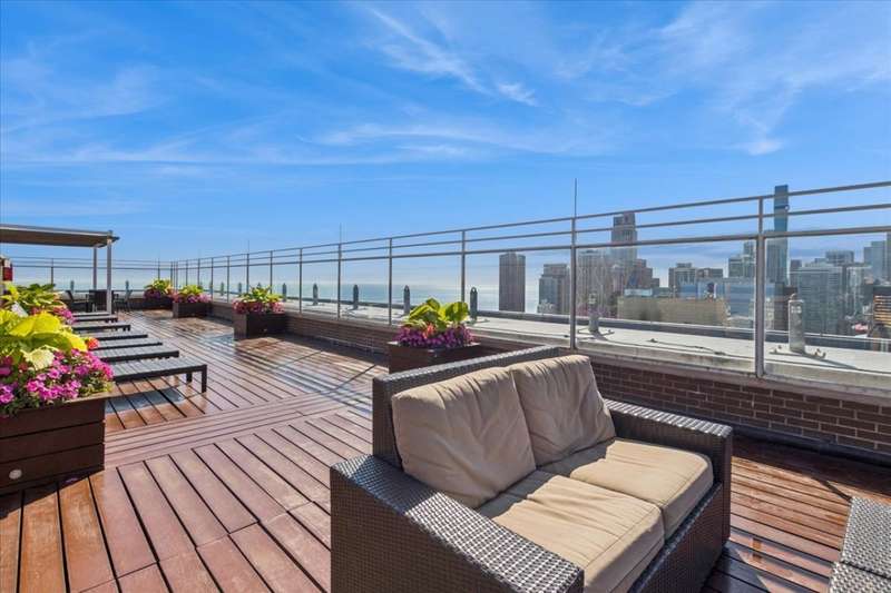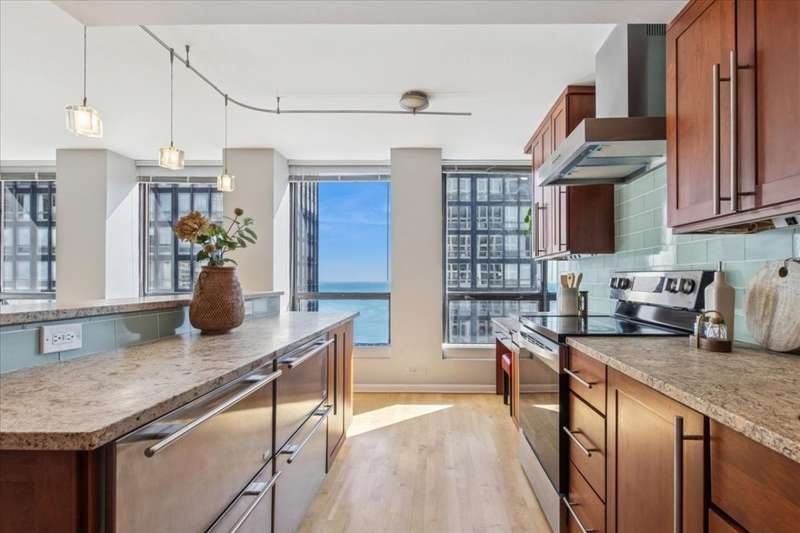 Step into this bright and inviting one bedroom, one bath residence where walls of northeast facing windows fill the home with natural light and frame stunning views of Lake Michigan. The thoughtfully designed layout offers exceptional storage, including wall to wall closets in the bedroom along with two additional hall closets for coats and linens. The open concept kitchen and living area creates a seamless flow for both entertaining and daily living. A chef's delight, the kitchen has been reimagined with sleek stainless steel appliances, a rare side by side double drawer refrigerator and freezer, a matching drawer style dishwasher, and a charming built in planning desk for added function. Building amenities include an expansive sundeck with views of the city and Lake Michigan, outdoor pool, party room, on site management and maintenance, well appointed fitness center and yoga/cardio room, receiving room, bike storage, valet parking, and more. With its modern updates, smart design, and captivating lake views, this home is as practical as it is beautiful, making it a true standout at the iconic Plaza on DeWitt.