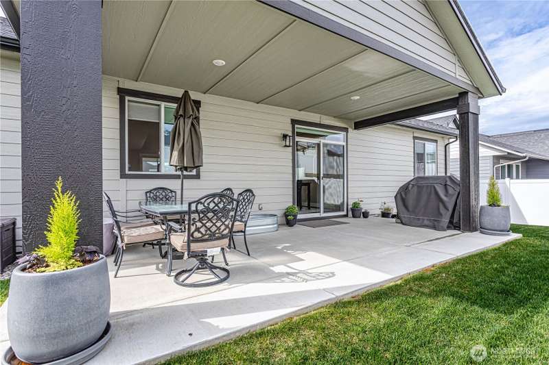 Beautifully designed 4 bedroom, 2 bath home with 2,093 sqft of open living space. A large dormer and vaulted 9 ft ceilings create an airy feel throughout the great room, dining, and kitchen. Kitchen features a gas range, oversized island with seating, walk-in pantry, and under-cabinet lighting. The primary suite offers a 5-piece bath w a custom-tiled shower and large walk-in closet. Upgrades throughout including Moen fixtures, LVP and ceramic tile flooring, and a laundry room with storage. Enjoy the covered patio plumbed with gas BBQ hookup, oversized 3-car garage, and owned energy-saving solar panels.