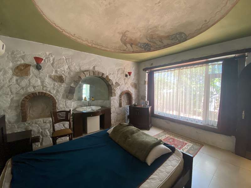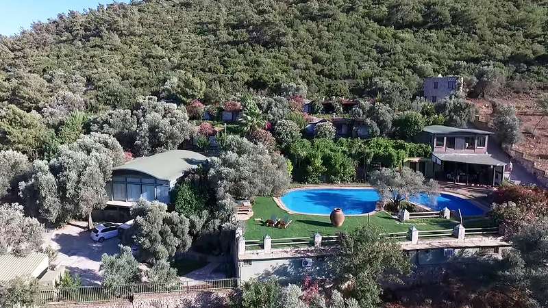 The living complex, covering an area of 3,500 m², consists of 8 stone structures built among olive, mandarin, and lemon trees, totaling 1,025 m² of closed area. Designed in different types, there are a total of 9 independent units with open-plan, 1 and 2-bedroom options, furnished with fully equipped kitchens. The complex, located in a unique position, features a semi-Olympic swimming pool, 29 olive trees, and numerous fruit trees. Surrounded by stone walls, the complex is suitable for various uses such as boutique hotel, therapy center, seminar center, or healthy living center.