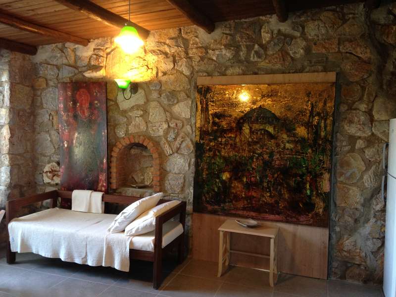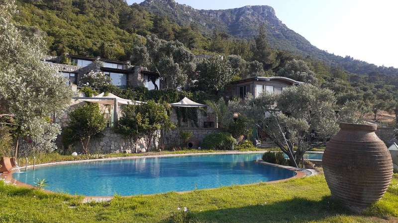 The sea-view country houses are located in Golkoy, one of Bodrum's most popular holiday destinations. Furnished stone structures with a mystical atmosphere are nestled in a forest of pine and olive trees.