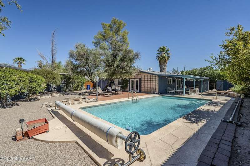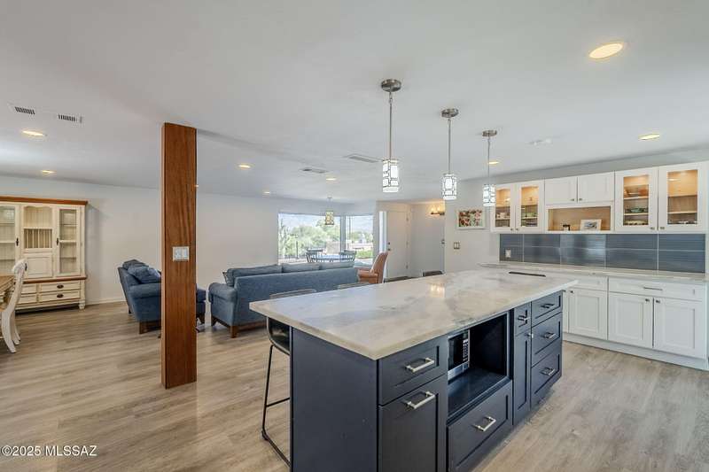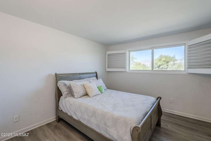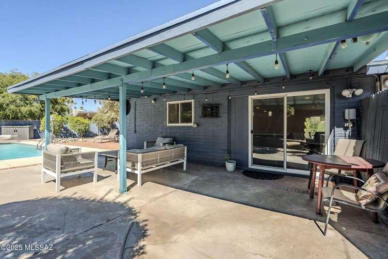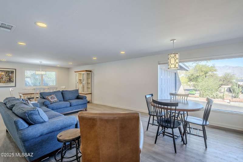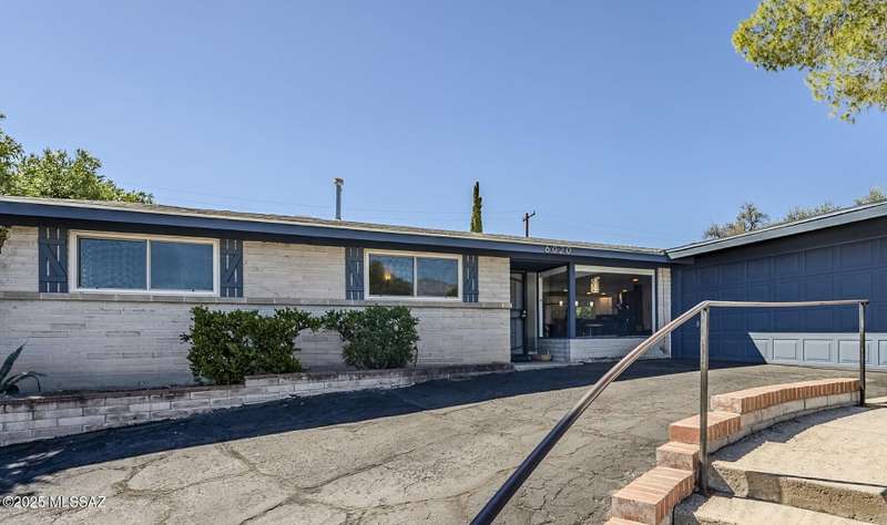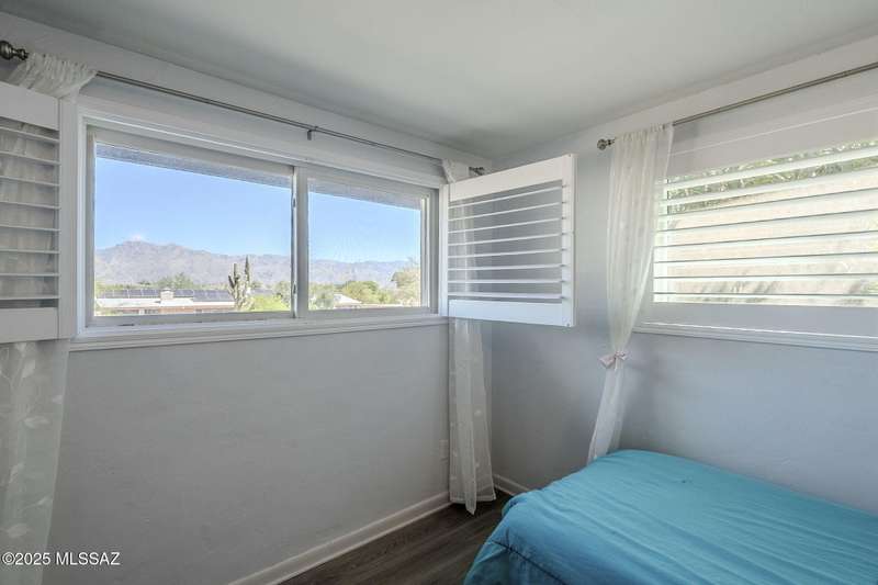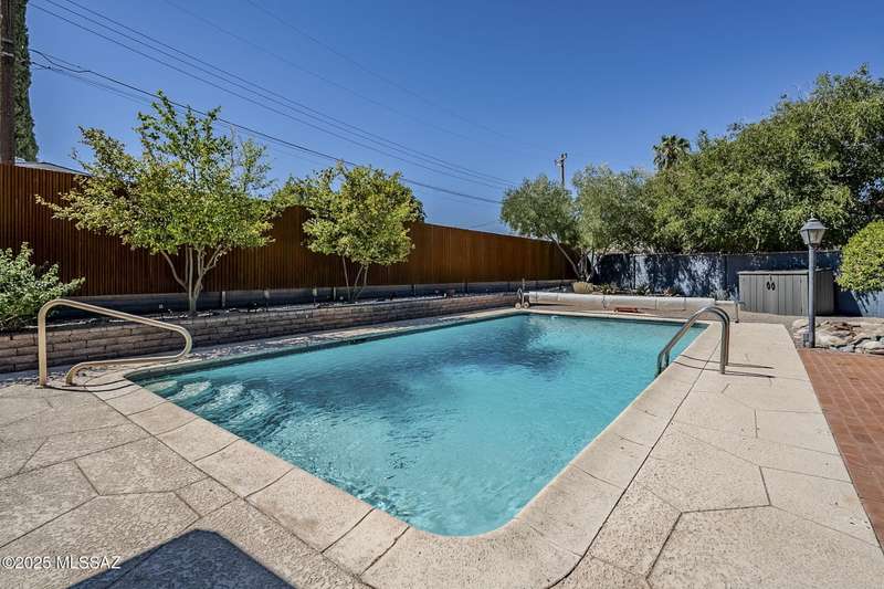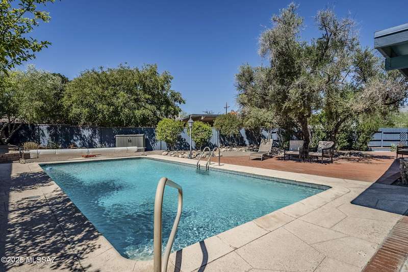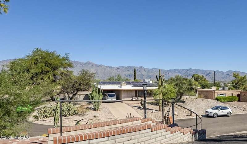 Rare in-town hilltop lot offers sweeping Catalina Mountain views, ultimate privacy -a home designed for modern living with expansive kitchen with a huge island--perfect for cooking, gathering, & entertaining. Very open great room. Plantation shutters add timeless charm & help frame the natural light that fills each room. 4 bedrooms are spacious -2 with great views! Both baths updated with contemporary tile & fixtures. Updated windows & lighting throughout. Home seamlessly opens to very private outdoor living. Deep covered patio, sparkling pool, mature landscaping & lots of spaces for entertaining & relaxing. New, corrugated steel fencing with double gate. Side yard with shed., New Roof in 2024. Garbage conveniently goes out into back alley via small gate. 2 car garage. No carpet & no HO