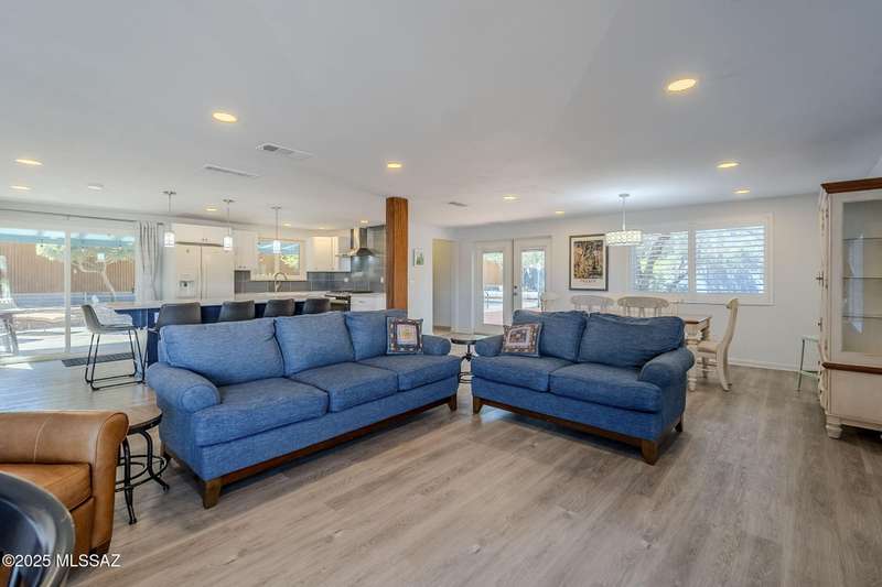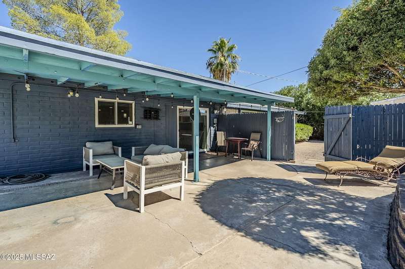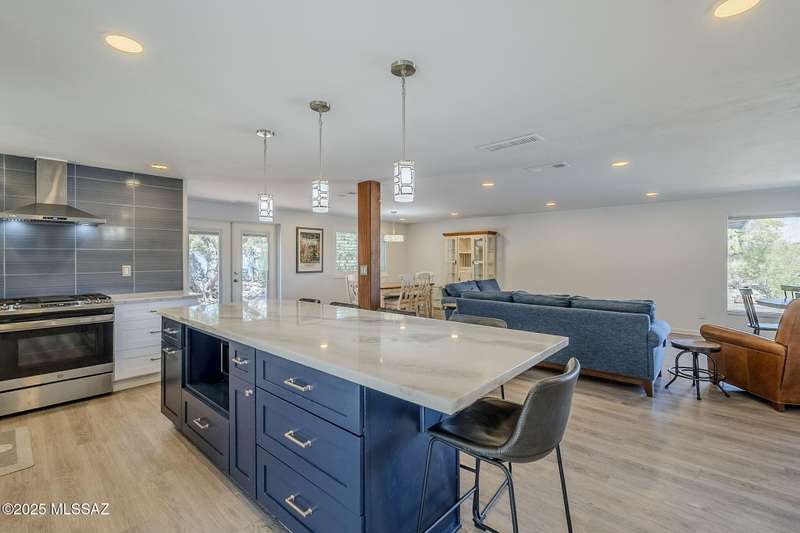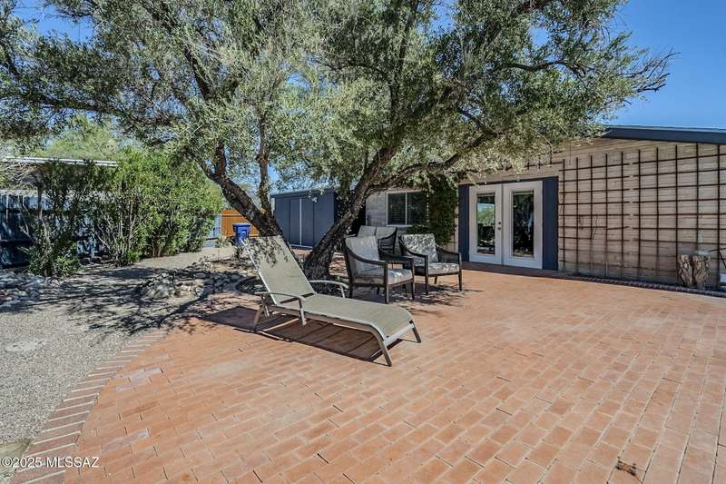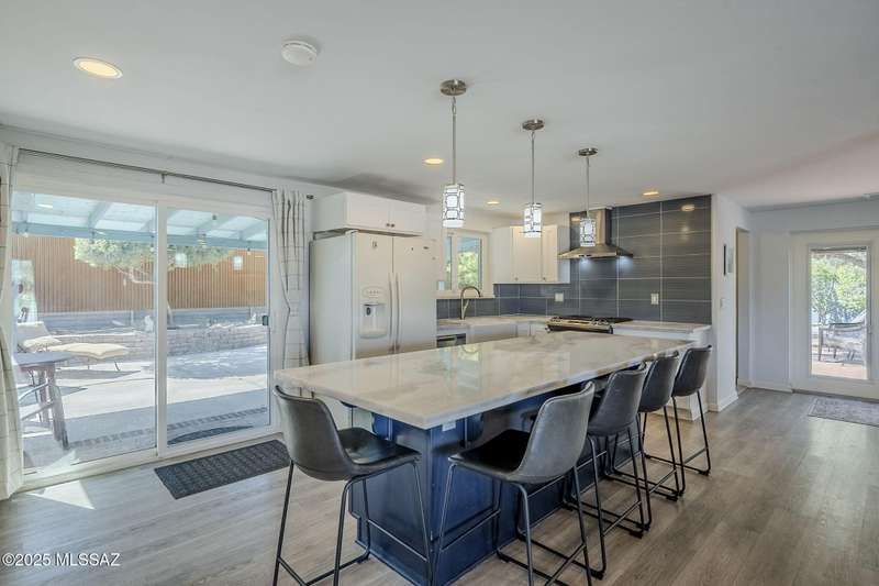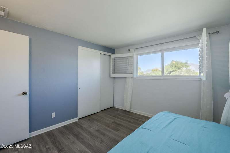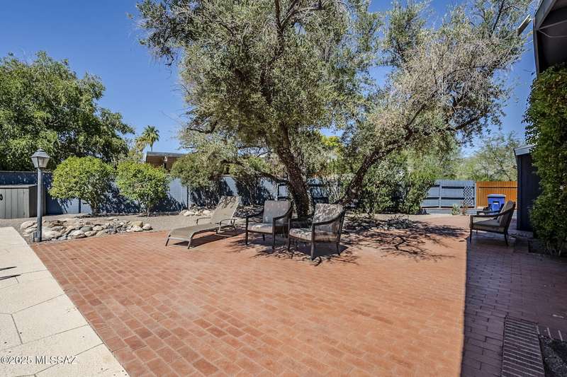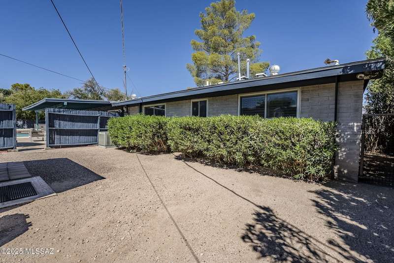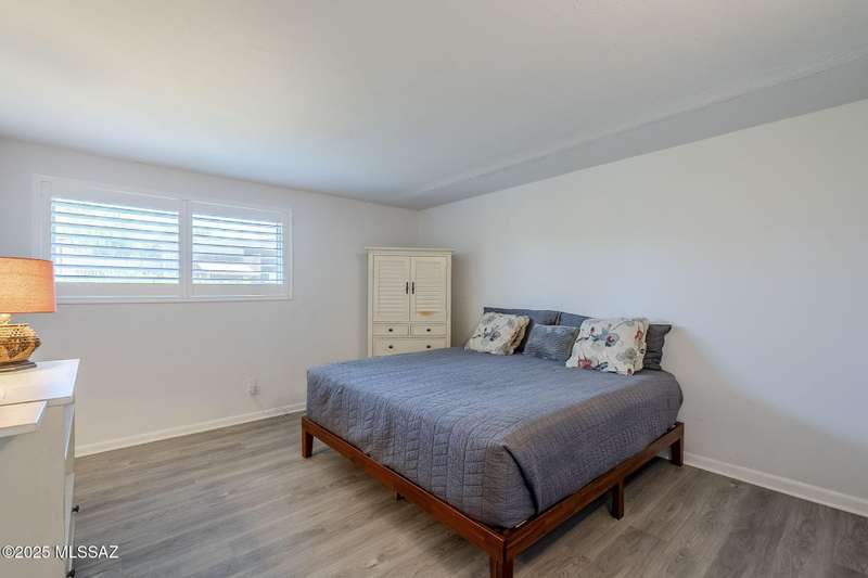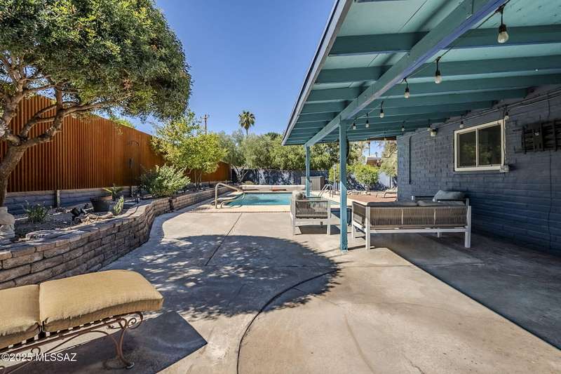 Rare in-town hilltop lot offers sweeping Catalina Mountain views, ultimate privacy -a home designed for modern living with expansive kitchen with a huge island--perfect for cooking, gathering, & entertaining. Very open great room. Plantation shutters add timeless charm & help frame the natural light that fills each room. 4 bedrooms are spacious -2 with great views! Both baths updated with contemporary tile & fixtures. Updated windows & lighting throughout. Home seamlessly opens to very private outdoor living. Deep covered patio, sparkling pool, mature landscaping & lots of spaces for entertaining & relaxing. New, corrugated steel fencing with double gate. Side yard with shed., New Roof in 2024. Garbage conveniently goes out into back alley via small gate. 2 car garage. No carpet & no HO