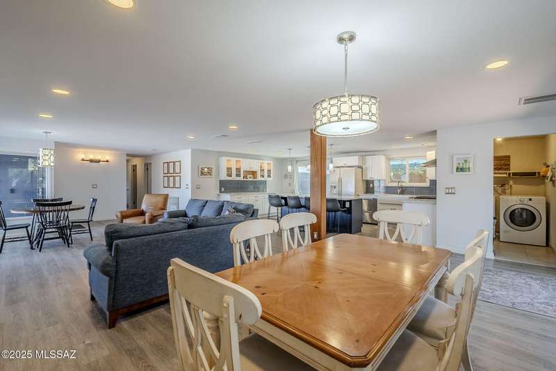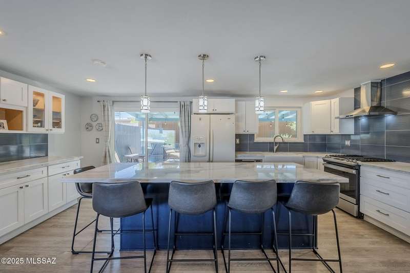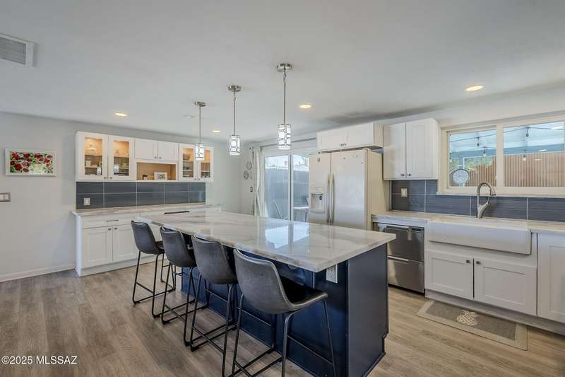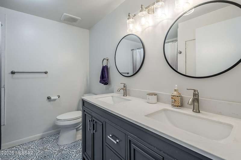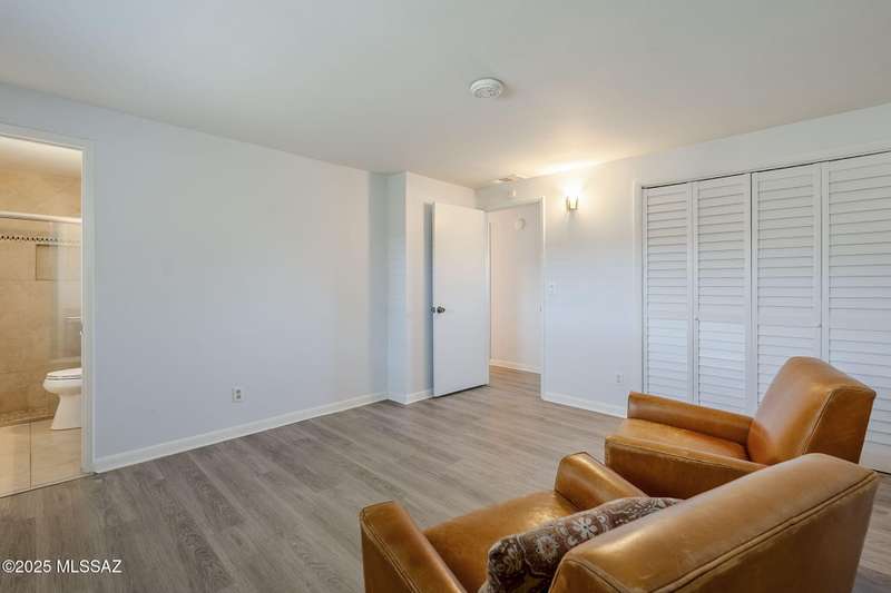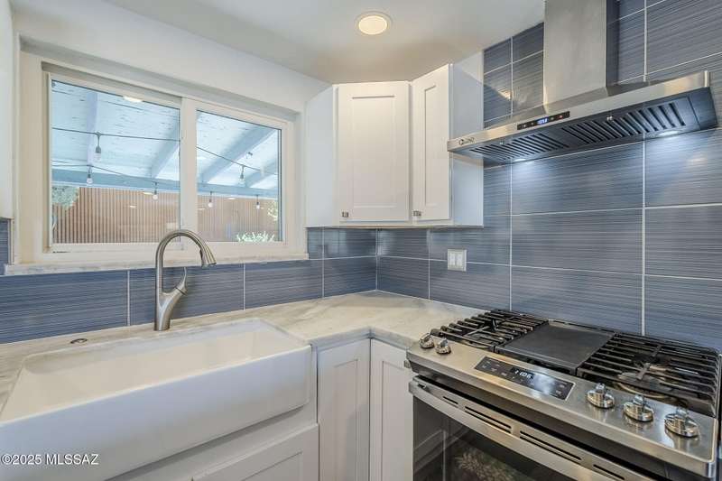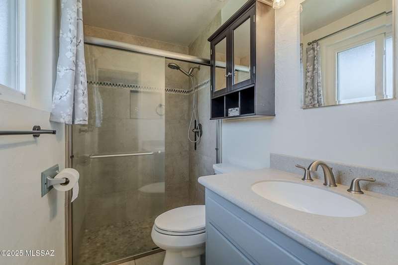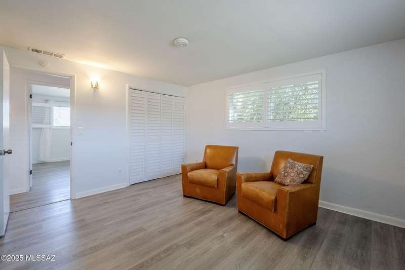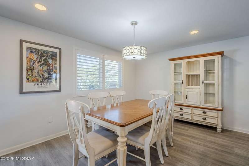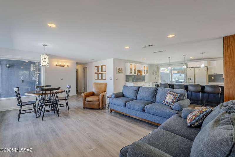 Rare in-town hilltop lot offers sweeping Catalina Mountain views, ultimate privacy -a home designed for modern living with expansive kitchen with a huge island--perfect for cooking, gathering, & entertaining. Very open great room. Plantation shutters add timeless charm & help frame the natural light that fills each room. 4 bedrooms are spacious -2 with great views! Both baths updated with contemporary tile & fixtures. Updated windows & lighting throughout. Home seamlessly opens to very private outdoor living. Deep covered patio, sparkling pool, mature landscaping & lots of spaces for entertaining & relaxing. New, corrugated steel fencing with double gate. Side yard with shed., New Roof in 2024. Garbage conveniently goes out into back alley via small gate. 2 car garage. No carpet & no HO