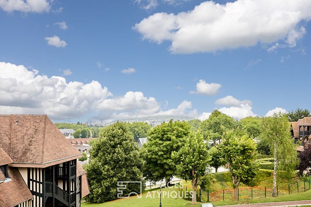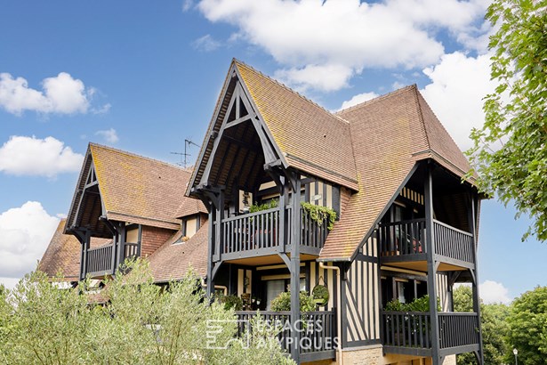 Just 50 meters from the Deauville-La Touques racecourse and the Elie Brignac auction room, this triplex of approximately 79 sqm, located within an elegant luxury Norman residence, seduces with its private character and its four ideally oriented terraces. It also benefits from access to an indoor swimming pool within the condominium, a rare comfort just a stone's throw from the city center. From the entrance, the tone is set: bright volumes, careful decoration, and a warm atmosphere. The main living room, friendly and bathed in light, extends onto two southwest-facing terraces, true outdoor extensions to fully enjoy each season. The open kitchen, fully fitted and equipped, integrates seamlessly into the whole. Upstairs, a charming living room, intimate and cozy, opens onto two new terraces that invite relaxation and reinforce the feeling of space. A comfortable bedroom and an elegantly decorated bathroom with a walk-in shower and vanity unit complete this level. The top floor houses a charming attic bedroom, highlighted by a beautiful exposed beam, as well as a bathroom with a bathtub. The four terraces, judiciously distributed over the different levels, allow you to fully enjoy an outdoor living environment. The half-timbered architecture of the residence, inspired by the traditional Norman style, blends harmoniously into a green and peaceful environment. In close proximity to beaches, shops, schools, and renowned equestrian facilities, the location offers a quality of life rare in Deauville. A unique property, ideal for horse racing enthusiasts or simply lovers of Deauville. Property subject to co-ownership status. 127 residential lots. Annual amount of co-ownership fees: EUR4,620. No proceedings in progress. ENERGY CLASS: E / CLIMATE CLASS: B. Estimated annual energy expenditure for standard use, based on average energy prices indexed for the years 2021, 2022 and 2023 (including subscription): between 1600 euros and 2220 euros. Information on the risks to which this property is exposed is available on the Georisques website: [www.georisques.gouv.fr](http://www.georisques.gouv.fr)