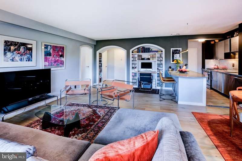 Welcome Home! Step into this architecturally designed one-bedroom condo, where unique craftsmanship meets modern comfort. A stunning archway greets you as you enter this bright and inviting space. The open layout features custom built-in bookshelves and a convenient work desk-perfect for a home office or reading nook. Enjoy elegant Porcelanosa flooring throughout, with matching tile and stylish fixtures in the bathroom. The contemporary kitchen is equipped with premium KitchenAid stainless steel appliances, offering both function and flair for your culinary creations. Step out onto the private balcony to relax or entertain guests-an ideal extension of your living space. This thoughtfully designed home combines distinctive character with modern finishes for truly exceptional urban living. This full-service building offers an impressive array of amenities, including a 24-hour doorman and front desk, on-site grocery store, beauty shop, library, gym, community room, outdoor pool, and tennis court. Set on beautifully landscaped, well-maintained grounds, this residence combines convenience, comfort, and resort-style living all in one. Garage space B1-138