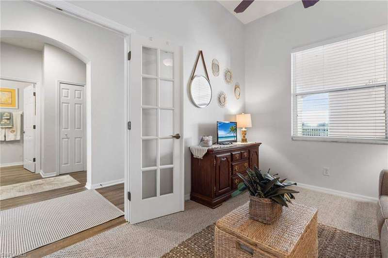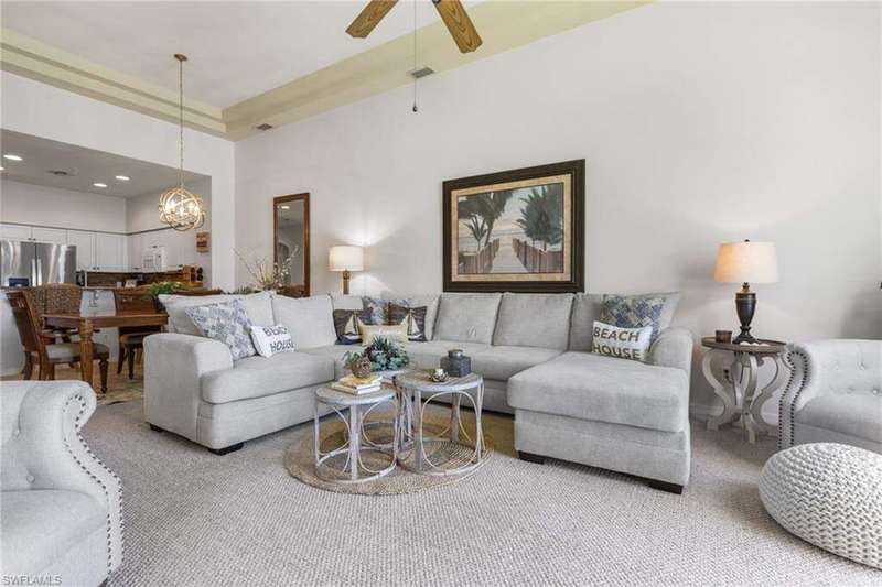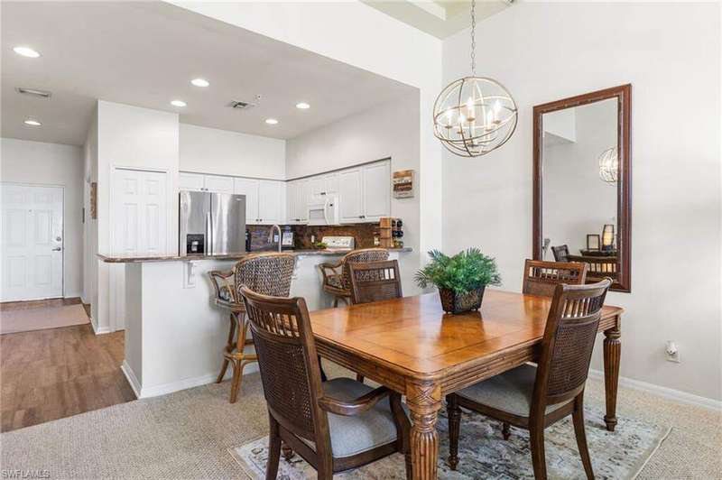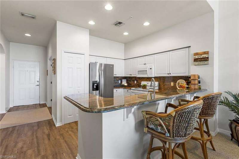 Your TURNKEY PENTHOUSE retreat awaits! Experience resort-style living in this stunning 2-bedroom + den, 2-bath condo in the highly sought-after Bellavista neighborhood of Gulf Harbour Yacht & Country Club. This top-floor CORTINA floor plan offers over 1400 sq. ft. of elegant living space with soaring 11-foot ceilings, double tray ceilings and breathtaking views of the 16th fairway and the shimmering lake beyond. The open-concept design is ideal for entertaining, featuring a kitchen with granite countertops, a breakfast bar, and stainless steel and white appliances. Enjoy the perfect balance of comfort and style with luxury vinyl plank as well as carpeting in the main living area, creating a warm, inviting atmosphere. The primary suite is a peaceful haven with an ensuite bathroom with a separate walk in shower with a seamless glass enclosure and a lovely garden tub. The primary suite also offers private lanai access - the perfect place to relax with your morning coffee or unwind after a day on the course. A split floor plan ensures privacy for guests, while the den offers flexibility as a home office or additional bedroom. Additional highlights include: Top-floor location for added privacy and panoramic views Overszed two-car garage providing convenience and extra storage Screened lanai overlooking the golf course and lake Gated, 24-hour security for peace of mind Turnkey furnishings available for immediate enjoyment Private memberships are available for separate purchase and provide access to Gulf Harbour's world-class amenities: golf, marina, tennis, fitness center, spa, and dining. Don't miss your chance to enjoy the Gulf Harbour lifestyle in this beautifully maintained, move-in ready home!