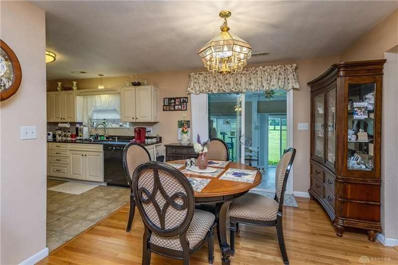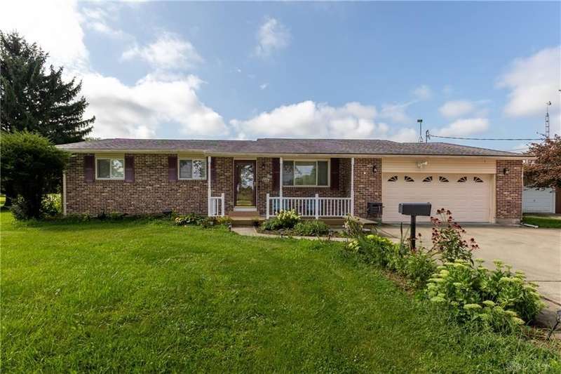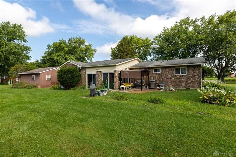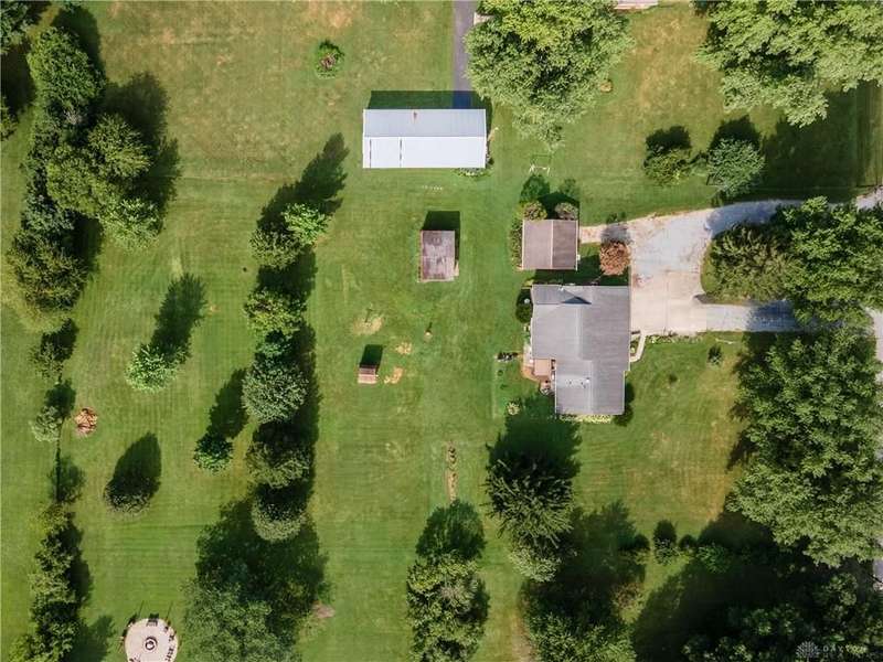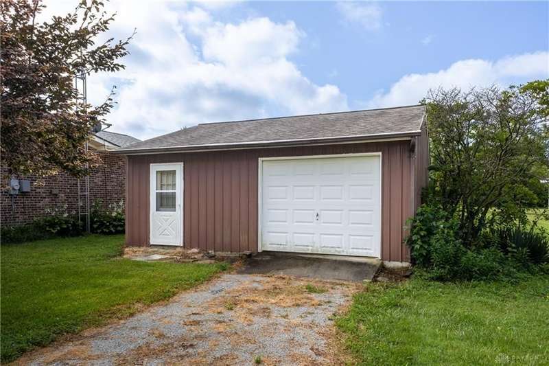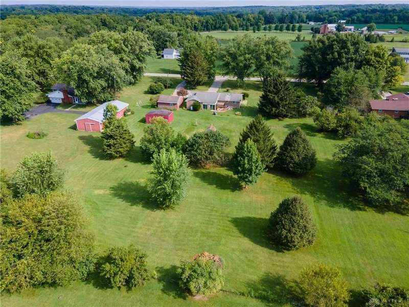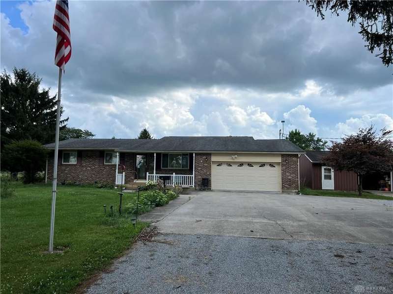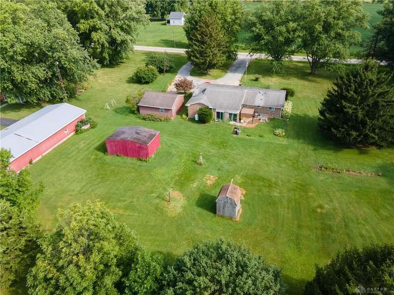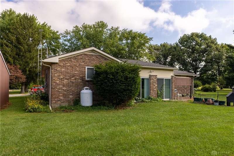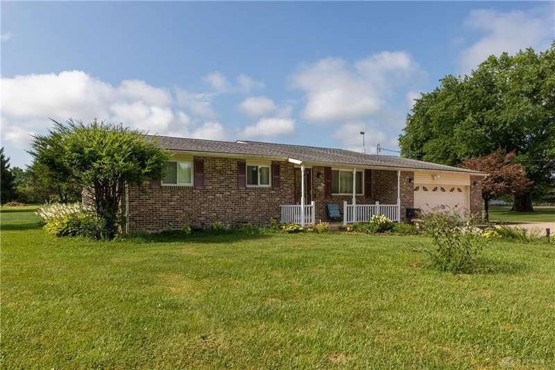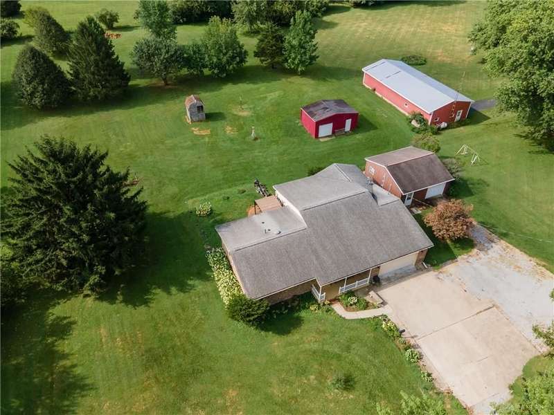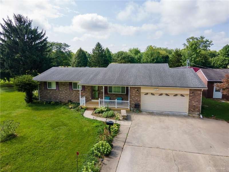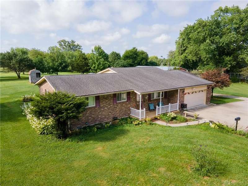 Welcome to country living. Maintenance free Total brick, 3 bedroom, 1.5 baths house on 1.8170 acres. Large living room with accenting gas fireplace opens to the dining room and remodeled kitchen featuring white wood cabinets, pantry with pull out shelving plus granite counter top. Appliances staying. Enjoy working at the kitchen sink overlooking the large rear yard, patio with a pergola. Study/office has extra large closet for storage. Relax in the private family room area. Hallway leads to 3 bedrooms, main bathroom. Primary bedroom has half bath with frosted glass window for privacy. Amazing real hardwood floors throughout. Replacement vinyl windows. Attached enclosed porch. Attached finished 2+ car garage with workbenches staying. Detached garage has workshop and 1 car parking area. Outbuilding shed with loft for storage. Playset staying. Mature trees and nicely landscaped.