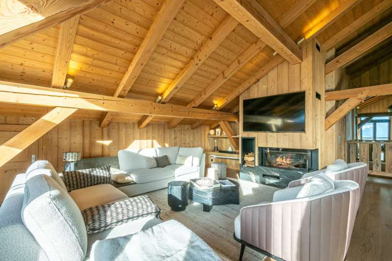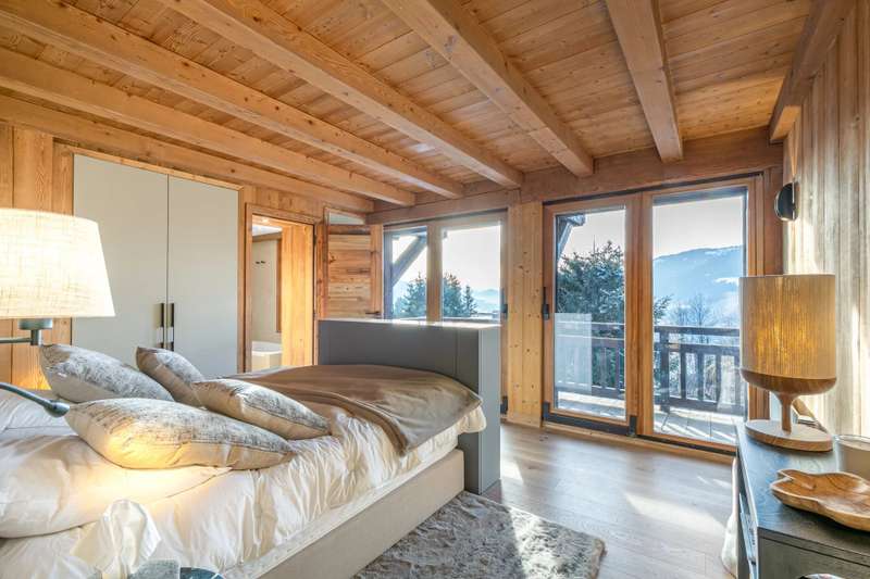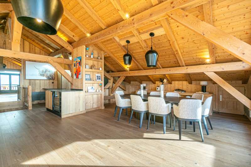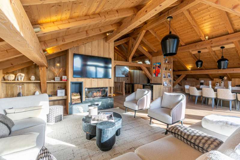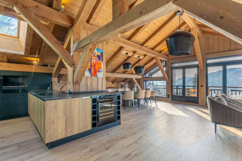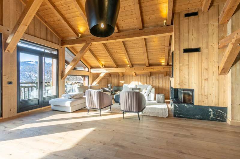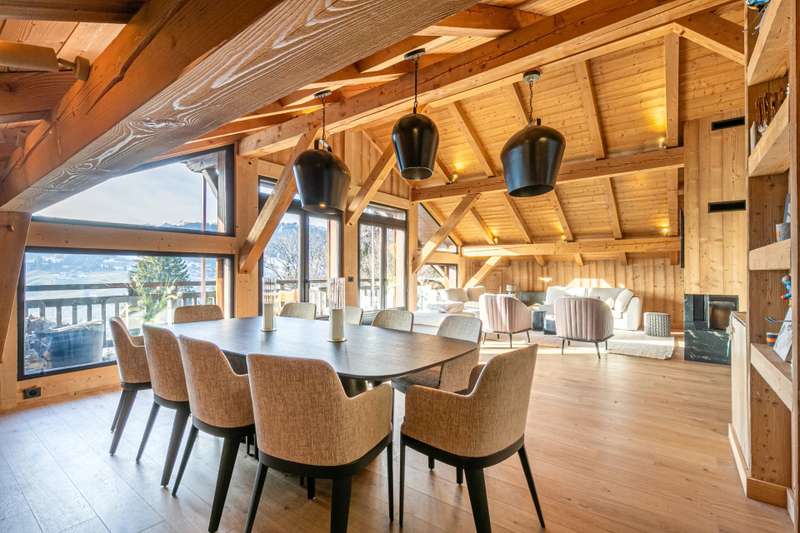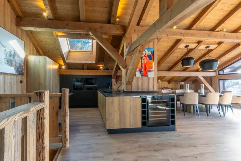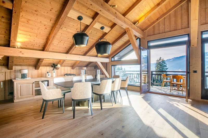 Ideally located on the heights of Megève, this flat enjoys a privileged location, close to the ski slopes and the Mont d'Arbois Golf course, with the option of returning by ski. Completely renovated, furnished and decorated to a high standard, it offers 230 sqm of living space (190 m² Carrez Law). On the first floor, a master bedroom with balcony has a bathroom with shower, bath and WC. Three further double bedrooms, each with storage space, have their own shower room and WC. A fifth bedroom, designed as a children's dormitory with four bunk beds, comes with its own shower room and WC. On the upper floor, a vast cathedral-style living room, bathed in light thanks to large bay windows, houses a kitchen that opens onto the lounge. This space leads onto a south-west-facing terrace with uninterrupted views of the Jaillet and Mont Charvin ranges. A utility room, equipped with a second fridge, an additional dishwasher and plenty of storage space, completes this level. The flat also has two guest WCs, one on each floor. The property is complemented by two enclosed garages, two large cellars and two outdoor parking spaces.