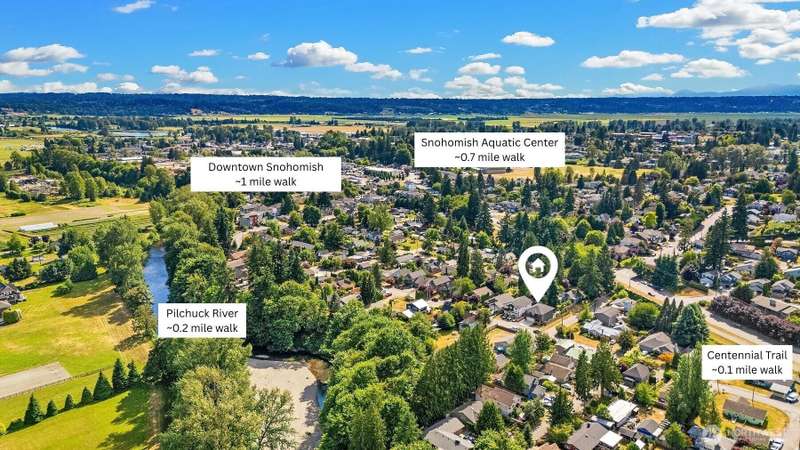 Ideally located 2021-built home on a bright corner lot with incredible walkability. Just blocks from the Centennial Trail, Morgantown Park w/ River access, Snohomish Aquatic Center, Library, & downtown Snohomish. A covered porch opens to a vaulted entry. An open-concept great room features living room w/ gas fireplace, dining w/ upgraded glass-paneled doors, & kitchen w/ SS appliances, gas stove, island seating, & pantry. Upstairs is a primary bedroom w/ walk-in closet, ensuite bath, + three additional bedrooms, full bath, & laundry room. Fully fenced backyard has a covered patio, custom landscaping, garden space, & fire pit area. Recent updates include fresh interior paint & heat pump with A/C. Walking distance to trails, shops, & dining.