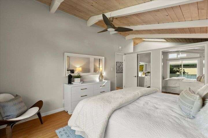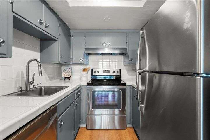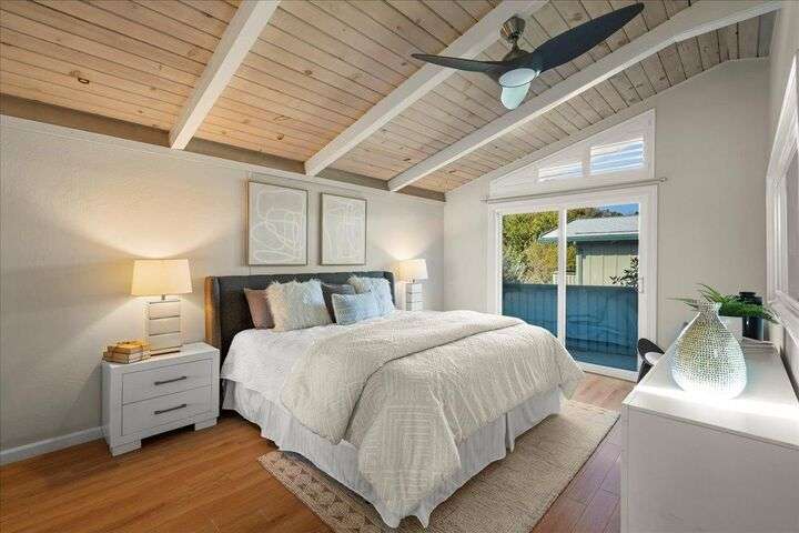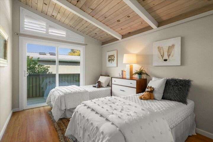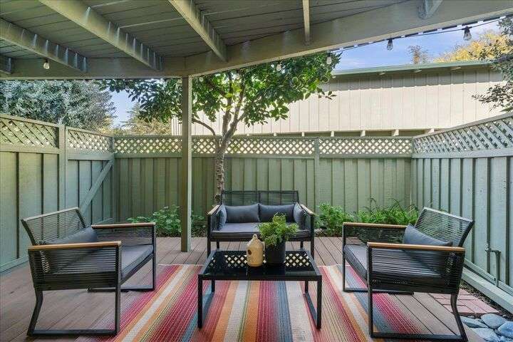 Lovely townhouse-style condo with private yard and top Los Altos schools! Prime location on the Palo Alto/Los Altos border in a walkable neighborhood near parks, shopping. Bright 2-bed, 1-bath home, wood floors throughout, vaulted wood-beamed ceilings, and updated kitchen with stainless steel appliances and tiled countertops. Primary bedroom offers two closets, ceiling fan with remote, and LED lighting. Private yard with new Trex decking, carport with storage, community pool, and on-site laundry. Minutes to San Antonio Center, Caltrain, shops, and dining.