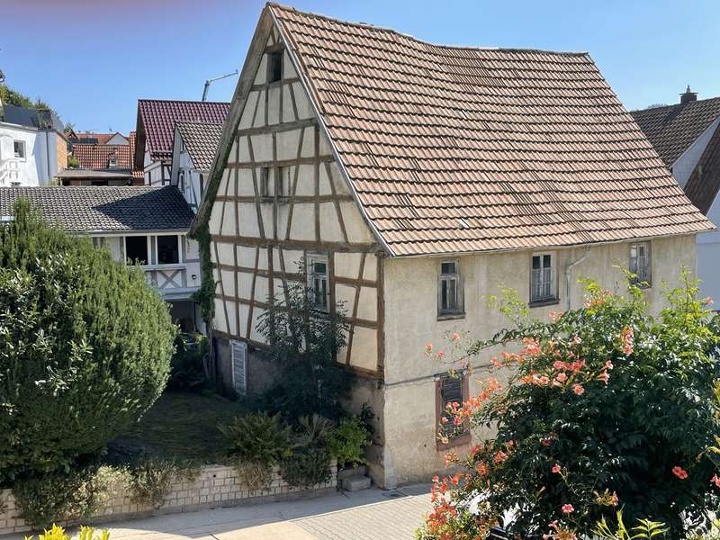 On the outskirts of Fürth, on a gentle slope with a beautiful view over the town and the Odenwald mountains, stands this two-family house with granny apartment and a historic half-timbered house on a large plot. The property, built in 1979, was renovated in 2004. The heating, radiators, windows and kitchen were renewed. The house is in a ready-to-move-in condition. Only the granny apartment requires renovation. The house can be reached via a large driveway. Due to the hillside location, several steps lead up to the first floor. A tiled, large and covered terrace is located in front of the house entrance. The first floor has been completely renovated. A bright hallway leads into the rooms in a star shape. The spacious, new kitchen is unused and open to the living and dining area. The living room has many windows and direct access to the balcony with a view of the garden. A bedroom and a children's room as well as a bathroom complete this floor. The cozy top floor has the same floor plan as the first floor, but is smaller due to the sloping ceilings. Here, too, there is a lovely balcony-terrace with a wonderful view. Due to the hillside location, the granny apartment has bright rooms and access to the garden. A separate kitchen, a living and dining room, a bedroom and a bathroom make up this self-contained living unit. Two cellar rooms and two garages are also located on this level. The garden area around the property is terraced and offers various possibilities for use. The house is ideal for a large, multi-generational family or as a rental investment. The energy certificate is currently being prepared. Another highlight is the old half-timbered house built around 1700, which stands on the front part of the property and is eager to be awakened from its slumber. After a complete renovation, it could be restored to its former glory. However, the half-timbered house can be left in its current state if it is not renovated.