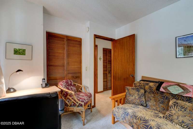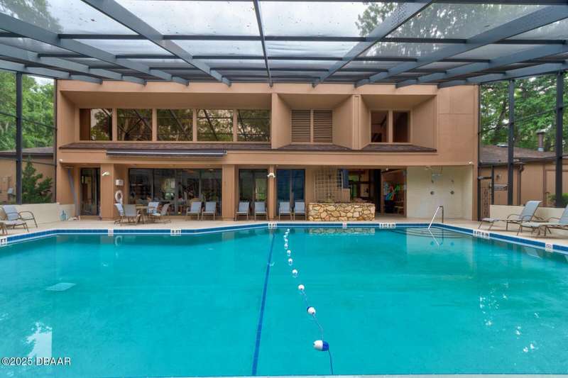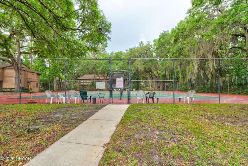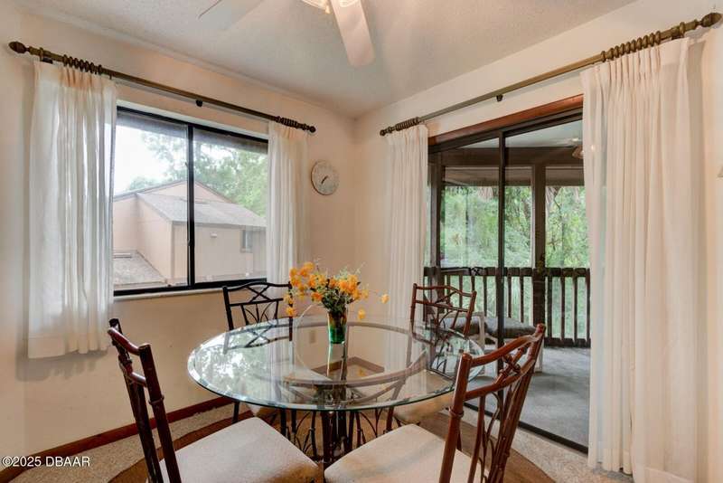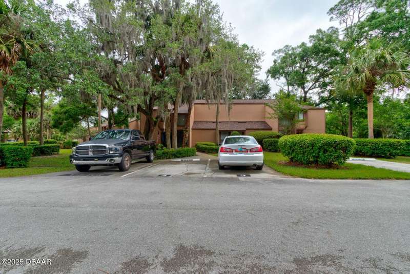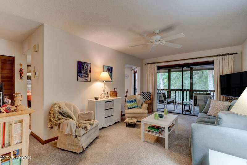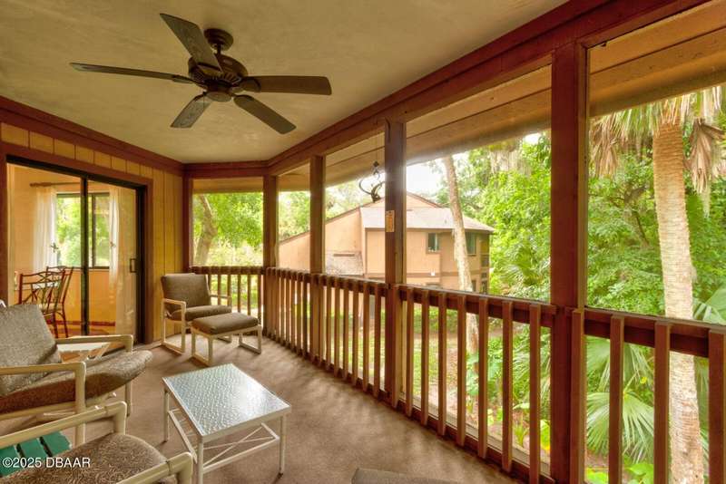 Welcome to this cozy furnished or can be sold unfurnished 2-bedroom, 2-bath second-story end unit condo, nestled beneath a stunning canopy of mature oak trees. This condominium community, Fairways, is a peaceful retreat that offers privacy, nature, and convenience all in one. The primary suite offers comfortable and privacy, while the second bedroom is ideal for guests or a home office. Two full bathrooms add to the functionality of the space. An automatic chairlift is included, providing easy access up the stepped stairway-ideal for those seeking added convenience and mobility. Please note Seller will remove chairlift if needed. The screened porch is accessible from the dining area, living room, and primary bedroom, offering multiple ways to enjoy indoor-outdoor living. The Fairways community amenities include heated and screened community pool & sauna, clubhouse, game room, library & full kitchen, tennis courts. Located just 5 minutes from the beach and close to shopping and dining. You have easy access to Daytona Beach, St. Augustine, Jacksonville and Orlando. Condo fees include water & trash, assigned parking, plenty of visitor parking. Association approval is required upon purchase & rentals. 30-day minimum rental period. Whether you're seeking a full-time residence, vacation home, or investment property, this condo is waiting for you.
