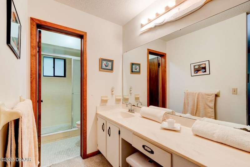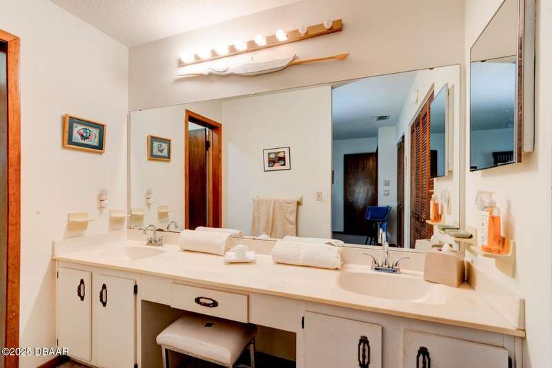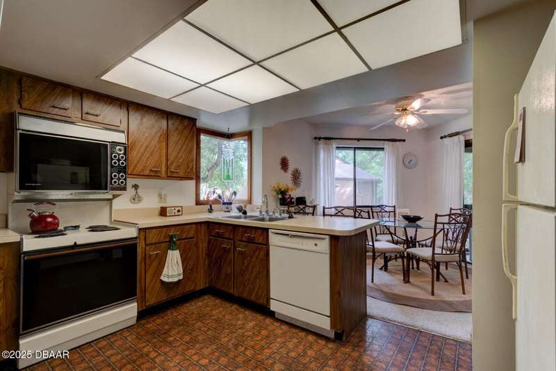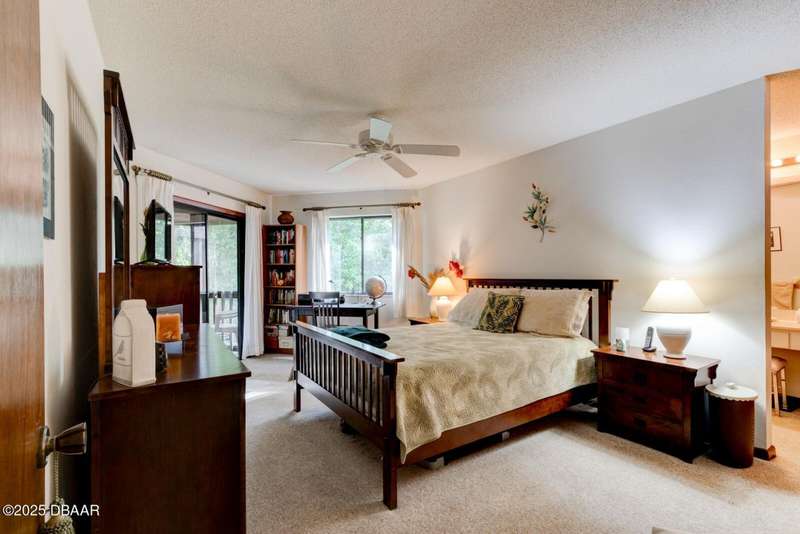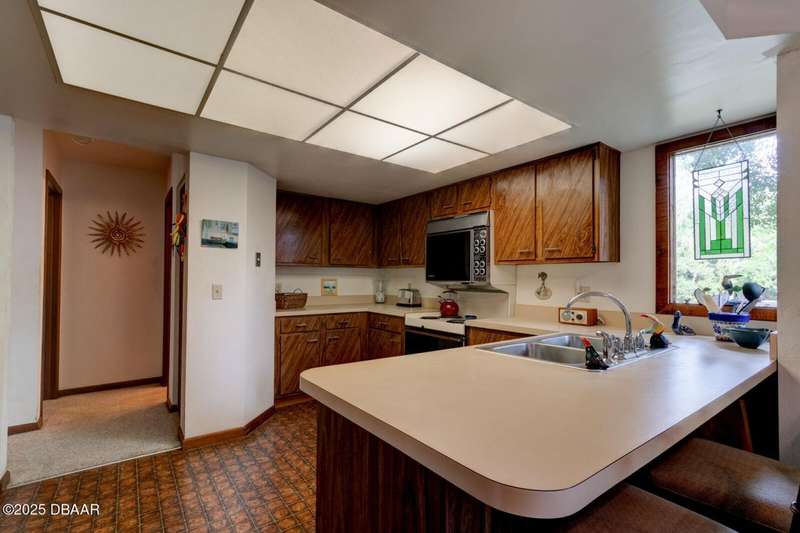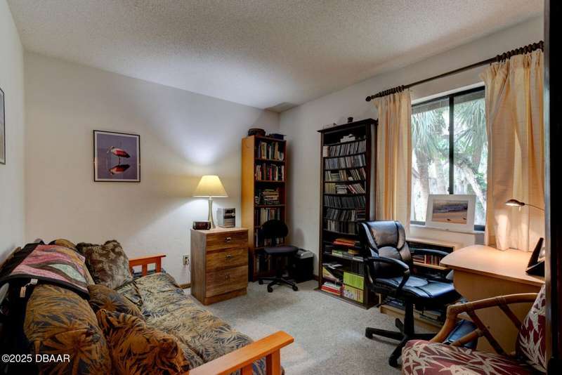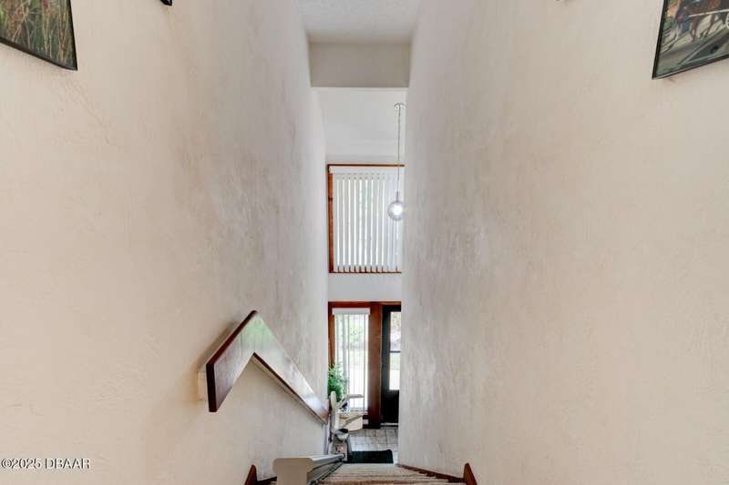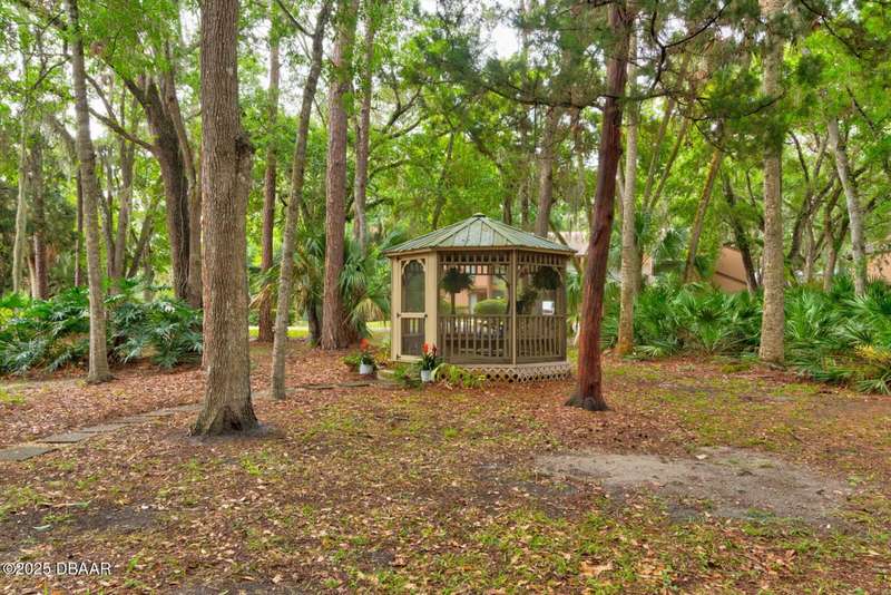 Welcome to this cozy furnished or can be sold unfurnished 2-bedroom, 2-bath second-story end unit condo, nestled beneath a stunning canopy of mature oak trees. This condominium community, Fairways, is a peaceful retreat that offers privacy, nature, and convenience all in one. The primary suite offers comfortable and privacy, while the second bedroom is ideal for guests or a home office. Two full bathrooms add to the functionality of the space. An automatic chairlift is included, providing easy access up the stepped stairway-ideal for those seeking added convenience and mobility. Please note Seller will remove chairlift if needed. The screened porch is accessible from the dining area, living room, and primary bedroom, offering multiple ways to enjoy indoor-outdoor living. The Fairways community amenities include heated and screened community pool & sauna, clubhouse, game room, library & full kitchen, tennis courts. Located just 5 minutes from the beach and close to shopping and dining. You have easy access to Daytona Beach, St. Augustine, Jacksonville and Orlando. Condo fees include water & trash, assigned parking, plenty of visitor parking. Association approval is required upon purchase & rentals. 30-day minimum rental period. Whether you're seeking a full-time residence, vacation home, or investment property, this condo is waiting for you.