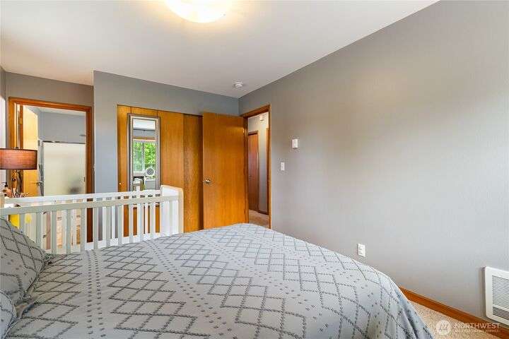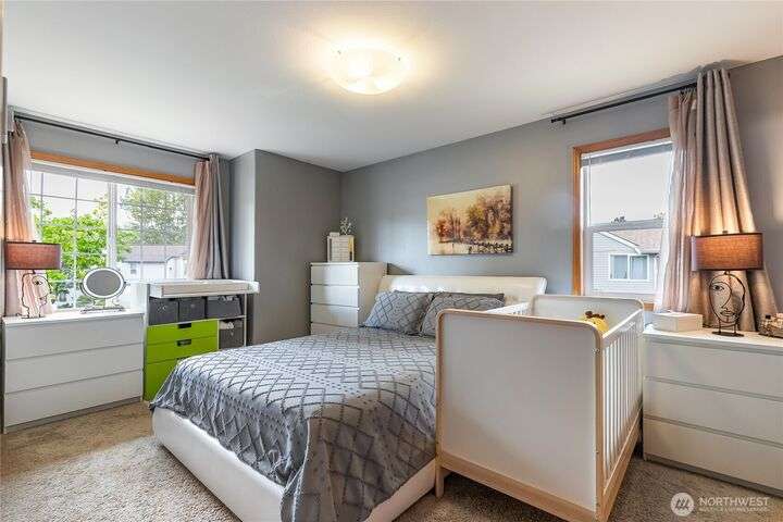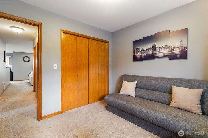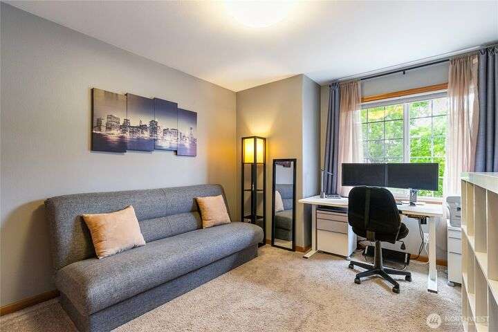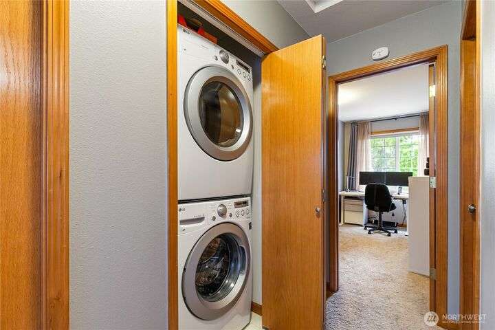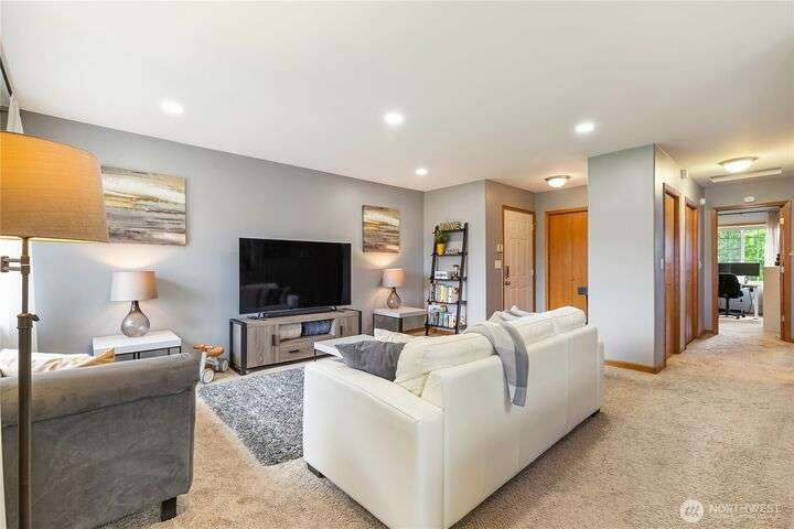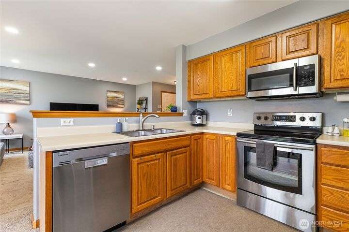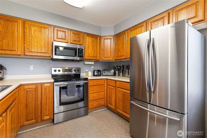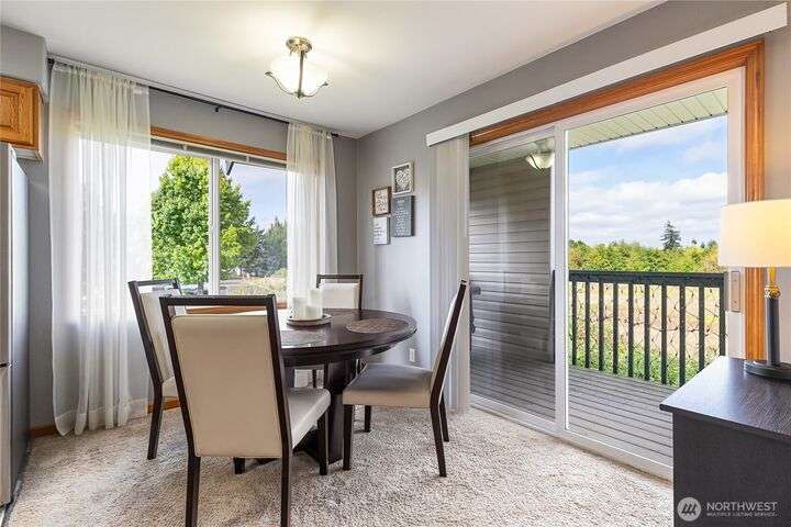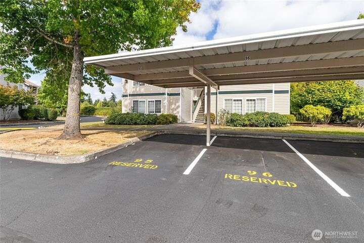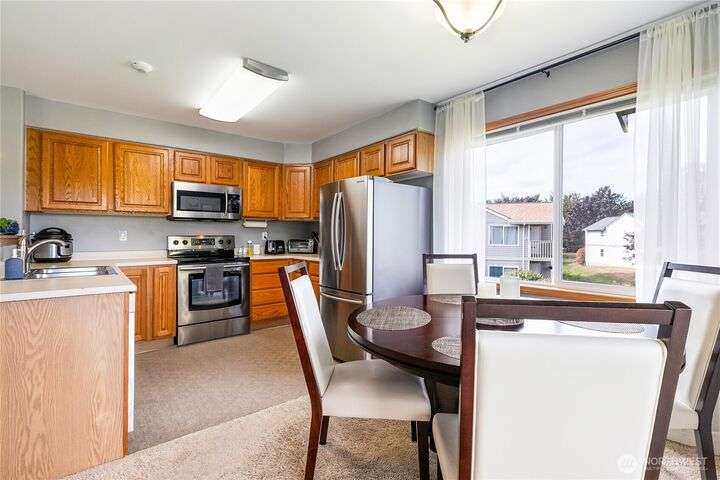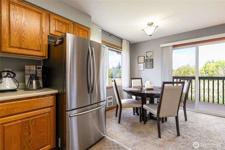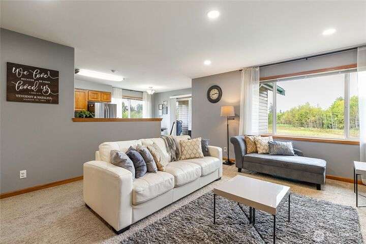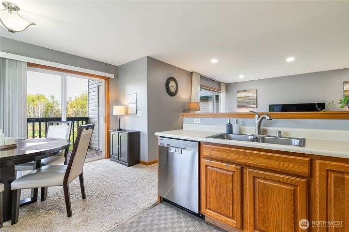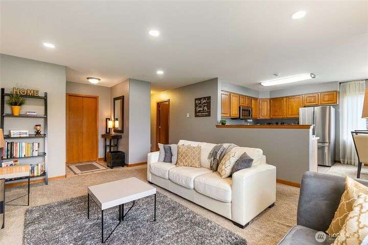 Come explore this meticulously maintained top-floor condo in the desirable Fir Ridge 1 community, offering a serene backdrop to the green space. This end-unit features an open layout, flooded with natural light that creates a warm and inviting atmosphere throughout. The home boasts stylish paint tones, custom installed recessed lighting, sleek stainless steel appliances, and a convenient stackable front-load washer/dryer. Enjoy the added benefits of assigned covered parking, central vac, and a private covered deck with a spacious storage area. This pet-friendly unit allows up to two indoor cats and/or dogs. Situated in a prime Cordata location, you'll be just minutes away from Cordata park, I-5, bus lines, Costco, Trader Joe's, and more.