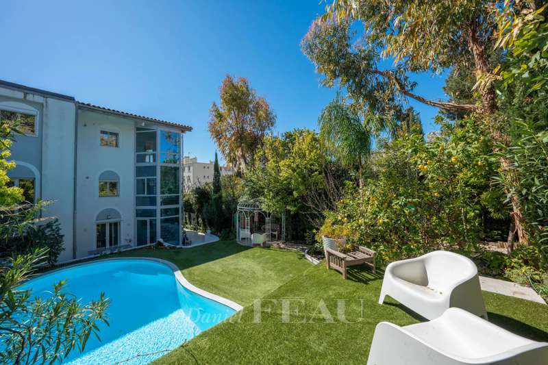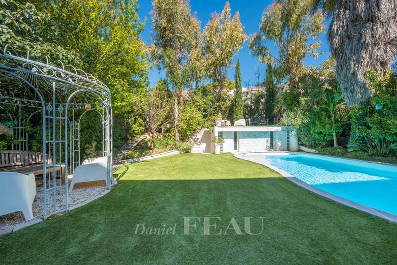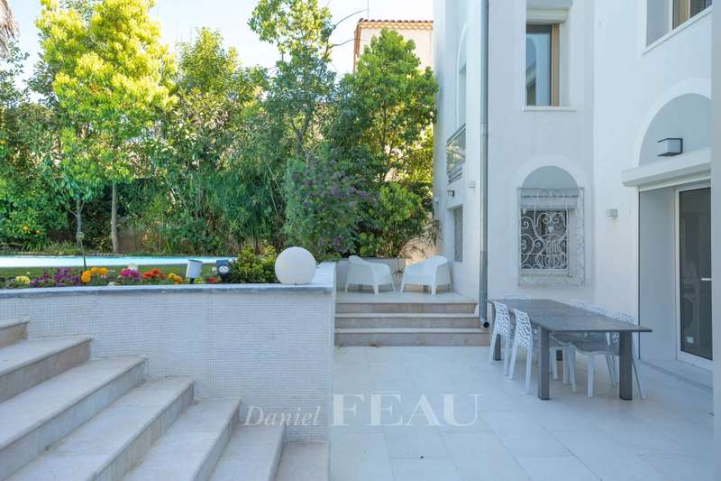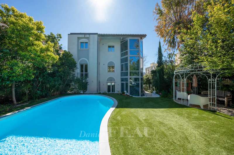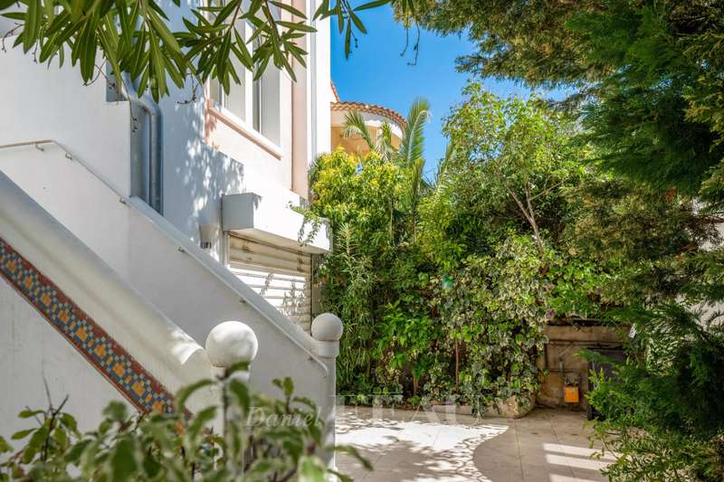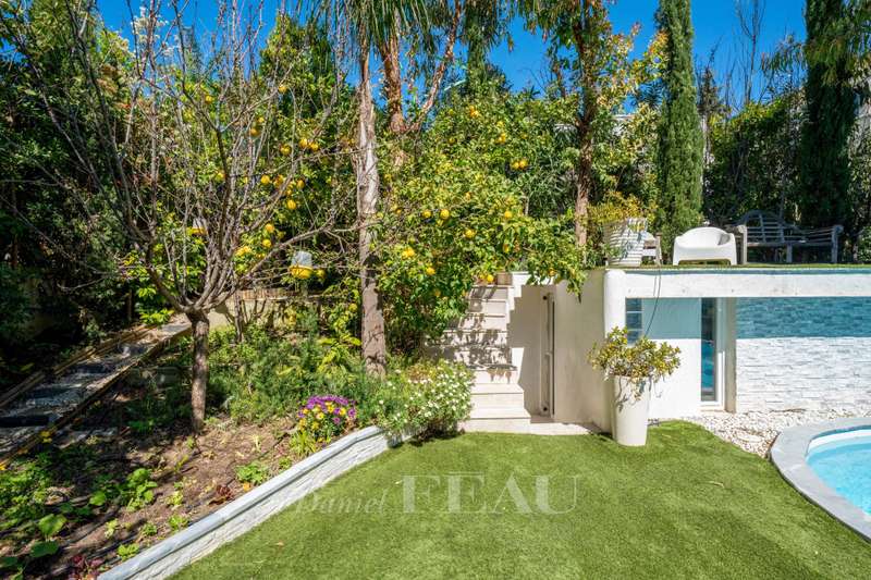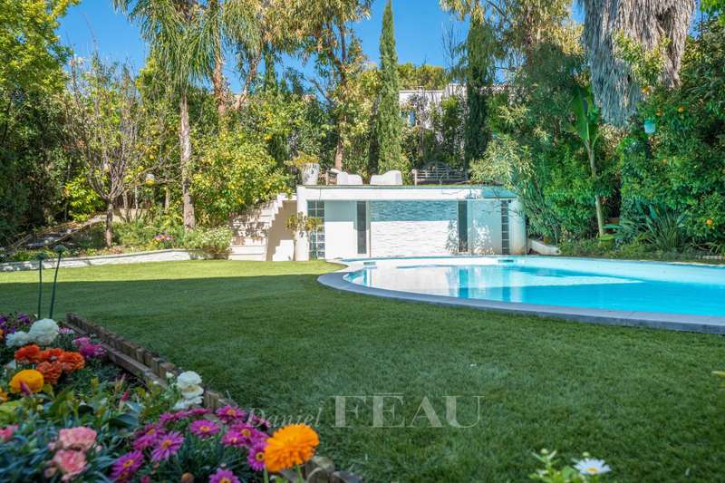 This peaceful mid 20th century property is in a sought-after and secure residence in the immediate vicinity of the sea. Set in a leafy 550 sqm plot with a heated swimming pool, it offers about 270 sqm of renovated living space including a living/reception room opening onto a terrace, a semi open-plan kitchen, and a bedroom with a shower room and a dressing room. The lower floor comprises four bedrooms including a suite, a shower room and a library. Accessed from both the inside and outside, the garden level includes a sitting room, two further bedrooms, a shower room and a summer kitchen. The property is equipped with a lift, home automation and a security system. With a garage and parking spaces.