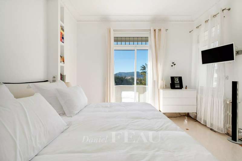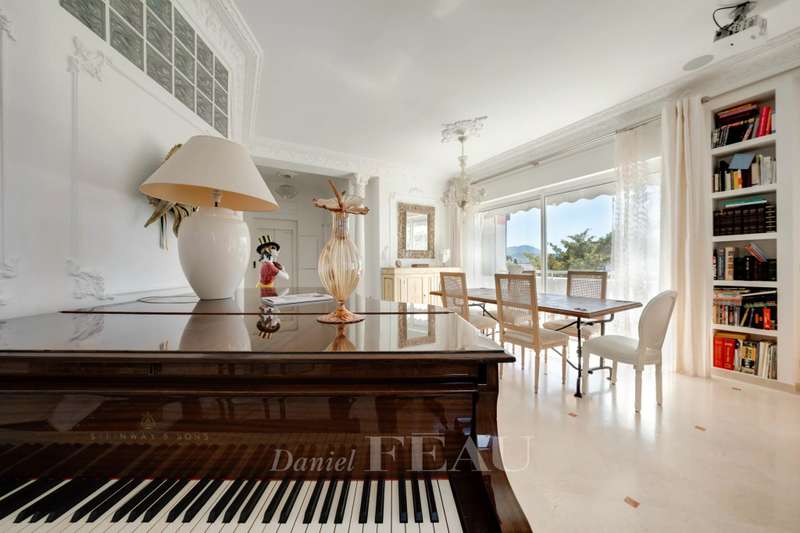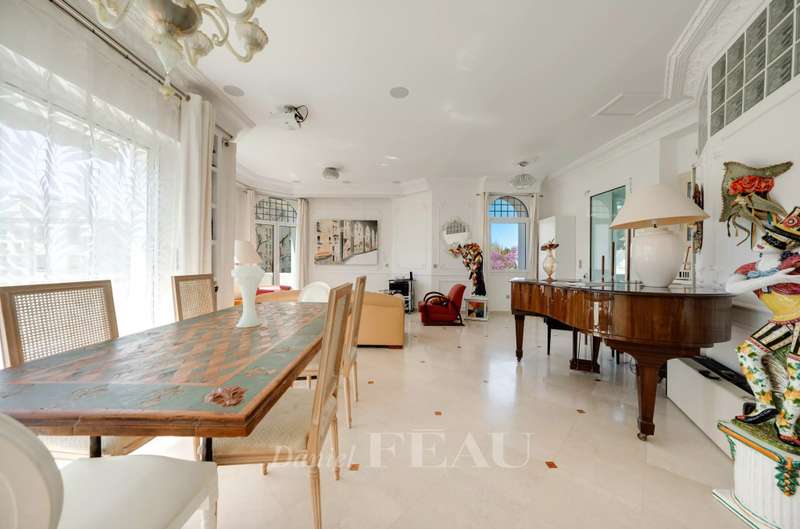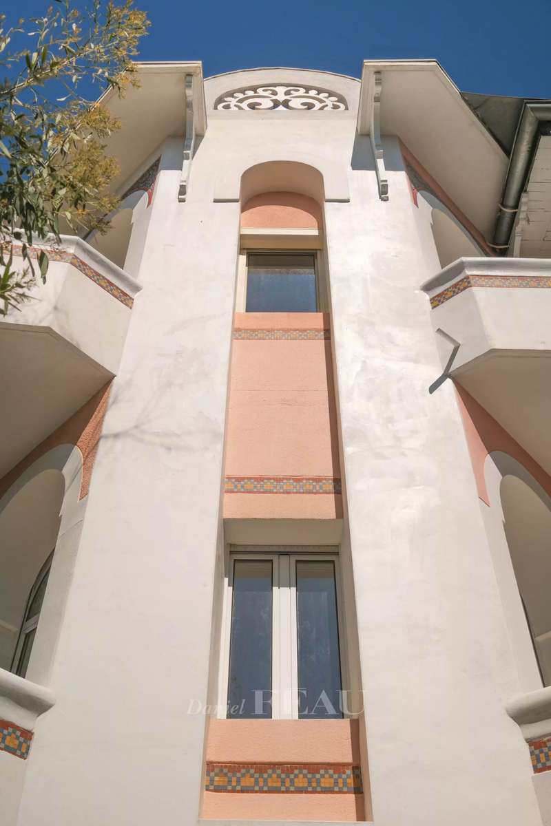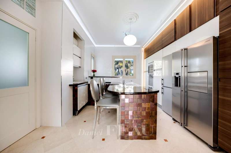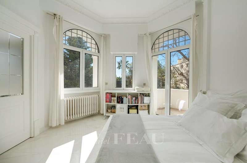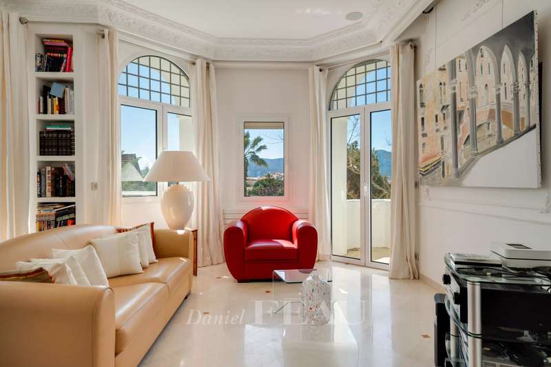 This peaceful mid 20th century property is in a sought-after and secure residence in the immediate vicinity of the sea. Set in a leafy 550 sqm plot with a heated swimming pool, it offers about 270 sqm of renovated living space including a living/reception room opening onto a terrace, a semi open-plan kitchen, and a bedroom with a shower room and a dressing room. The lower floor comprises four bedrooms including a suite, a shower room and a library. Accessed from both the inside and outside, the garden level includes a sitting room, two further bedrooms, a shower room and a summer kitchen. The property is equipped with a lift, home automation and a security system. With a garage and parking spaces.