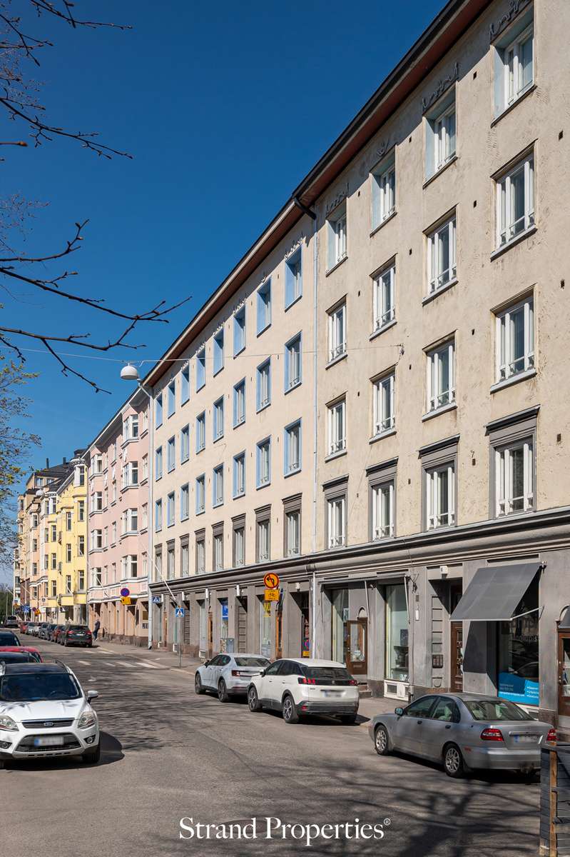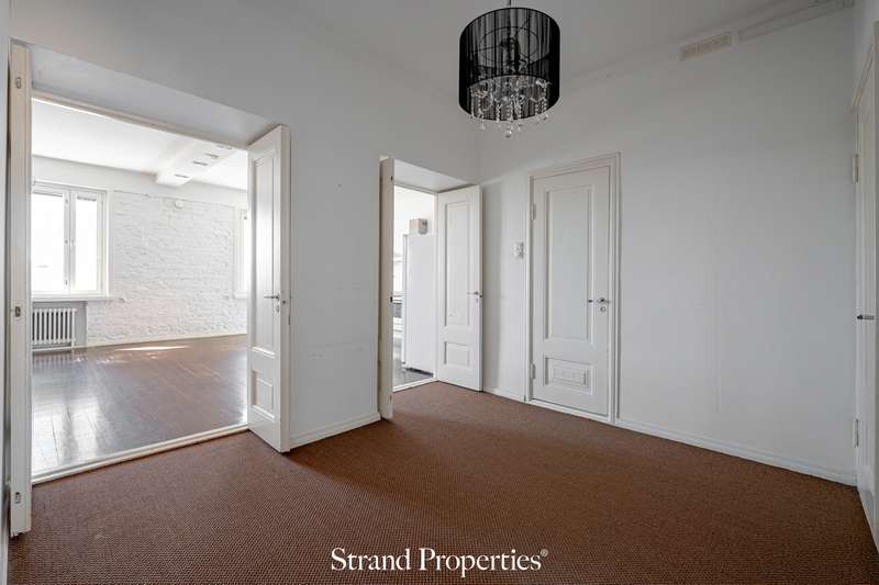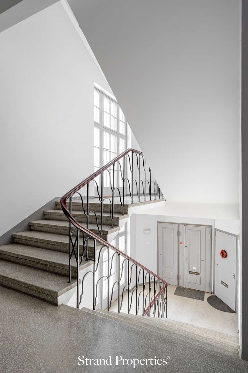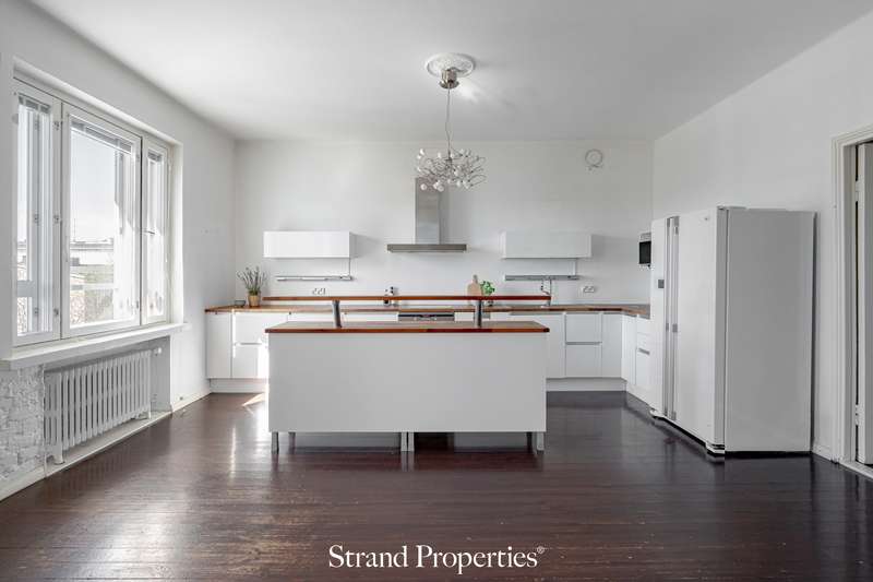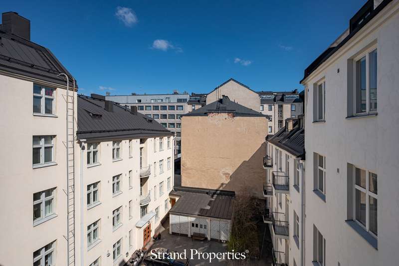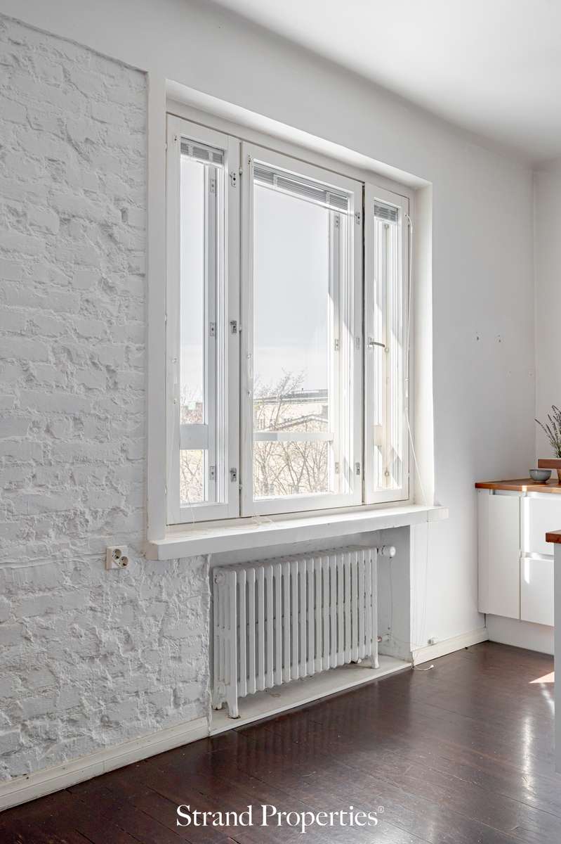 Valoisa ja avara läpitalon huoneisto huippusijainnilla Tervetuloa ihastumaan tähän 5. kerroksen asuntoon, jonka sisustuksessa uusi ja vanha yhdistyvät luontevasti. Kaunis, tummaksi petsattu lautalattia, syvät ikkunalaudat ja alkuperäiset väliovet luovat kodikkaan tunnelman ja selkeälinjainen Puustellin avokeittiö saarekkeineen sekä olohuoneen tiilinen tehosteseinä tuovat tilaan modernia twistiä. Huoneisto on läpikäynyt mittavan remontin vuonna 2007-08, jolloin mm. keittiö siirrettiin olohuoneen yhteyteen ja kylpyhuonetta laajennettiin. Makuuhuoneet sijaitsevat rauhallisen sisäpihan puolella ja päämakuuhuoneeseen luo tunnelmaa kaunis erkkeri-ikkuna ja tilava, seinän levyinen liukuovikaapisto tarjoaa paljon säilytystilaa. Pienempi makuuhuoneista on palautettavissa kahdeksi erilliseksi huoneeksi väliseinällä - tilaan on jo valmiina kaksi oviaukkoa. Kylpyhuoneessa on kaksi pesuallasta ja runsaasti tilaa hoitaa aamuaskareita sekä pyykkihuoltoa.